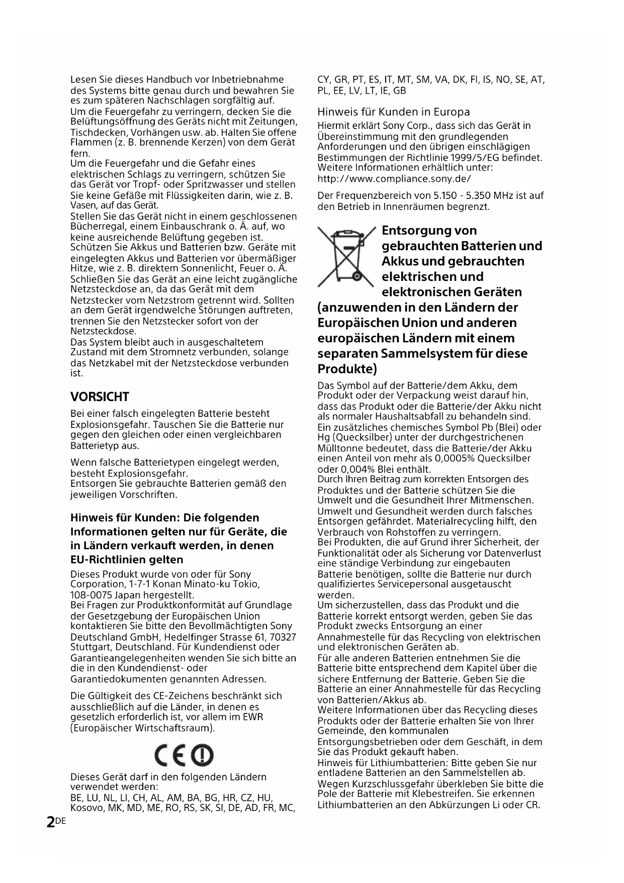 Hiermit erklart Sony Corp., dass sich das Gerät in Übereinstimmung mit den grundlegenden Anforderungen und den übrigen einschlagigen Bestimmungen der Richtlinie 1999/5/EG befindet. Weitere Informationen erhältlich unter: http://www.compliance.sony.de/