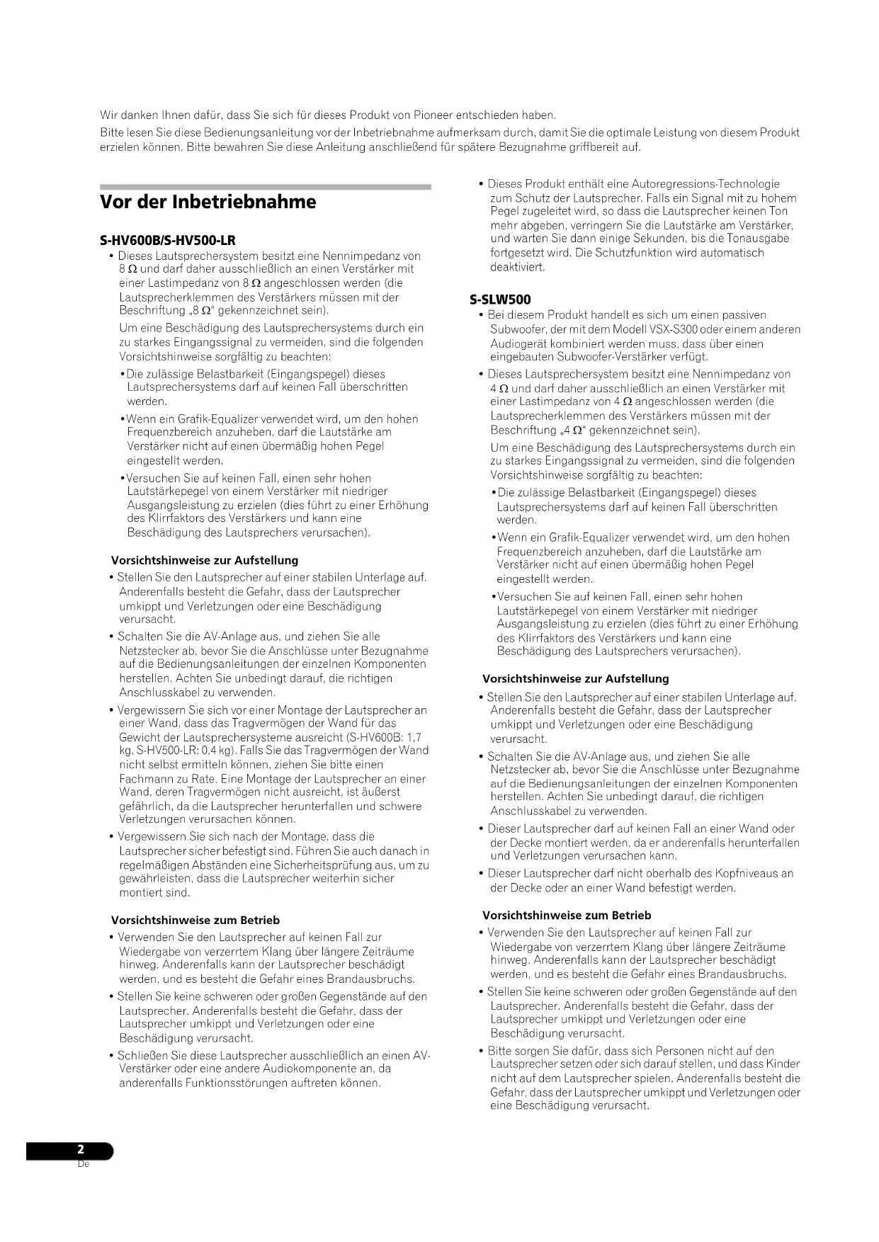 Wir danken Ihnen dafür, dass Sie sich für dieses Produkt von Pioneer entschieden haben. Bitte lesen Sie diese Bedienungsanleitung vor der Inbetriebnahme aufmerksam durch, damit Sie die optimale Leistung von diesem Produkt erzielen können. Bitte bewahren Sie diese Anleitung anschließend für spätere Bezugnahme griffbereit auf. Vor der Inbetriebnahme S-HV600B/S-HV500-LR