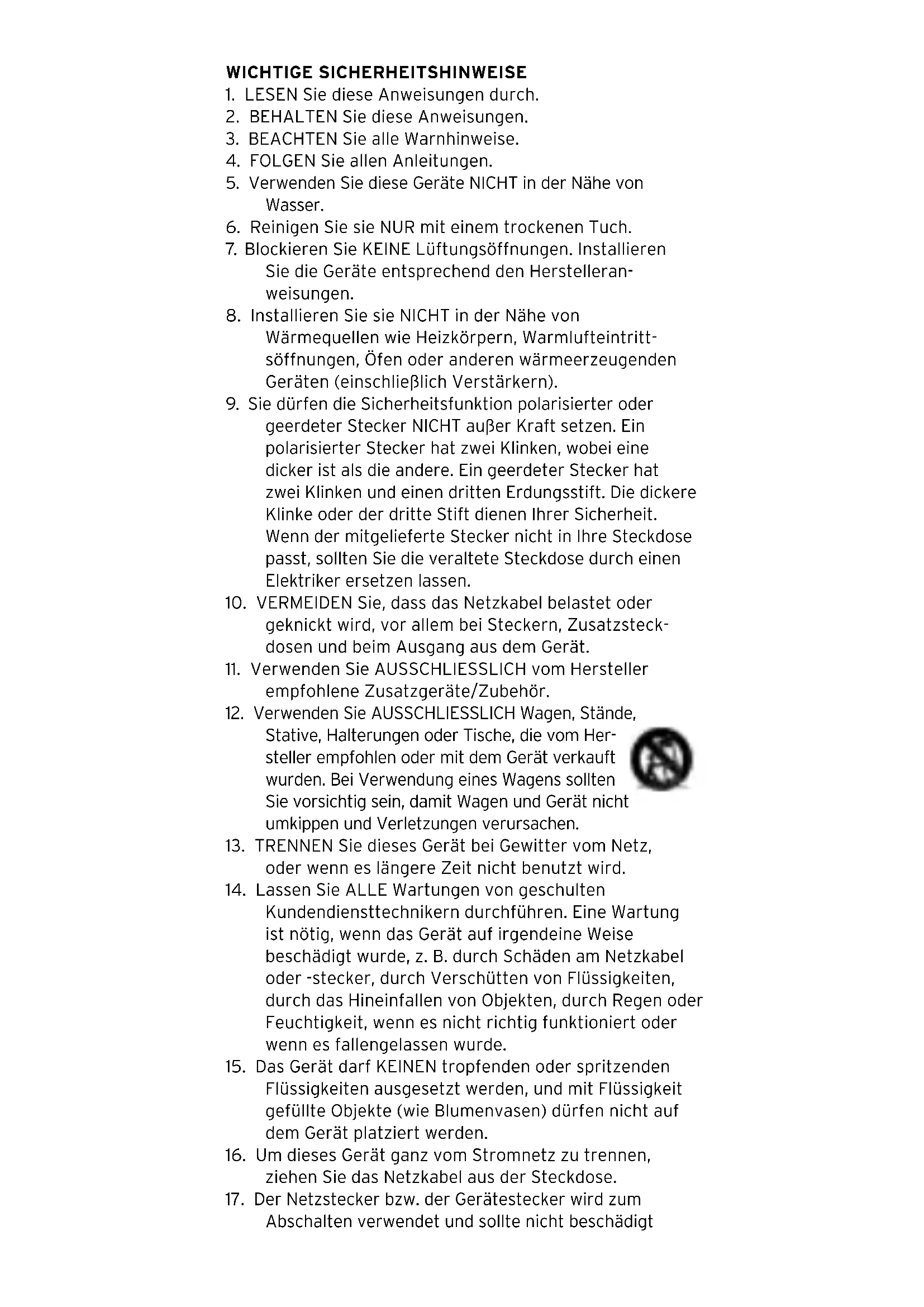 Stative, Halterungen oder Tische, die vom Her- steller empfohlen oder mit dem Gerät verkauft wurden. Bei Verwendung eines Wagens sollten Sie vorsichtig sein, damit Wagen und Gerät nicht umkippen und Verletzungen verursachen.