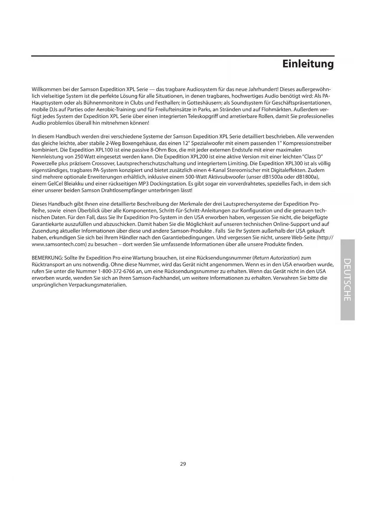 Dieses Handbuch gibt Ohnen eine detailierte Beschreibung der Merkmale der drei Lautsprechersysteme der Expedition Pro-Reihe, sowie einen Überblick über alle Komponenten, Schritt-für-Schritt-Anleitungen zur Konfiguration und die genauen technischen Daten. Für den Fall, dass Sie Ihr Expedition Pro-System in den USA erworben haben, vergessen Sie nicht, die beigefügte Garantiekarte auszufüssen und abzuschicken. Damit haben Sie die Möglichkeit auf unseren technischen Online-Support und auf Zusammenhang aktueller Informationen über diese und andere Samson-Produkte. Falls Sie Ihr System außerhalb der USA gkauft haben, erkundigen Sie sich bei ihrem Handlner nach den Garantiebedingungen. Und vergessen Sie nicht, unsere Web-Seite (http://www.samsontech.com) zu besuchen - Dort werden Sie umfassende Informationen über alle unsere Produkte finden.