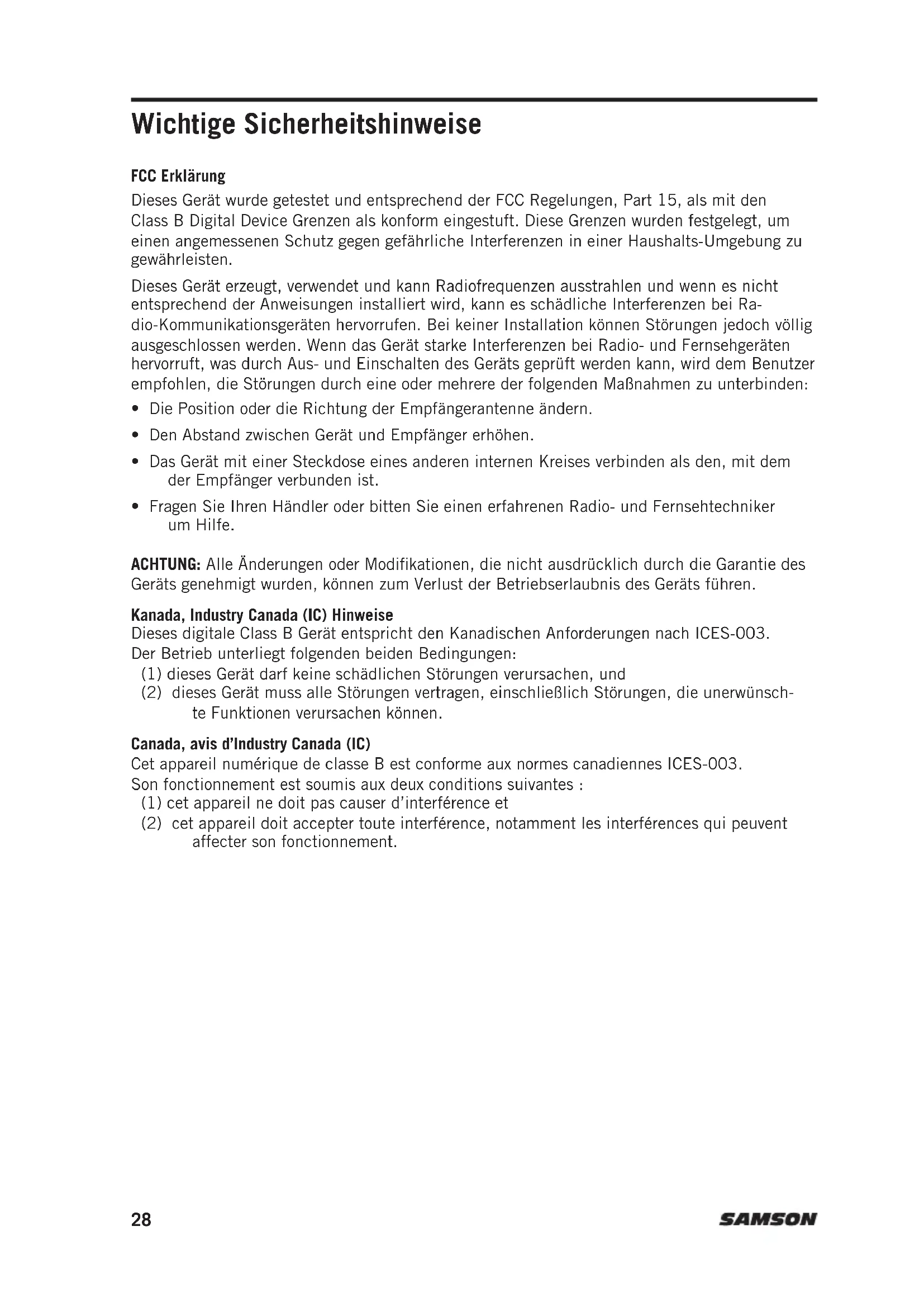 - Fragen Sie Ihren Händler oder bitten Sie einen erfahrenen Radio- und Fernsehtechniker um Hilfe. ACHTUNG: Alle Änderungen oder Modifikationen, die nicht ausdrücklich durch die Garantie des Geräts genehmigt wurden, können zum Verlust der Betriebserlaubnis des Geräts führen. Kanada, Industry Canada (IC) Hinweise Dieses digitale Class B Gerät entspricht den Kanadischen Anforderungen nach ICES-003. Der Betrieb unterliegt folgenden beiden Bedingungen: (1) dieses Gerät darf keine schädlichen Störungen verursachen, und (2) dieses Gerät muss alle Störungen vertragen, einschließlich Störungen, die unerwünsch- te Funktionen verursachen können. Canada, avis d’Industry Canada (IC) Cet appareil numérique de classe B est conforme aux normes canadiennes ICES-003. Son fonctionnement est soumis aux deux conditions suivantes : (1) cet appareil ne doit pas causer d’interférence et (2) cet appareil doit accepter toute interférence, notamment les interférences qui peuvent affecter son fonctionnement. 28ENGLISH