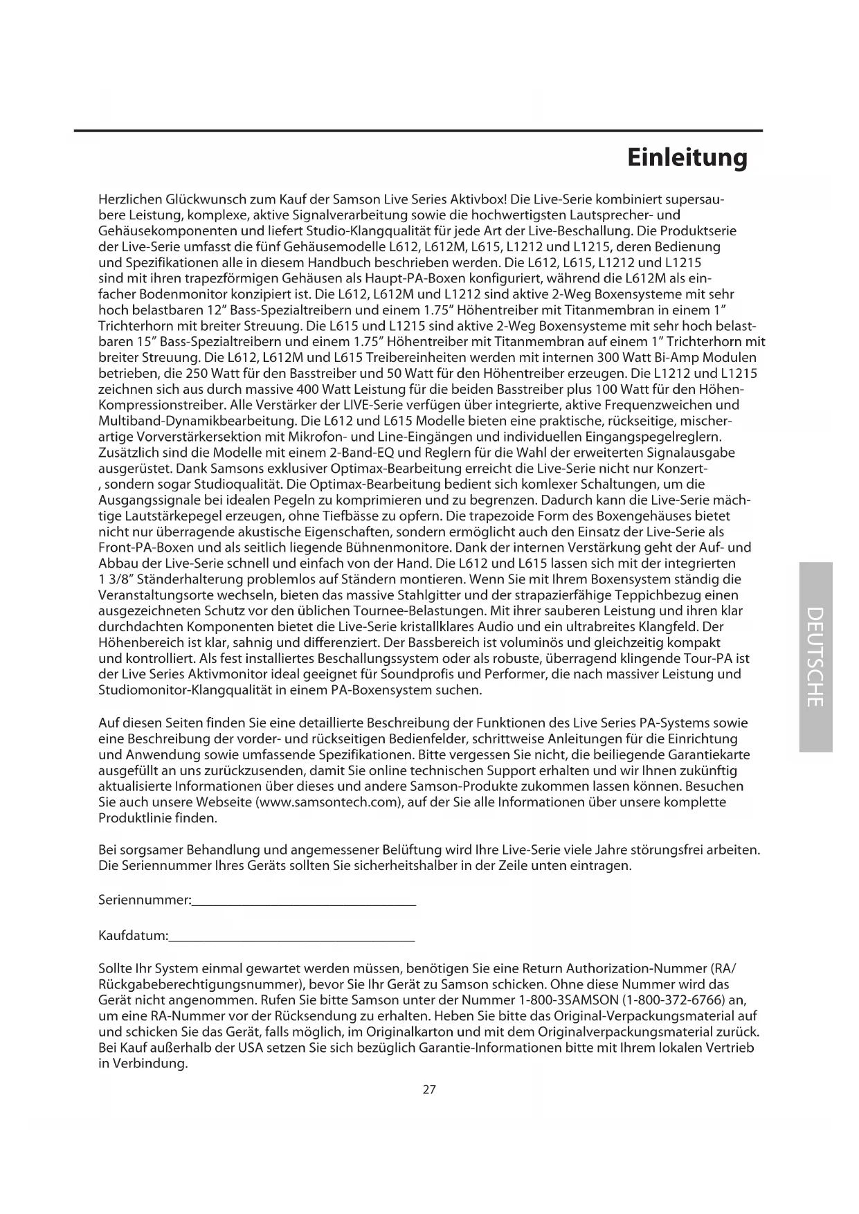 Auf diesen Seiten finden Sie eine detailierte Beschreibung der Funktionen des Live Series PA-Systems sowie eine Beschreibung der vorder- und rückseitigen Bedienfelder, schrittweise Anleitungen für die Einrichtung und Anwendung sowie umfassende Spezifikationen.itte vergessen Sie nicht, die beiliegende Garantiekarte ausgefüllt an uns zurückzusenden, damit Sie online technischen Support erhalten und wir Ihnen zukünftigactualisierte Informationen über这点es und andere Samson-Produkte zukommen halten können. Besuchen Sie auch unsere Webseite (www.samsontech.com), auf der Sie alle Informationen über unsere komplette Produktlinie finden.