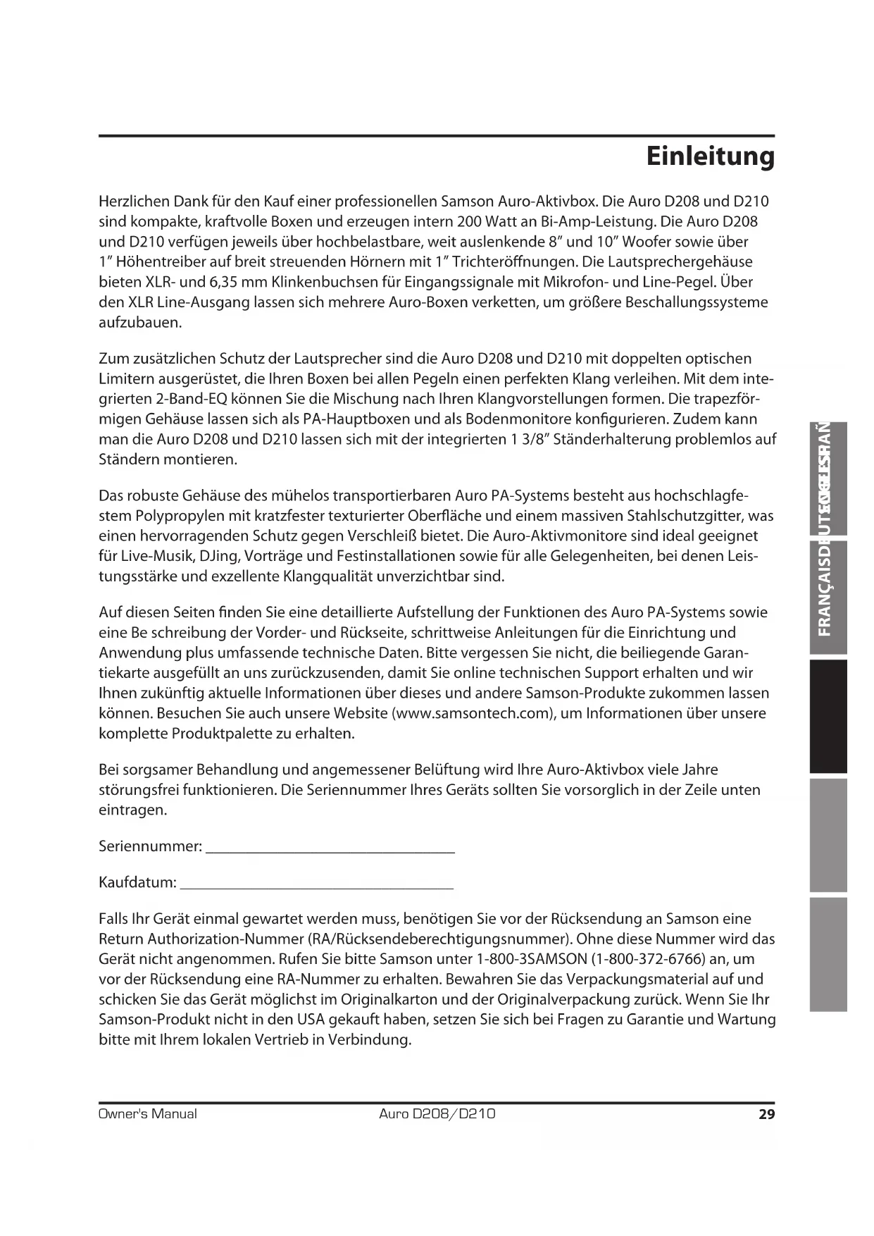 Auf diesen Seiten finden Sie eine detaillierte Aufstellung der Funktionen des Auro PA-Systems sowie eine Be schreibung der Vorder- und Rückseite, schrittweise Anleitungen für die Einrichtung und Anwendung plus umfassende technische Daten.itte vergessen Sie nicht, die beiliegende Garantiekarte ausgefüllt an uns zurückzusenden, damit Sie online technischen Support erhalten und wir ihren zukünftig aktuelle Informationen über these und andere Samson-Produkte zukommen halten können. Besuchen Sie auch unsere Website (www.samsontech.com), um Informationen über unsere komplette Produktpalette zu erhalten.