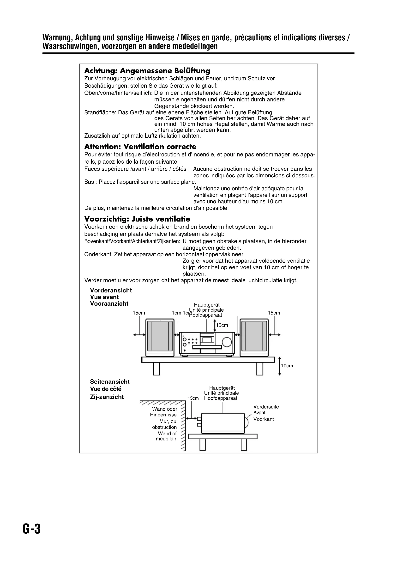 - AANGEBRACHT. Warnung, Achtung und sonstige Hinweise / Mises en garde, précautions et indications diverses / Waarschuwingen, voorzorgen en andere mededelingen EXA1[E]-00Cov2.fm Page 2 Wednesday, December 24, 2003 3:41 PMG-3 Achtung: Angemessene Belüftung Zur Vorbeugung vor elektrischen Schlägen und Feuer, und zum Schutz vorBeschädigungen, stellen Sie das Gerät wie folgt auf:Oben/vorne/hinten/seitlich: Die in der untenstehenden Abbildung gezeigten Abstände müssen eingehalten und dürfen nicht durch andere Gegenstände blockiert werden.Standfläche: Das Gerät auf eine ebene Fläche stellen. Auf gute Belüftung des Geräts von allen Seiten her achten. Das Gerät daher auf ein mind. 10 cm hohes Regal stellen, damit Wärme auch nach unten abgeführt werden kann. Zusätzlich auf optimale Luftzirkulation achten. Attention: Ventilation correcte Pour éviter tout risque d’électrocution et d’incendie, et pour ne pas endommager les appa-reils, placez-les de la façon suivante:Faces supérieure /avant / arrière / côtés : Aucune obstruction ne doit se trouver dans les zones indiquées par les dimensions ci-dessous.Bas : Placez l’appareil sur une surface plane. Maintenez une entrée d’air adéquate pour la ventilation en plaçant l’appareil sur un support avec une hauteur d’au moins 10 cm. De plus, maintenez la meilleure circulation d’air possible. Voorzichtig: Juiste ventilatie Voorkom een elektrische schok en brand en bescherm het systeem tegenbeschadiging en plaats derhalve het systeem als volgt:Bovenkant/Voorkant/Achterkant/Zijkanten:U moet geen obstakels plaatsen, in de hieronder aangegeven gebieden.Onderkant: Zet het apparaat op een horizontaal oppervlak neer. Zorg er voor dat het apparaat voldoende ventilatie krijgt, door het op een voet van 10 cm of hoger te plaatsen. Verder moet u er voor zorgen dat het apparaat de meest ideale luchtcirculatie krijgt.1cm 1cm 15cm 15cm 10cm 15cm Vorderansicht Vue avant Vooraanzicht HauptgerätUnité principaleHoofdapparaat 15cm Wand oderHindernisseMur, ouobstructionWand ofmeubilairVorderseiteAvantVoorkantHauptgerätUnité principaleHoofdapparaat Seitenansicht Vue de côté Zij-aanzicht Warnung, Achtung und sonstige Hinweise / Mises en garde, précautions et indications diverses / Waarschuwingen, voorzorgen en andere mededelingen EXA1[E]-00Cov2.fm Page 3 Wednesday, December 24, 2003 3:41 PM1 Deutsch Einleitung Warnung, Achtung und Sonstige Hinweise