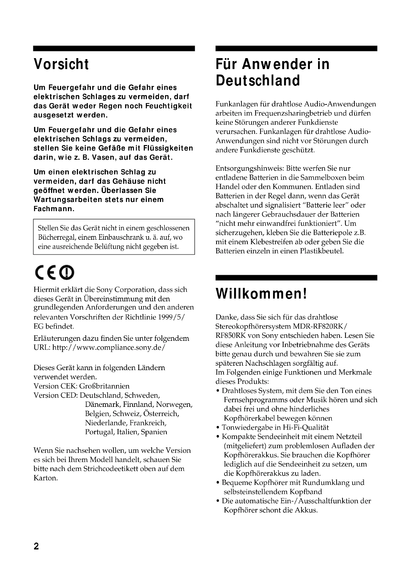 - Rechargez les piles rechargeables fournies ou, si l’indicateur POWER est toujours éteint après la recharge des piles rechargeables fournies, apportez votre casque chez un revendeur Sony pour vous procurer des piles rechargeables de rechange. Si vous raccordez le transmetteur à la prise LINE OUT ou REC OUT d’un lecteur audio, assurez-vous que le commutateur NOISE FILTER est réglé sur OFF.2 Vorsicht Um Feuergefahr und die Gefahr eines elektrischen Schlages zu vermeiden, darf das Gerät weder Regen noch Feuchtigkeit ausgesetzt werden. Um Feuergefahr und die Gefahr eines elektrischen Schlags zu vermeiden, stellen Sie keine Gefäße mit Flüssigkeiten darin, wie z. B. Vasen, auf das Gerät. Um einen elektrischen Schlag zu vermeiden, darf das Gehäuse nicht geöffnet werden. Überlassen Sie Wartungsarbeiten stets nur einem Fachmann. Stellen Sie das Gerät nicht in einem geschlossenen Bücherregal, einem Einbauschrank u. ä. auf, wo eine ausreichende Belüftung nicht gegeben ist. Hiermit erklärt die Sony Corporation, dass sich dieses Gerät in Übereinstimmung mit den grundlegenden Anforderungen und den anderen relevanten Vorschriften der Richtlinie 1999/5/ EG befindet. Erläuterungen dazu finden Sie unter folgendem URL: http://www.compliance.sony.de/ Dieses Gerät kann in folgenden Ländern verwendet werden. Version CEK: Großbritannien Version CED: Deutschland, Schweden, Dänemark, Finnland, Norwegen, Belgien, Schweiz, Österreich, Niederlande, Frankreich, Portugal, Italien, Spanien Wenn Sie nachsehen wollen, um welche Version es sich bei Ihrem Modell handelt, schauen Sie bitte nach dem Strichcodeetikett oben auf dem Karton. Für Anwender in Deutschland Funkanlagen für drahtlose Audio-Anwendungen arbeiten im Frequenzsharingbetrieb und dürfen keine Störungen anderer Funkdienste verursachen. Funkanlagen für drahtlose Audio- Anwendungen sind nicht vor Störungen durch andere Funkdienste geschützt. Entsorgungshinweis: Bitte werfen Sie nur entladene Batterien in die Sammelboxen beim Handel oder den Kommunen. Entladen sind Batterien in der Regel dann, wenn das Gerät abschaltet und signalisiert “Batterie leer” oder nach längerer Gebrauchsdauer der Batterien “nicht mehr einwandfrei funktioniert”. Um sicherzugehen, kleben Sie die Batteriepole z.B. mit einem Klebestreifen ab oder geben Sie die Batterien einzeln in einen Plastikbeutel. Willkommen! Danke, dass Sie sich für das drahtlose Stereokopfhörersystem MDR-RF820RK/ RF850RK von Sony entschieden haben. Lesen Sie diese Anleitung vor Inbetriebnahme des Geräts bitte genau durch und bewahren Sie sie zum späteren Nachschlagen sorgfältig auf. Im Folgenden einige Funktionen und Merkmale dieses Produkts: