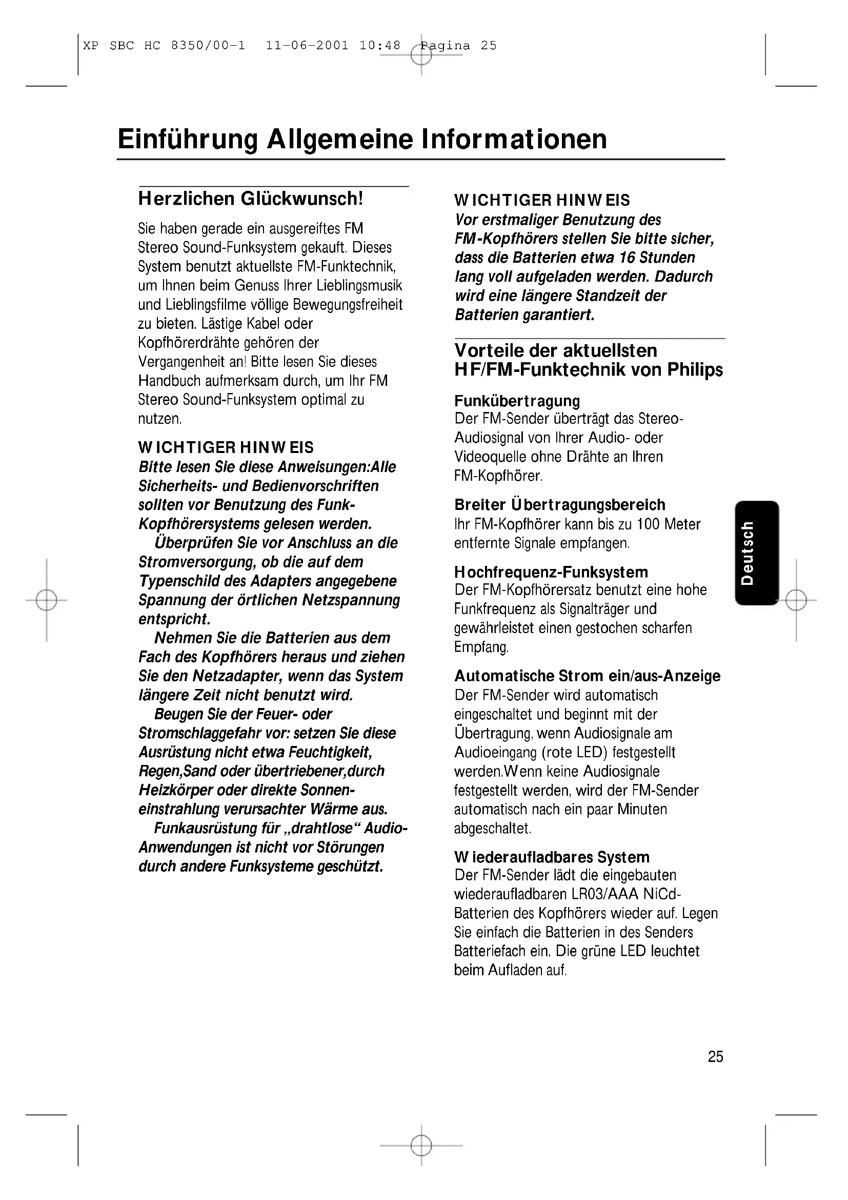 XP SBC HC 8350/00-1 11-06-2001 10:48 Pagina 2425 Deutsch Herzlichen Glückwunsch! Sie haben gerade ein ausgereiftes FM Stereo Sound-Funksystem gekauft. Dieses System benutzt aktuellste FM-Funktechnik, um Ihnen beim Genuss Ihrer Lieblingsmusik und Lieblingsfilme völlige Bewegungsfreiheit zu bieten. Lästige Kabel oder Kopfhörerdrähte gehören der Vergangenheit an! Bitte lesen Sie dieses Handbuch aufmerksam durch, um Ihr FM Stereo Sound-Funksystem optimal zu nutzen. WICHTIGER HINWEIS Bitte lesen Sie diese Anweisungen:Alle Sicherheits- und Bedienvorschriften sollten vor Benutzung des Funk- Kopfhörersystems gelesen werden. Überprüfen Sie vor Anschluss an die Stromversorgung, ob die auf dem Typenschild des Adapters angegebene Spannung der örtlichen Netzspannung entspricht. Nehmen Sie die Batterien aus dem Fach des Kopfhörers heraus und ziehen Sie den Netzadapter, wenn das System längere Zeit nicht benutzt wird. Beugen Sie der Feuer- oder Stromschlaggefahr vor: setzen Sie diese Ausrüstung nicht etwa Feuchtigkeit, Regen,Sand oder übertriebener,durch Heizkörper oder direkte Sonnen- einstrahlung verursachter Wärme aus. Funkausrüstung für „drahtlose“ Audio- Anwendungen ist nicht vor Störungen durch andere Funksysteme geschützt. WICHTIGER HINWEIS Vor erstmaliger Benutzung des FM-Kopfhörers stellen Sie bitte sicher, dass die Batterien etwa 16 Stunden lang voll aufgeladen werden. Dadurch wird eine längere Standzeit der Batterien garantiert. Vorteile der aktuellsten HF/FM-Funktechnik von Philips Funkübertragung Der FM-Sender überträgt das Stereo- Audiosignal von Ihrer Audio- oder Videoquelle ohne Drähte an Ihren FM-Kopfhörer. Breiter Übertragungsbereich Ihr FM-Kopfhörer kann bis zu 100 Meter entfernte Signale empfangen. Hochfrequenz-Funksystem Der FM-Kopfhörersatz benutzt eine hohe Funkfrequenz als Signalträger und gewährleistet einen gestochen scharfen Empfang. Automatische Strom ein/aus-Anzeige Der FM-Sender wird automatisch eingeschaltet und beginnt mit der Übertragung, wenn Audiosignale am Audioeingang (rote LED) festgestellt werden.Wenn keine Audiosignale festgestellt werden, wird der FM-Sender automatisch nach ein paar Minuten abgeschaltet. Wiederaufladbares System Der FM-Sender lädt die eingebauten wiederaufladbaren LR03/AAA NiCd- Batterien des Kopfhörers wieder auf. Legen Sie einfach die Batterien in des Senders Batteriefach ein. Die grüne LED leuchtet beim Aufladen auf. Einführung Allgemeine Informationen XP SBC HC 8350/00-1 11-06-2001 10:48 Pagina 25Einfache Übertragung Der FM-Kopfhörer kann Signale vom Sender empfangen, selbst durch Hindernisse wie Türen,Wände und Fenster. Mehrere Kopfhörer mit einem Sender Weitere Kopfhörer und/oder Funklautsprecher können mit einem einzigen Sender benutzt werden, wenn sie: - im 864 MHz-Bereich arbeiten - einen 19 kHz-Kontrollton erkennen können. Bestätigung der Kompatibilität siehe gerätespezifische Elektrodatenblätter. Inhalt des Satzes Dieses FM-Kopfhörersystem besteht aus folgendem Zubehör: 1 x FM-Sender SBC HC8352 1 x FM-Kopfhörer SBC HC8355 1 x SBC CS030/00: 12 Volt/200 mA AC/DC-Adapter 2 x wiederaufladbaren Batterien LR03/AAA (NiCd), 550 mAh 1 x Stecker 3,5 mm / Stereoadapterstecker 6,3 mm 1 x Antennenröhre Sender (Abbildung 1) 1 Wiederaufladeanzeige – die grüne LED leuchtet beim Wiederaufladen.Völlig erschöpfte Batterien sind nach etwa 16 Stunden voll aufgeladen. 2 Stromanzeige – leuchtet auf, wenn Audio- signale am Audioeingang festgestellt werden. 3 Aufladefach – legen Sie einfach die Batterien in des Senders Batteriefach ein. Die grüne LED leuchtet beim Wiederaufladen. 4 Gleichstrom – wird an den 12 Volt/ 200 mA AC/DC-Adapter angeschlossen 5 3,5 mm Stereokopfhörer- Audioeingang – schließt Ihren FM-Sender an eine Audioquelle an 6 Kanalumschaltung – wählen Sie einen von 2 Kanälen für besten Empfang.Wir raten Ihnen, Kanal 1 als erste Option zu wählen. 7 Bedienfeld Kopfhörer (Abbildung 2) 8 Stromanzeige – leuchtet bei Benutzung auf. 9 Strom Ein/Aus – schieben Sie den Schalter in die Ein- oder Aus-Stellung, um den Kopfhörer ein-/auszuschalten. 10 Batteriefach – entfernen Sie die Ohrpolster, nehmen Sie die Batterien heraus und legen Sie sie zum Wiederaufladen in des Senders Wiederaufladefach. 11 Lautstärke – stellen Sie die Lautstärke auf den von Ihnen gewünschten Hörpegel ein. 12 Abstimmen – zum Abstimmen drehen Sie das Abstimmrädchen, bis das Signal am deutlichsten ist. Allgemeine Informationen Bedienelemente Deutsch