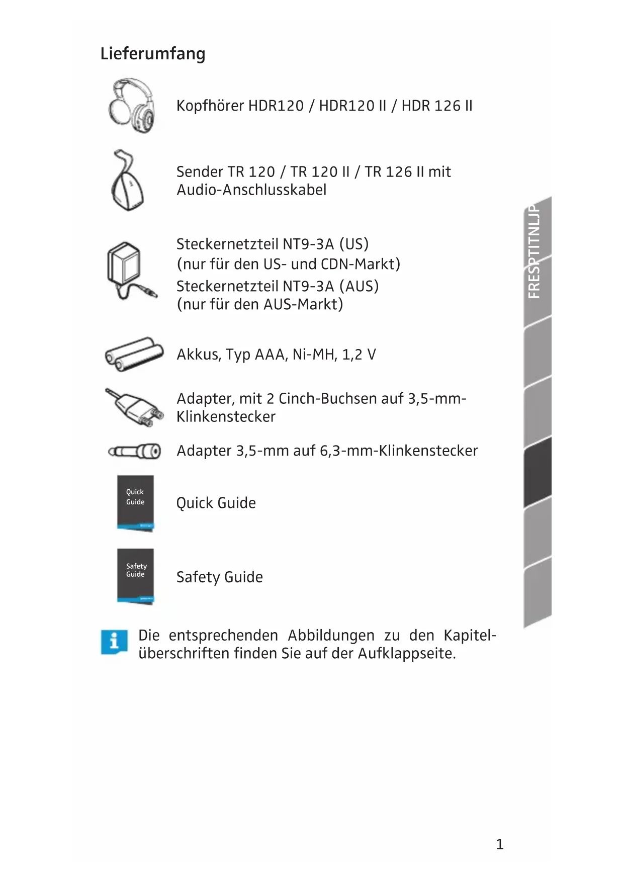 Lieferumfang Kopfhörer HDR120 / HDR120 II / HDR 126 II Sender TR 120 / TR 120 II / TR 126 II mit Audio-Anschlusskabel Steckernetzteil NT9-3A (US) (nur für den US- und CDN-Markt) Steckernetzteil NT9-3A (AUS) (nur für den AUS-Markt) Akkus, Typ AAA, Ni-MH, 1,2 V Adapter, mit 2 Cinch-Buchsen auf 3,5-mm- Klinkenstecker Adapter 3,5-mm auf 6,3-mm-Klinkenstecker Quick Guide Quick Guide Safety Guide Safety Guide Die entsprechenden Abbildungen zu den Kapitel- überschriften finden Sie auf der Aufklappseite. RS120II_RS126II_US_SP7.indb 1RS120II_RS126II_US_SP7.indb 1 01.10.2015 11:56:3001.10.2015 11:56:302 Sender für den Gebrauch vorbereiten Der Sender ist für die Wandmontage vorbereitet (Ausspa- rung auf der Rückseite des Senders). Die dazu benötigten handelsüblichen Schrauben und Dübel sind nicht im Liefer- umfang enthalten.
