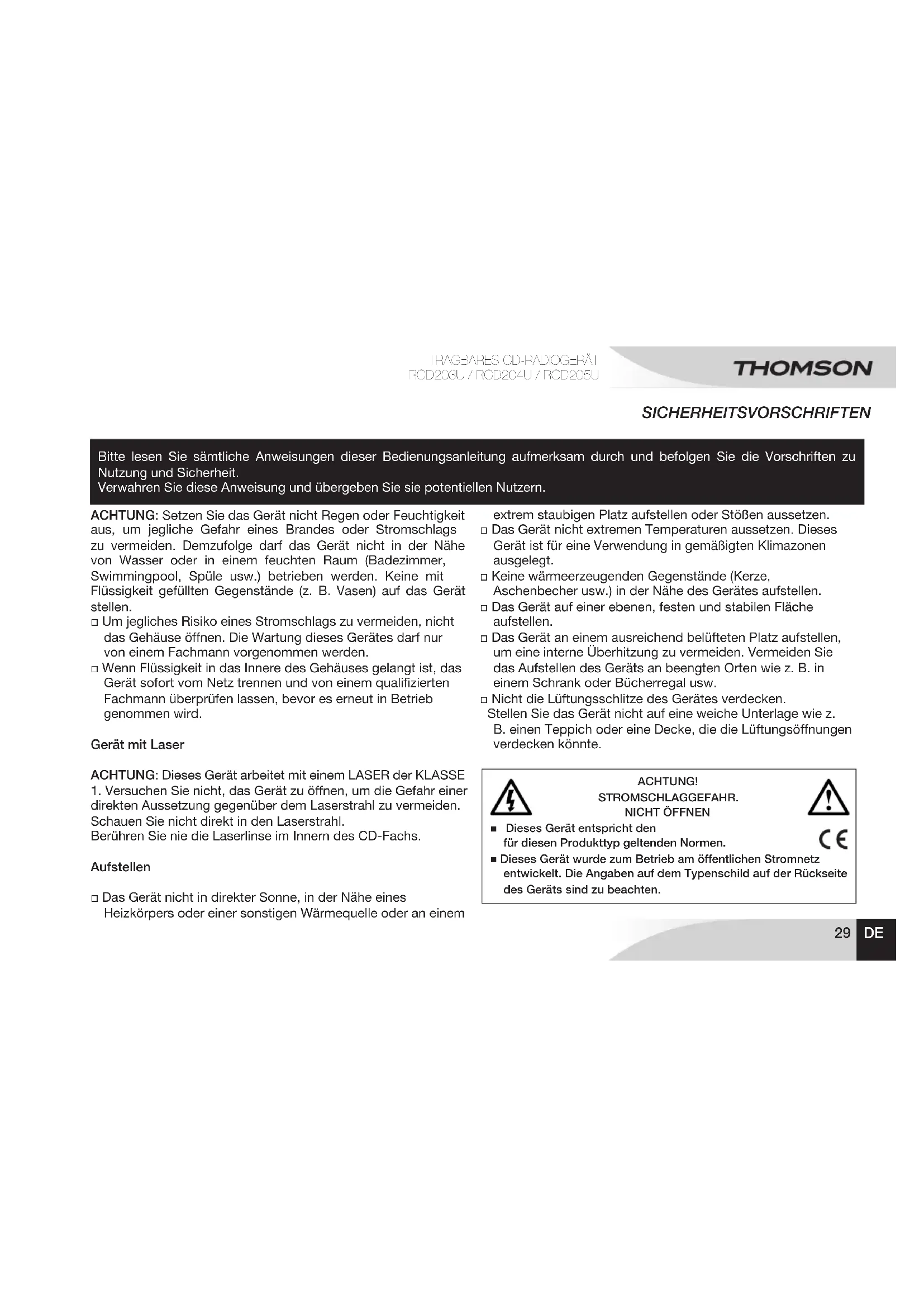 call rate according to operator www.thomsonaudiovideo.eu29 Bitte lesen Sie sämtliche Anweisungen dieser Bedienungsanleitung aufmerksam durch und befolgen Sie die Vorschriften zu Nutzung und Sicherheit. Verwahren Sie diese Anweisung und übergeben Sie sie potentiellen Nutzern. SICHERHEITSVORSCHRIFTEN ACHTUNG: Setzen Sie das Gerät nicht Regen oder Feuchtigkeit aus, um jegliche Gefahr eines Brandes oder Stromschlags zu vermeiden. Demzufolge darf das Gerät nicht in der Nähe von Wasser oder in einem feuchten Raum (Badezimmer, Swimmingpool, Spüle usw.) betrieben werden. Keine mit Flüssigkeit gefüllten Gegenstände (z. B. Vasen) auf das Gerät stellen. o Um jegliches Risiko eines Stromschlags zu vermeiden, nicht das Gehäuse öffnen. Die Wartung dieses Gerätes darf nur von einem Fachmann vorgenommen werden. o Wenn Flüssigkeit in das Innere des Gehäuses gelangt ist, das Gerät sofort vom Netz trennen und von einem qualizierten Fachmann überprüfen lassen, bevor es erneut in Betrieb genommen wird. Gerät mit Laser ACHTUNG: Dieses Gerät arbeitet mit einem LASER der KLASSE