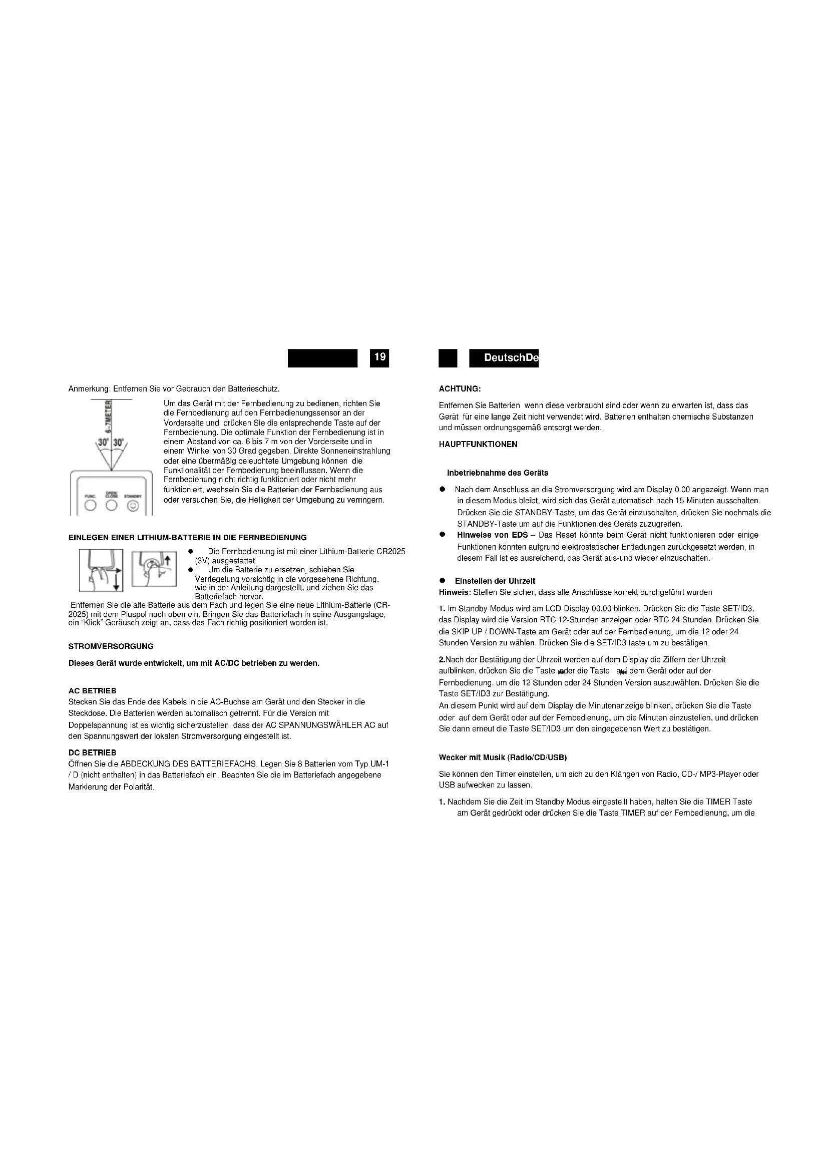Anmerkung: Entfernen Sie vor Gebrauch den Batterieschutz. Um das Gerät mit der Fernbedienung zu bedienen, richten Sie die Fernbedienung auf den Fernbedienungssensor an der Vorderseite und drücken Sie die entsprechende Taste auf der Fernbedienung. Die optimale Funktion der Fernbedienung ist in einem Abstand von ca. 6 bis 7 m von der Vorderseite und in einem Winkel von 30 Grad gegeben. Direkte Sonneneinstrahlung oder eine übermäßig beleuchtete Umgebung können die Funktionalität der Fernbedienung beeinflussen. Wenn die Fernbedienung nicht richtig funktioniert oder nicht mehr funktioniert, wechseln Sie die Batterien der Fernbedienung aus oder versuchen Sie, die Helligkeit der Umgebung zu verringern.
