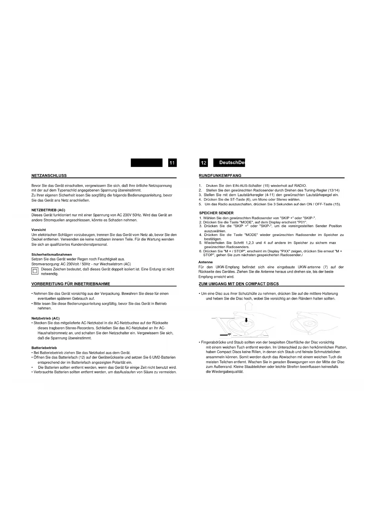 - Fingerabdrücke und Staub sollten von der bespielten Oberfläche der Disc vorsichtig mit einem weichen Tuch entfernt werden. Im Unterschied zu den herkömmlichen Platten, haben Compact Discs keine Rillen, in denen sich Staub und feinste Schmutzteilchen ansammeln können. Somit werden durch das Abwischen mit einem weichen Tuch die meisten Teilchen entfernt. Wischen Sie in geraden Bewegungen von der Mitte der Disc zum Außenrand. Kleine Staubteilchen oder leichte Streifen beeinflussen keinesfalls die Wiedergabequalität. NETZANSCHLUSS Bevor Sie das Gerät einschalten, vergewissern Sie sich, daß Ihre örtliche Netzspannung mit der auf dem Typenschild angegebenen Spannung übereinstimmt. Zu Ihrer eigenen Sicherheit lesen Sie sorgfältig die folgende Bedienungsanleitung, bevor Sie das Gerät ans Netz anschließen. NETZBETRIEB (AC) Dieses Gerät funktioniert nur mit einer Spannung von AC 230V 50Hz. Wird das Gerät an andere Stromquellen angeschlossen, könnte es Schaden nehmen. Vorsicht Um elektrischen Schlägen vorzubeugen, trennen Sie das Gerät vom Netz ab, bevor Sie den Deckel entfernen. Verwenden sie keine nutzbaren inneren Teile. Für die Wartung wenden Sie sich an qualifiziertes Kundendienstpersonal. Sicherheitsmaßnahmen Setzen Sie das Gerät weder Regen noch Feuchtigkeit aus. Stromversorgung: AC 230Volt / 50Hz - nur Wechselstrom (AC) Dieses Zeichen bedeutet, daß dieses Gerät doppelt isoliert ist. Eine Erdung ist nicht notwendig.