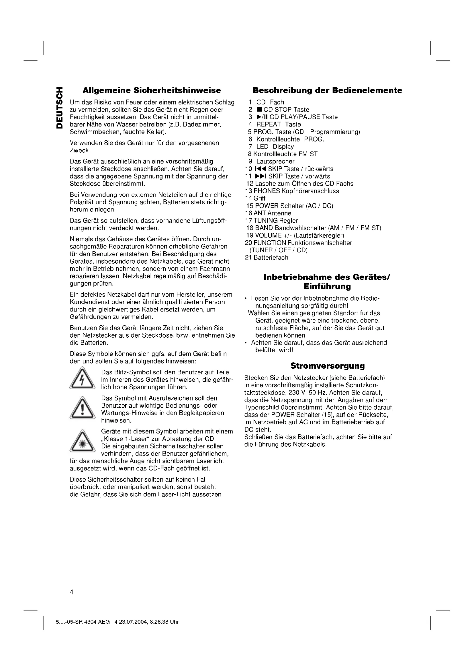 Обзор управляющих элементов .................... стр. 3 Руководство по эксплуатации........................ стр. 37 Гарантия........................................................ стр. 39 5....-05-SR 4304 AEG 2 23.07.2004, 8:26:37 Uhr3 Übersicht der Bedienelemente Overzicht van de bedieningselementen • Liste des différents éléments de commande Indicación de los elementos de manejo • Descrição dos elementos • Elementi di comando Oversikt over betjeningselementene • Overview of the Components Przegląd elementów obsługi • Přehled ovládacích prvků • A kezelő elemek áttekintése Обзор деталей прибора 5....-05-SR 4304 AEG 3 23.07.2004, 8:26:37 Uhr4 DEUTSCH Allgemeine Sicherheitshinweise Um das Risiko von Feuer oder einem elektrischen Schlag zu vermeiden, sollten Sie das Gerät nicht Regen oder Feuchtigkeit aussetzen. Das Gerät nicht in unmittel- barer Nähe von Wasser betreiben (z.B. Badezimmer, Schwimmbecken, feuchte Keller). Verwenden Sie das Gerät nur für den vorgesehenen Zweck. Das Gerät ausschließlich an eine vorschriftsmäßig installierte Steckdose anschließen. Achten Sie darauf, dass die angegebene Spannung mit der Spannung der Steckdose übereinstimmt. Bei Verwendung von externen Netzteilen auf die richtige Polarität und Spannung achten, Batterien stets richtig- herum einlegen. Das Gerät so aufstellen, dass vorhandene Lüftungsöff- nungen nicht verdeckt werden. Niemals das Gehäuse des Gerätes öffnen. Durch un- sachgemäße Reparaturen können erhebliche Gefahren für den Benutzer entstehen. Bei Beschädigung des Gerätes, insbesondere des Netzkabels, das Gerät nicht mehr in Betrieb nehmen, sondern von einem Fachmann reparieren lassen. Netzkabel regelmäßig auf Beschädi- gungen prüfen. Ein defektes Netzkabel darf nur vom Hersteller, unserem Kundendienst oder einer ähnlich qualifi zierten Person durch ein gleichwertiges Kabel ersetzt werden, um Gefährdungen zu vermeiden. Benutzen Sie das Gerät längere Zeit nicht, ziehen Sie den Netzstecker aus der Steckdose, bzw. entnehmen Sie die Batterien. Diese Symbole können sich ggfs. auf dem Gerät befi n- den und sollen Sie auf folgendes hinweisen: Das Blitz-Symbol soll den Benutzer auf Teile im Inneren des Gerätes hinweisen, die gefähr- lich hohe Spannungen führen. Das Symbol mit Ausrufezeichen soll den Benutzer auf wichtige Bedienungs- oder Wartungs-Hinweise in den Begleitpapieren hinweisen. Geräte mit diesem Symbol arbeiten mit einem „Klasse 1-Laser“ zur Abtastung der CD. Die eingebauten Sicherheitsschalter sollen verhindern, dass der Benutzer gefährlichem, für das menschliche Auge nicht sichtbarem Laserlicht ausgesetzt wird, wenn das CD-Fach geöffnet ist. Diese Sicherheitsschalter sollten auf keinen Fall überbrückt oder manipuliert werden, sonst besteht die Gefahr, dass Sie sich dem Laser-Licht aussetzen. Beschreibung der Bedienelemente 1 CD Fach 2 CD STOP Taste 3 /II CD PLAY/PAUSE Taste 4 REPEAT Taste 5 PROG. Taste (CD - Programmierung) 6 Kontrollleuchte PROG. 7 LED Display 8 Kontrollleuchte FM ST 9 Lautsprecher 10 I SKIP Taste / rückwärts 11 I SKIP Taste / vorwärts 12 Lasche zum Öffnen des CD Fachs 13 PHONES Kopfhöreranschluss 14 Griff 15 POWER Schalter (AC / DC) 16 ANT Antenne 17 TUNING Regler 18 BAND Bandwahlschalter (AM / FM / FM ST) 19 VOLUME +/- (Lautstärkeregler) 20 FUNCTION Funktionswahlschalter (TUNER / OFF / CD) 21 Batteriefach Inbetriebnahme des Gerätes/ Einführung