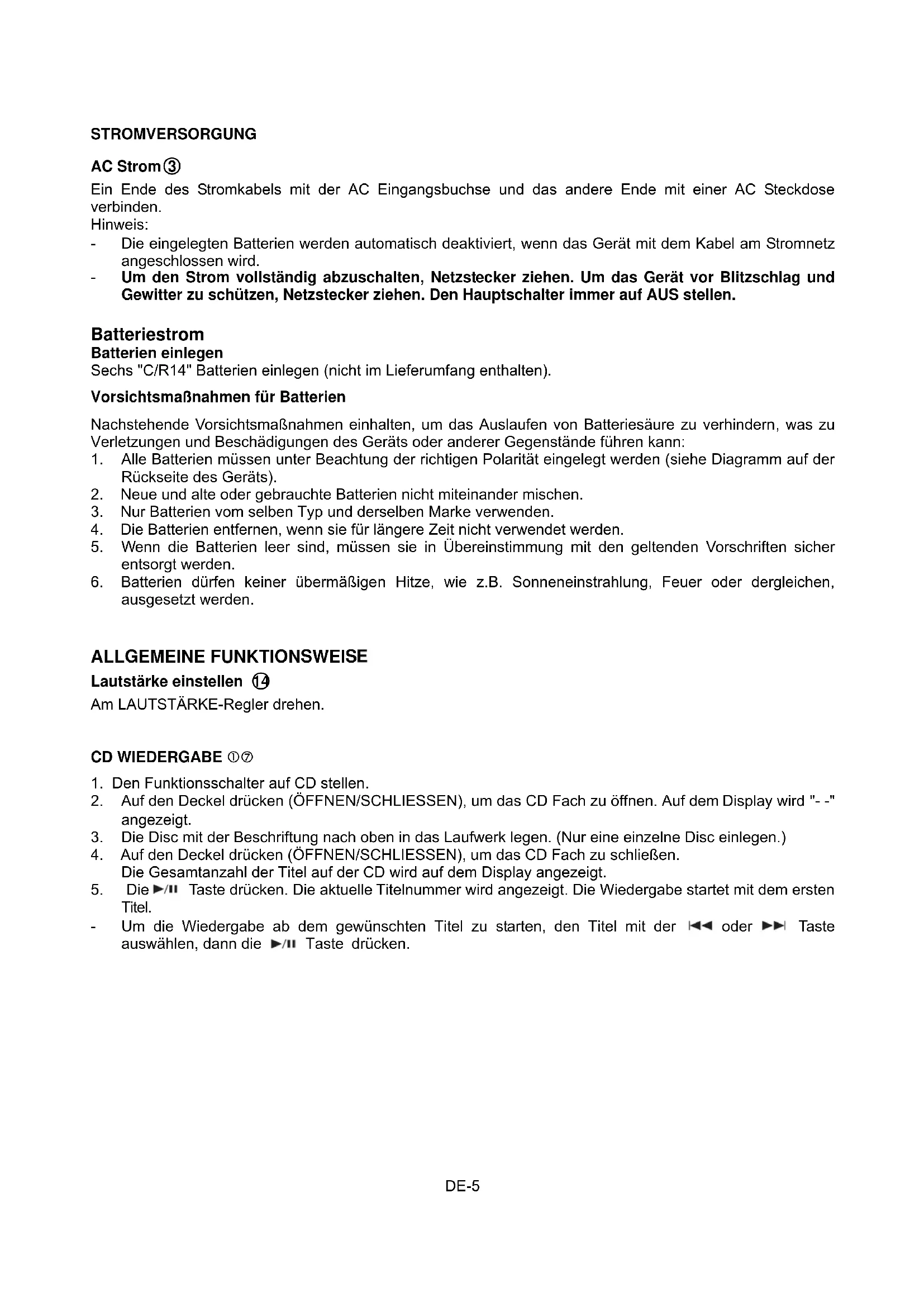 Hinweis: - Während der CD Wiedergabe das CD Fach nicht öffnen. Vor dem Öffnen des CD Fachs immer die STOPP Taste drücken und warten, bis sich die CD nicht mehr dreht. - Auf diesem Gerät können auch CD-R/RWs abgespielt werden. Je nach Aufnahmebedingung können jedoch einige CD-R/RWs nicht abgespielt werden. - Auf diesem Gerät können keine MP3/WMA CDs oder Video CDs abgespielt werden. Hinweise zur Behandlung von Compact Discs - Die Disc nicht für längere Zeit direkter Sonneneinstrahlung, hoher Luftfeuchtigkeit oder hohen Temperaturen aussetzen. - Discs sollten nach Gebrauch zurück in die Hülle gelegt werden. - Keinerlei Papier oder Beschriftung auf der Disc-Oberfläche anbringen. - Die Disc am Rand anfassen. Die Wiedergabeseite nicht berühren (glänzende Seite). - Fingerabdrücke und Staub auf der Wiedergabeseite der Disc sollten vorsichtig mit einem weichen Tuch abgewischt werden. Vom Mittelpunkt zum Rand der Disc in einer geraden Linie wischen. - Zum Reinigen von Compact Discs niemals Chemikalien, wie z.B. Reinigungssprays für Schallplatten, antistatische Sprays oder Flüssigkeiten, Benzol oder Verdünner verwenden. Wiedergabe vorübergehend stoppen
