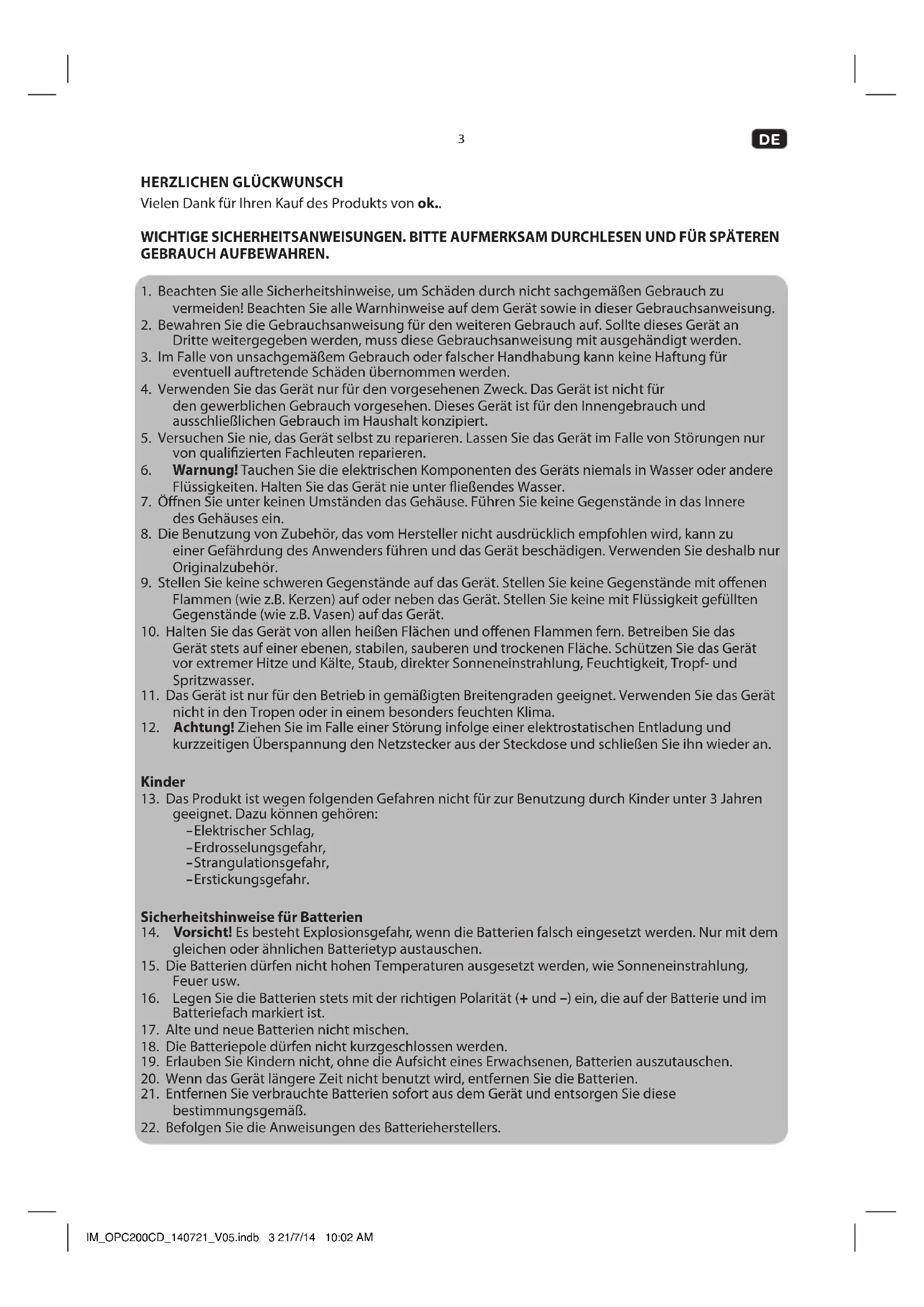 Vielen Dank für Ihren Kauf des Produkts von ok.. WICHTIGE SICHERHEITSANWEISUNGEN. BITTE AUFMERKSAM DURCHLESEN UND FÜR SPÄTEREN GEBRAUCH AUFBEWAHREN.