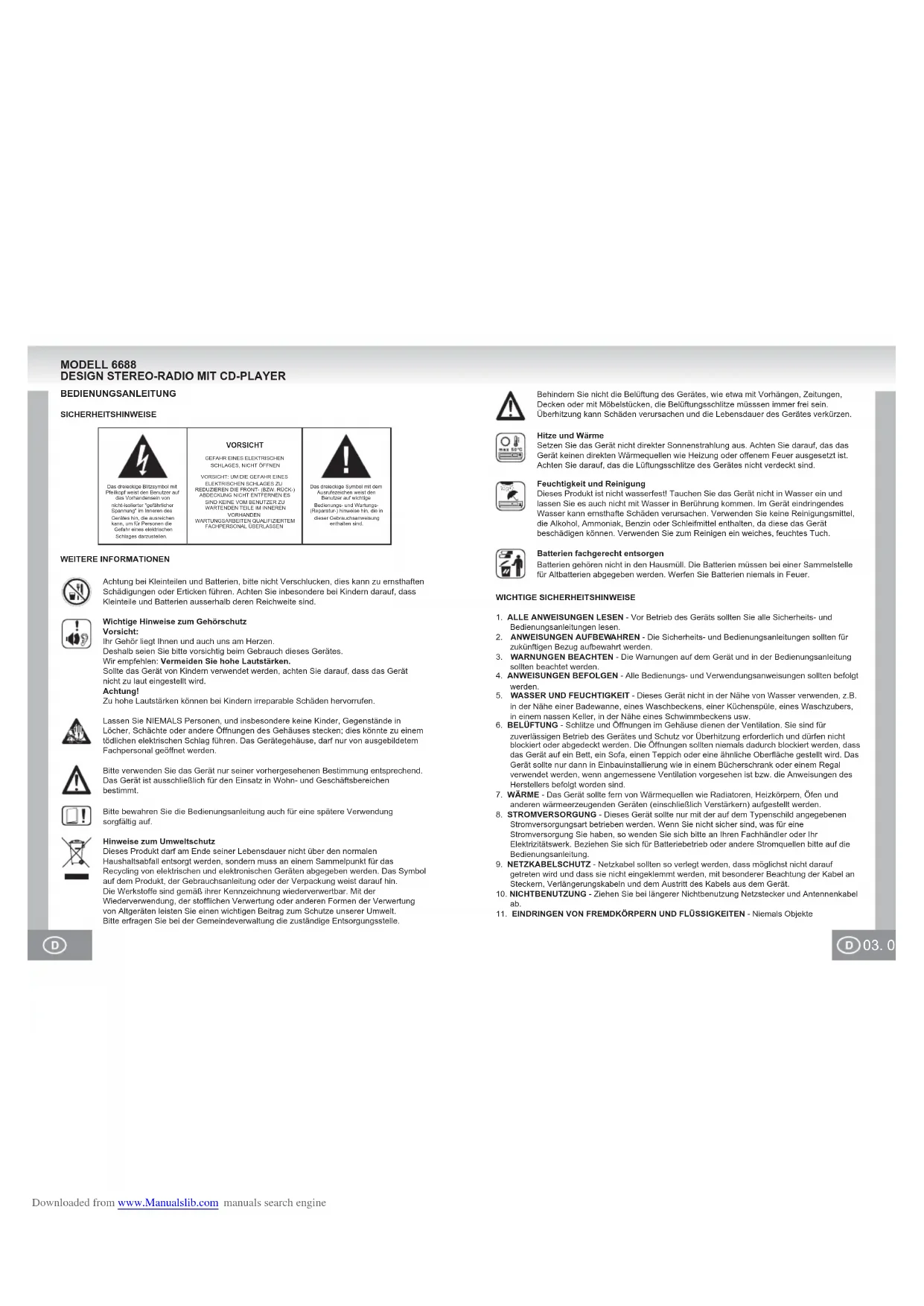 in der Nähe einer Badewanne, eines Waschbeckens, einer Küchenspüle, eines Waschzubers, in einem nassen Keller, in der Nähe eines Schwimmbeckens usw.6. BELÜFTUNG - Schlitze und Öffnungen im Gehäuse dienen der Ventilation. Sie sind für zuverlässigen Betrieb des Gerätes und Schutz vor Überhitzung erforderlich und dürfen nicht blockiert oder abgedeckt werden. Die Öffnungen sollten niemals dadurch blockiert werden, dass das Gerät auf ein Bett, ein Sofa, einen Teppich oder eine ähnliche Oberfläche gestellt wird. Das Gerät sollte nur dann in Einbauinstallierung wie in einem Bücherschrank oder einem Regal verwendet werden, wenn angemessene Ventilation vorgesehen ist bzw. die Anweisungen des Herstellers befolgt worden sind.7. WÄRME - Das Gerät sollte fern von Wärmequellen wie Radiatoren, Heizkörpern, Öfen und anderen wärmeerzeugenden Geräten (einschließlich Verstärkern) aufgestellt werden.8. STROMVERSORGUNG - Dieses Gerät sollte nur mit der auf dem Typenschild angegebenen Stromversorgungsart betrieben werden. Wenn Sie nicht sicher sind, was für eine Stromversorgung Sie haben, so wenden Sie sich bitte an Ihren Fachhändler oder Ihr Elektrizitätswerk. Beziehen Sie sich für Batteriebetrieb oder andere Stromquellen bitte auf die Bedienungsanleitung.9. NETZKABELSCHUTZ - Netzkabel sollten so verlegt werden, dass möglichst nicht darauf getreten wird und dass sie nicht eingeklemmt werden, mit besonderer Beachtung der Kabel an Steckern, Verlängerungskabeln und dem Austritt des Kabels aus dem Gerät.10. NICHTBENUTZUNG - Ziehen Sie bei längerer Nichtbenutzung Netzstecker und Antennenkabel ab. 11. EINDRINGEN VON FREMDKÖRPERN UND FLÜSSIGKEITEN - Niemals Objekte Behindern Sie nicht die Belüftung des Gerätes, wie etwa mit Vorhängen, Zeitungen, Decken oder mit Möbelstücken, die Belüftungsschlitze müsssen immer frei sein. Überhitzung kann Schäden verursachen und die Lebensdauer des Gerätes verkürzen.Hitze und WärmeSetzen Sie das Gerät nicht direkter Sonnenstrahlung aus. Achten Sie darauf, das das Gerät keinen direkten Wärmequellen wie Heizung oder offenem Feuer ausgesetzt ist. Achten Sie darauf, das die Lüftungsschlitze des Gerätes nicht verdeckt sind.Feuchtigkeit und ReinigungDieses Produkt ist nicht wasserfest! Tauchen Sie das Gerät nicht in Wasser ein und lassen Sie es auch nicht mit Wasser in Berührung kommen. Im Gerät eindringendes Wasser kann ernsthafte Schäden verursachen. Verwenden Sie keine Reinigungsmittel, die Alkohol, Ammoniak, Benzin oder Schleifmittel enthalten, da diese das Gerät beschädigen können. Verwenden Sie zum Reinigen ein weiches, feuchtes Tuch.Batterien fachgerecht entsorgenBatterien gehören nicht in den Hausmüll. Die Batterien müssen bei einer Sammelstelle für Altbatterien abgegeben werden. Werfen Sie Batterien niemals in Feuer. Downloaded from www.Manualslib.com manuals search engine05. 04. irgendwelcher Art durch die Öffnungen in das Gerät schieben, da diese unter hoher Spannung stehende Teile berühren oder kurzschließen können, wodurch es zu Feuer oder Stromschlag kommen kann. Niemals Flüssigkeiten irgendwelcher Art auf dem Gerät verschütten.