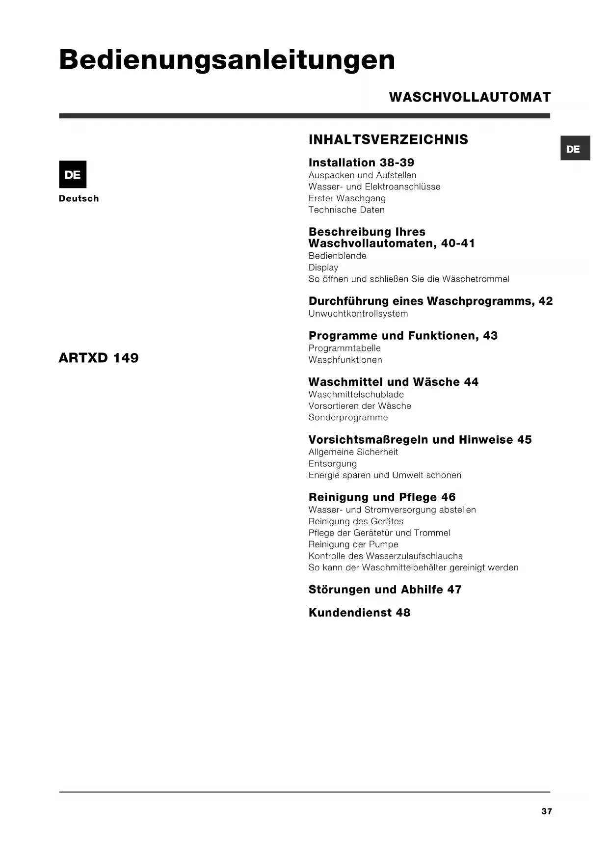 ARTXD 149 Bedienungsanleitungen WASCHVOLLAUTOMAT38