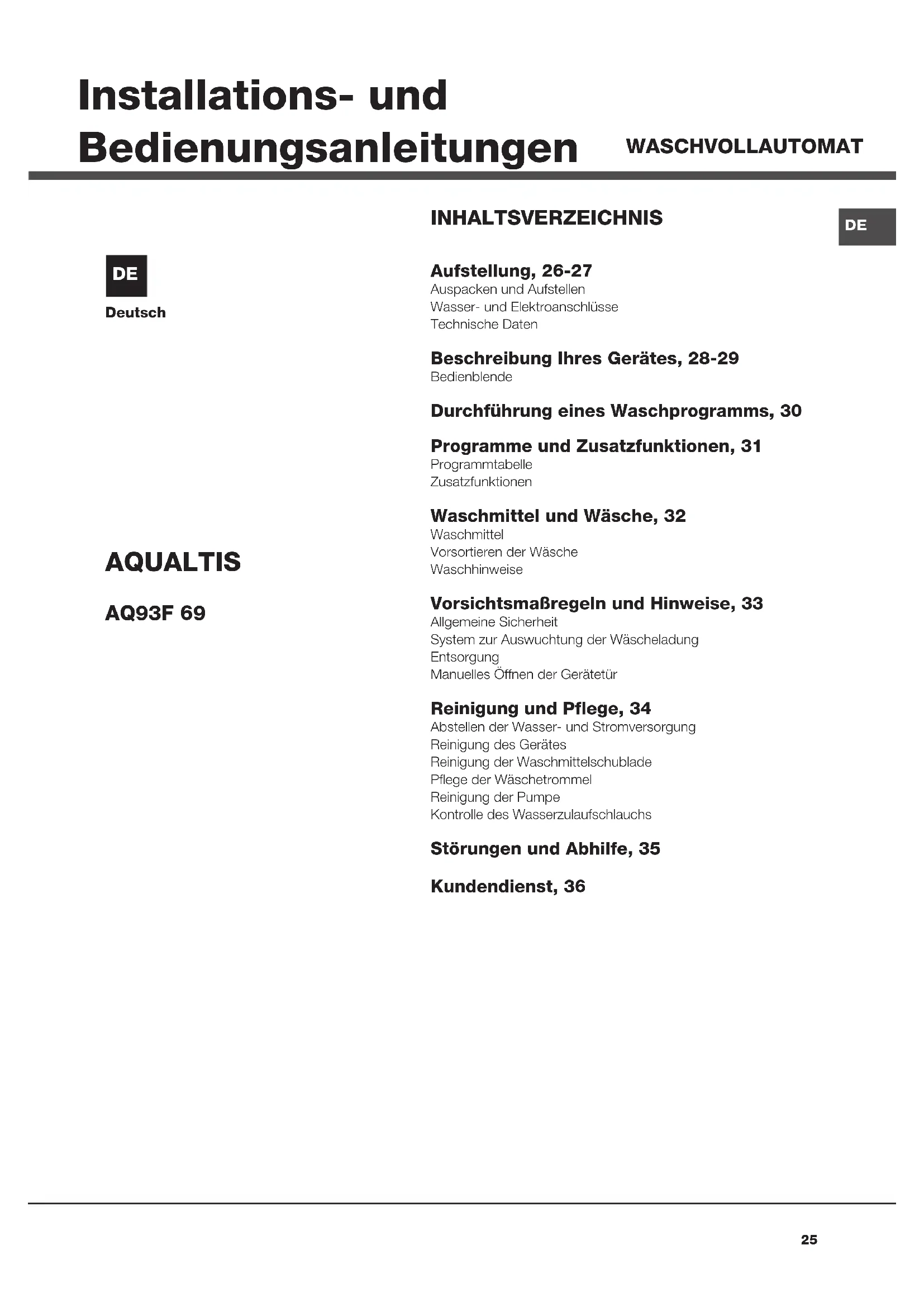 WASCHVOLLAUTOMAT AQUALTIS AQ93F 69 Installations- und BedienungsanleitungenDE