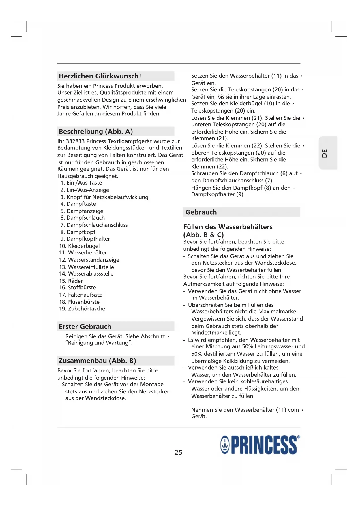 Herzlichen Glückwunsch! Sie haben ein Princess Produkt erworben. Unser Ziel ist es, Qualitätsprodukte mit einem geschmackvollen Design zu einem erschwinglichen Preis anzubieten. Wir hoffen, dass Sie viele Jahre Gefallen an diesem Produkt finden. Beschreibung (Abb. A) Ihr 332833 Princess Textildampfgerät wurde zur Bedampfung von Kleidungsstücken und Textilien zur Beseitigung von Falten konstruiert. Das Gerät ist nur für den Gebrauch in geschlossenen Räumen geeignet. Das Gerät ist nur für den Hausgebrauch geeignet.