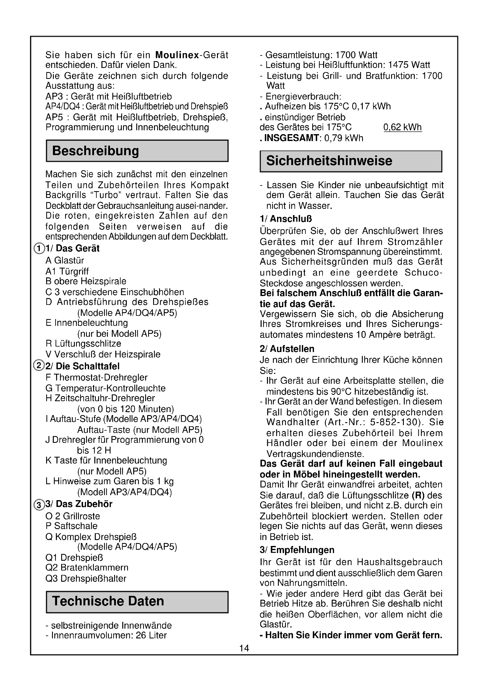 Sie haben sich für ein Moulinex-Gerät entschieden. Dafür vielen Dank. Die Geräte zeichnen sich durch folgende Ausstattung aus: AP3 : Gerät mit Heißluftbetrieb AP4/DQ4 : Gerät mit Heißluftbetrieb und Drehspieß AP5 : Gerät mit Heißluftbetrieb, Drehspieß, Programmierung und Innenbeleuchtung Beschreibung Machen Sie sich zunächst mit den einzelnen Teilen und Zubehörteilen Ihres Kompakt Backgrills “Turbo” vertraut. Falten Sie das Deckblatt der Gebrauchsanleitung ausei-nander. Die roten, eingekreisten Zahlen auf den folgenden Seiten verweisen auf die entsprechenden Abbildungen auf dem Deckblatt. 1/ Das Gerät A Glastür A1 Türgriff B obere Heizspirale C 3 verschiedene Einschubhöhen D Antriebsführung des Drehspießes (Modelle AP4/DQ4/AP5) E Innenbeleuchtung (nur bei Modell AP5) R Lüftungsschlitze V Verschluß der Heizspirale 2/ Die Schalttafel F Thermostat-Drehregler G Temperatur-Kontrolleuchte H Zeitschaltuhr-Drehregler (von 0 bis 120 Minuten) I Auftau-Stufe (Modelle AP3/AP4/DQ4) Auftau-Taste (nur Modell AP5) J Drehregler für Programmierung von 0 bis 12 H K Taste für Innenbeleuchtung (nur Modell AP5) L Hinweise zum Garen bis 1 kg (Modell AP3/AP4/DQ4) 3/ Das Zubehör O 2 Grillroste P Saftschale Q Komplex Drehspieß (Modelle AP4/DQ4/AP5) Q1 Drehspieß Q2 Bratenklammern Q3 Drehspießhalter Technische Daten - selbstreinigende Innenwände - Innenraumvolumen: 26 Liter - Gesamtleistung: 1700 Watt - Leistung bei Heißluftfunktion: 1475 Watt - Leistung bei Grill- und Bratfunktion: 1700 Watt - Energieverbrauch: . Aufheizen bis 175°C 0,17 kWh . einstündiger Betrieb des Gerätes bei 175°C 0,62 kWh . INSGESAMT: 0,79 kWh Sicherheitshinweise - Lassen Sie Kinder nie unbeaufsichtigt mit dem Gerät allein. Tauchen Sie das Gerät nicht in Wasser. 1/ Anschluß Überprüfen Sie, ob der Anschlußwert Ihres Gerätes mit der auf Ihrem Stromzähler angegebenen Stromspannung übereinstimmt. Aus Sicherheitsgründen muß das Gerät unbedingt an eine geerdete Schuco- Steckdose angeschlossen werden. Bei falschem Anschluß entfällt die Garan- tie auf das Gerät. Vergewissern Sie sich, ob die Absicherung Ihres Stromkreises und Ihres Sicherungs- automates mindestens 10 Ampère beträgt. 2/ Aufstellen Je nach der Einrichtung Ihrer Küche können Sie: - Ihr Gerät auf eine Arbeitsplatte stellen, die mindestens bis 90°C hitzebeständig ist. - Ihr Gerät an der Wand befestigen. In diesem Fall benötigen Sie den entsprechenden Wandhalter (Art.-Nr.: 5-852-130). Sie erhalten dieses Zubehörteil bei Ihrem Händler oder bei einem der Moulinex Vertragskundendienste. Das Gerät darf auf keinen Fall eingebaut oder in Möbel hineingestellt werden. Damit Ihr Gerät einwandfrei arbeitet, achten Sie darauf, daß die Lüftungsschlitze (R) des Gerätes frei bleiben, und nicht z.B. durch ein Zubehörteil blockiert werden. Stellen oder legen Sie nichts auf das Gerät, wenn dieses in Betrieb ist. 3/ Empfehlungen Ihr Gerät ist für den Haushaltsgebrauch bestimmt und dient ausschließlich dem Garen von Nahrungsmitteln. - Wie jeder andere Herd gibt das Gerät bei Betrieb Hitze ab. Berühren Sie deshalb nicht die heißen Oberflächen, vor allem nicht die Glastür. - Halten Sie Kinder immer vom Gerät fern.
