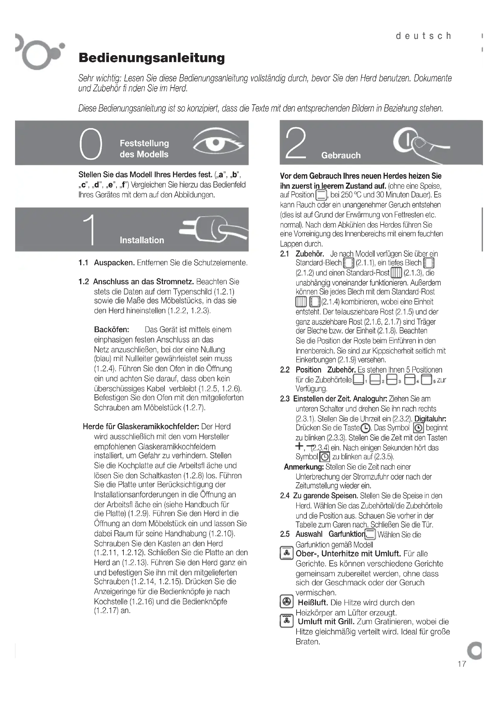 Bedienungsanleitung Sehr wichtig: Lesen Sie diese Bedienungsanleitung vollständig durch, bevor Sie den Herd benutzen. Dokumente und Zubehör fi nden Sie im Herd. Diese Bedienungsanleitung ist so konzipiert, dass die Texte mit den entsprechenden Bildern in Beziehung stehen.