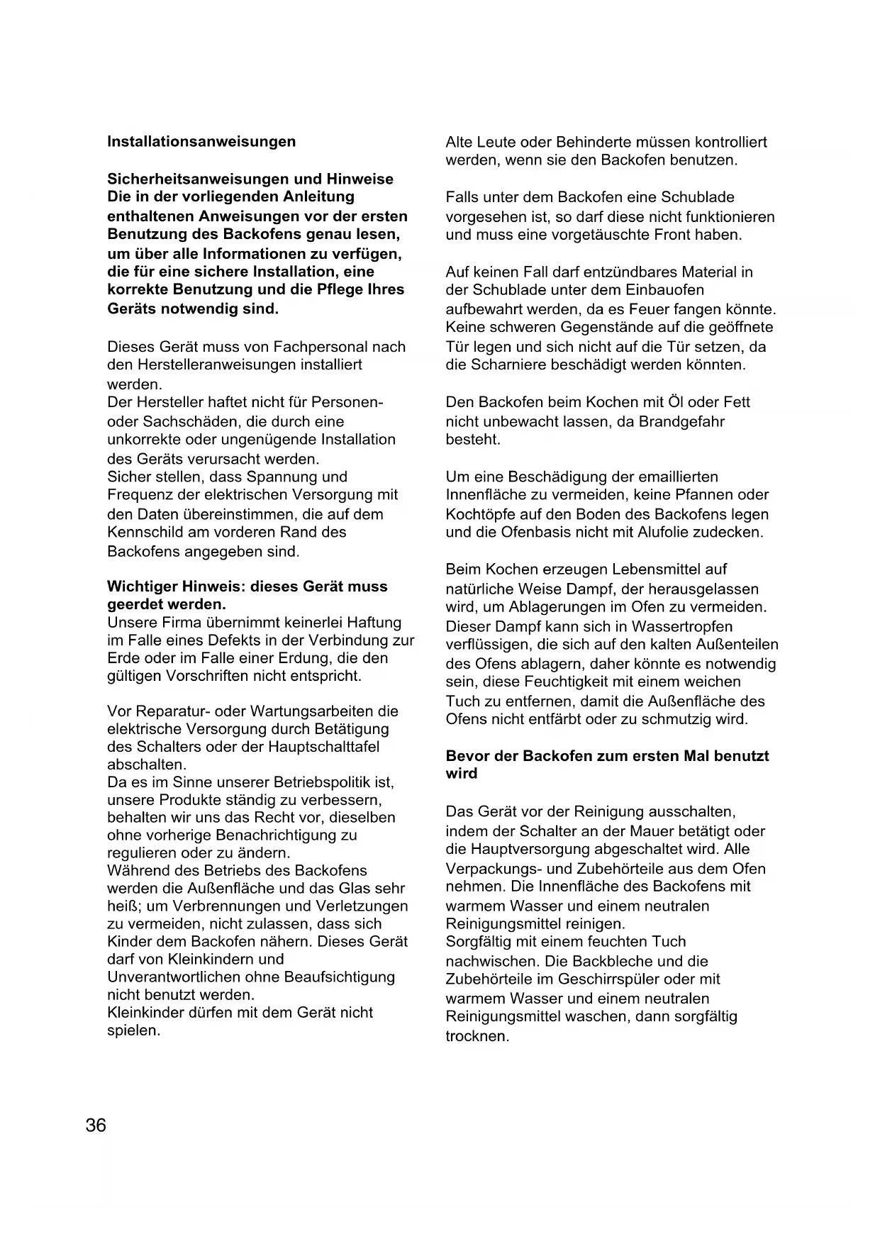 Cooking time (mins). Cooking Function Cake Bun 180 2 55-65 Fruit Cake 200 1 30-40 Buttermilk curd cake 180 2 35-40 Mould leaven cake 200 1 25-35 Choux pastry 190 2 20-30 Puff or flaky pastry 200 2 15-25 Biscuits 190 3 15-20 Lasagna 225 2 40-50 Meat Fillet beef 225 2-3 50-80 Roast beef 225 2-3 50-80 Roast veal 225 2-3 60-80 Roast pork 170-180 2 45-60 Roast lamp 225 2 45-55 Roast.beef 225 2-3 50-60 Roast hare 200 2 60-90 Roast turkey 180 2 240ca. Roast goose 200 2 150-210 Roast duck 200 2 120-180 Roast chicken 200 2 60-90 Thigh roe deer 200 2-3 90-150 Thigh stag 180 2-3 90-180 Fish 180 2-3 10-40 Vegetable Stew ing vegetable 170-190 2-3 40-50 Pizza 240 1 15-25 Grill cooking Chop 4 8-12 Pork sausage 4 10-13 Grill ckichen 3 25-35 Spit chicken 50-65 Spit roast veal 50-65 Not e : (*)= The start shelf position number is button oven the oven should be preheated before use. This functions should cook w ith delicated food and/or preheated dish. It's possible cook same dish in different shelf position (the cooking time is the same). 35Installationsanweisungen Sicherheitsanweisungen und Hinweise Die in der vorliegenden Anleitung enthaltenen Anweisungen vor der ersten Benutzung des Backofens genau lesen, um über alle Informationen zu verfügen, die für eine sichere Installation, eine korrekte Benutzung und die Pflege Ihres Geräts notwendig sind. Dieses Gerät muss von Fachpersonal nach den Herstelleranweisungen installiert werden. Der Hersteller haftet nicht für Personen- oder Sachschäden, die durch eine unkorrekte oder ungenügende Installation des Geräts verursacht werden. Sicher stellen, dass Spannung und Frequenz der elektrischen Versorgung mit den Daten übereinstimmen, die auf dem Kennschild am vorderen Rand des Backofens angegeben sind. Wichtiger Hinweis: dieses Gerät muss geerdet werden. Unsere Firma übernimmt keinerlei Haftung im Falle eines Defekts in der Verbindung zur Erde oder im Falle einer Erdung, die den gültigen Vorschriften nicht entspricht. Vor Reparatur- oder Wartungsarbeiten die elektrische Versorgung durch Betätigung des Schalters oder der Hauptschalttafel abschalten. Da es im Sinne unserer Betriebspolitik ist, unsere Produkte ständig zu verbessern, behalten wir uns das Recht vor, dieselben ohne vorherige Benachrichtigung zu regulieren oder zu ändern. Während des Betriebs des Backofens werden die Außenfläche und das Glas sehr heiß; um Verbrennungen und Verletzungen zu vermeiden, nicht zulassen, dass sich Kinder dem Backofen nähern. Dieses Gerät darf von Kleinkindern und Unverantwortlichen ohne Beaufsichtigung nicht benutzt werden. Kleinkinder dürfen mit dem Gerät nicht spielen. Alte Leute oder Behinderte müssen kontrolliert werden, wenn sie den Backofen benutzen. Falls unter dem Backofen eine Schublade vorgesehen ist, so darf diese nicht funktionieren und muss eine vorgetäuschte Front haben. Auf keinen Fall darf entzündbares Material in der Schublade unter dem Einbauofen aufbewahrt werden, da es Feuer fangen könnte. Keine schweren Gegenstände auf die geöffnete Tür legen und sich nicht auf die Tür setzen, da die Scharniere beschädigt werden könnten. Den Backofen beim Kochen mit Öl oder Fett nicht unbewacht lassen, da Brandgefahr besteht. Um eine Beschädigung der emaillierten Innenfläche zu vermeiden, keine Pfannen oder Kochtöpfe auf den Boden des Backofens legen und die Ofenbasis nicht mit Alufolie zudecken. Beim Kochen erzeugen Lebensmittel auf natürliche Weise Dampf, der herausgelassen wird, um Ablagerungen im Ofen zu vermeiden. Dieser Dampf kann sich in Wassertropfen verflüssigen, die sich auf den kalten Außenteilen des Ofens ablagern, daher könnte es notwendig sein, diese Feuchtigkeit mit einem weichen Tuch zu entfernen, damit die Außenfläche des Ofens nicht entfärbt oder zu schmutzig wird. Bevor der Backofen zum ersten Mal benutzt wird Das Gerät vor der Reinigung ausschalten, indem der Schalter an der Mauer betätigt oder die Hauptversorgung abgeschaltet wird. Alle Verpackungs- und Zubehörteile aus dem Ofen nehmen. Die Innenfläche des Backofens mit warmem Wasser und einem neutralen Reinigungsmittel reinigen. Sorgfältig mit einem feuchten Tuch nachwischen. Die Backbleche und die Zubehörteile im Geschirrspüler oder mit warmem Wasser und einem neutralen Reinigungsmittel waschen, dann sorgfältig trocknen. 36Technische Daten Dieses Gerät ist mit den EWG-Richtlinien 72/23, 93/68 EMC und 89/336 konform. Vorschriftsmäßige Spannung § 230 V Phase + Nullleiter. Abmessungen des Einbaubackofens : Länge : 440 Tiefe : 390 Höhe : 340 Volumen : 59 Liter Leistung der Heizelemente : Unteres Heizelement : 1,3 kW Oberes Heizelement : 0,9 kW Grillelement : 1,6 kW Lüfterradelement (innen, vorne) : 2,3 kW Max. Leistungsaufnahme des Backofens : 3,1 kW Einbau des Backofens im Möbel WICHTIG : das Gerät muss korrekt nach den Anweisungen der Herstellerfirma und von Fachpersonal installiert werden. Vor Reparatur- oder Wartungsarbeiten muss das Gerät von der elektrischen Versorgung abgetrennt werden. ELEKTRISCHER ANSCHLUSS : Vor dem Anschluss des Geräts an der elektrischen Versorgung ist sicher zu stellen, dass :