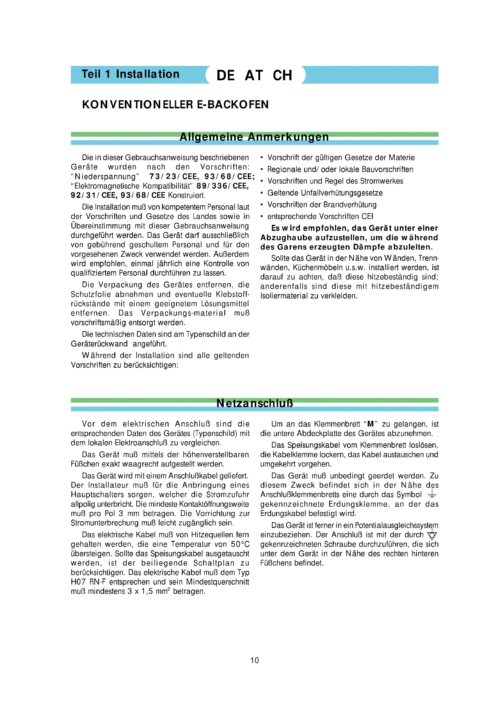 - entsprechende Vorschriften CEI Es wird empfohlen, das Gerät unter einer Abzughaube aufzustellen, um die während des Garens erzeugten Dämpfe abzuleiten. Sollte das Gerät in der Nähe von Wänden, Trenn- wänden, Küchenmöbeln u.s.w. installiert werden, ist darauf zu achten, daß diese hitzebeständig sind; anderenfalls sind diese mit hitzebeständigem Isoliermaterial zu verkleiden. Um an das Klemmenbrett “M” zu gelangen, ist die untere Abdeckplatte des Gerätes abzunehmen. Das Speisungskabel vom Klemmenbrett loslösen, die Kabelklemme lockern, das Kabel austauschen und umgekehrt vorgehen. Das Gerät muß unbedingt geerdet werden. Zu diesem Zweck befindet sich in der Nähe des Anschlußklemmenbretts eine durch das Symbol gekennzeichnete Erdungsklemme, an der das Erdungskabel befestigt wird. Das Gerät ist ferner in ein Potentialausgleichssystem einzubeziehen. Der Anschluß ist mit der durch gekennzeichneten Schraube durchzuführen, die sich unter dem Gerät in der Nähe des rechten hinteren Füßchens befindet. Netzanschluß Vor dem elektrischen Anschluß sind die entsprechenden Daten des Gerätes (Typenschild) mit dem lokalen Elektroanschluß zu vergleichen. Das Gerät muß mittels der höhenverstellbaren Füßchen exakt waagrecht aufgestellt werden. Das Gerät wird mit einem Anschlußkabel geliefert. Der Installateur muß für die Anbringung eines Hauptschalters sorgen, welcher die Stromzufuhr allpolig unterbricht. Die mindeste Kontaktöffnungsweite muß pro Pol 3 mm betragen. Die Vorrichtung zur Stromunterbrechung muß leicht zugänglich sein. Das elektrische Kabel muß von Hitzequellen fern gehalten werden, die eine Temperatur von 50°C übersteigen. Sollte das Speisungskabel ausgetauscht werden, ist der beiliegende Schaltplan zu berücksichtigen. Das elektrische Kabel muß dem Typ H07 RN-F entsprechen und sein Mindestquerschnitt muß mindestens 3 x 1,5 mm