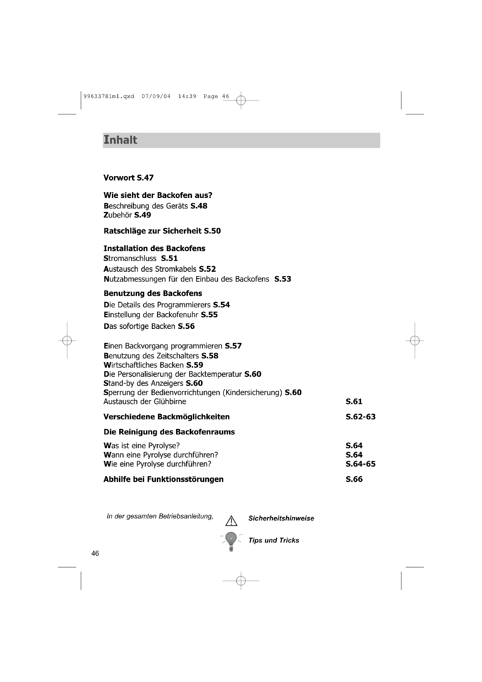 99633781ml.qxd 07/09/04 14:39 Page 4445 99633781ml.qxd 07/09/04 14:39 Page 4546 In der gesamten Betriebsanleitung, Sicherheitshinweise Tips und Tricks Vorwort S.47 Wie sieht der Backofen aus? Beschreibung des Geräts S.48 Zubehör S.49 Ratschläge zur Sicherheit S.50 Installation des Backofens Stromanschluss S.51 Austausch des Stromkabels S.52 Nutzabmessungen für den Einbau des Backofens S.53 Benutzung des Backofens Die Details des Programmierers S.54 Einstellung der Backofenuhr S.55 Das sofortige Backen S.56 Einen Backvorgang programmieren S.57 Benutzung des Zeitschalters S.58 Wirtschaftliches Backen S.59 Die Personalisierung der Backtemperatur S.60 Stand-by des Anzeigers S.60 Sperrung der Bedienvorrichtungen (Kindersicherung) S.60 Austausch der Glühbirne S.61 Verschiedene Backmöglichkeiten S.62-63 Die Reinigung des Backofenraums Was ist eine Pyrolyse? S.64 Wann eine Pyrolyse durchführen? S.64 Wie eine Pyrolyse durchführen? S.64-65 Abhilfe bei Funktionsstörungen S.66 Inhalt 99633781ml.qxd 07/09/04 14:39 Page 4647