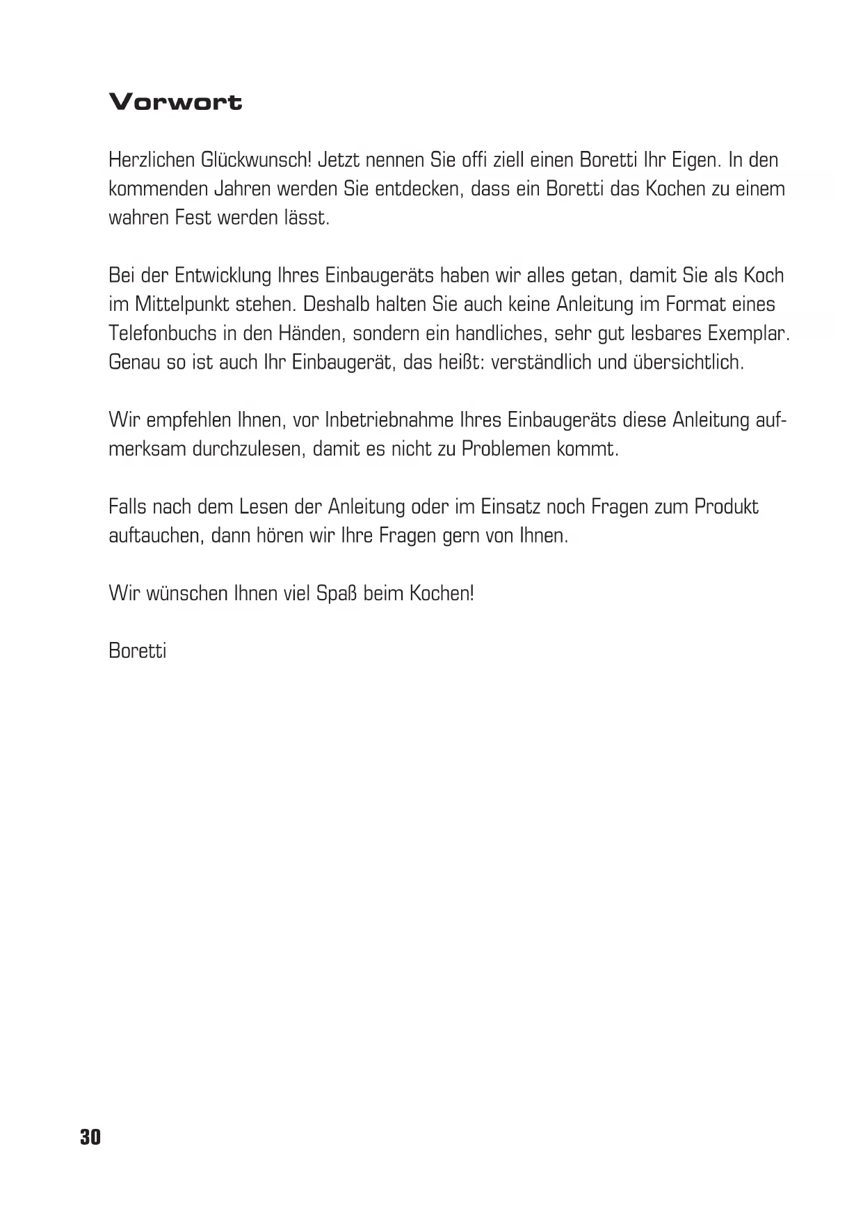 Lassen Sie die Verpackungsreste in keinem Fall unbeaufsichtigt zurück. Trennen Sie die ver- schiedenen Verpackungsmaterialien und geben Sie sie bei der nächsten Abfallentsorgungsstelle in Ihrer Gemeinde ab. Wir verwenden zur Ver- packung unserer Produkte nicht verunreinigende und daher umweltfreundliche und recyclingfä- hige Werkstoffe. Wir bitten deshalb um Ihre Mitarbeit, indem Sie für die ordnungsgemäße Entsorgung des Verpackungsmaterials sorgen. Die Adressen der Sammel-, Recycling- oder Entsorgungszentren erhalten Sie bei Ihrem Wie- derverkäufer oder bei den am Ort zuständigen Behörden. Lassen Sie die Verpackung (oder Teile davon) nicht einfach irgendwo zurück. Davon – vor allem von den Kunststoffbeuteln – kann eine Erstickungsgefahr für Kinder ausgehen. Außer- dem müssen Sie für die ordnungsgemäße Ents- orgung des Altgeräts sorgen. Wichtig: Geben Sie das Gerät bei der am Ort zuständigen Sammelstelle für alte Haus- haltsgeräte ab. Durch ord- nungsgemäße Entsorgung können wertvolle Materialien auf intelligente Weise wieder- verwertet werden. Bevor Sie Ihr Gerät weggeben, müssen Sie unbedingt die Türen entfernen und die Gestelle in die Gebrau- chsstellung stellen, damit spielende Kinder nicht im Ofenraum eingeschlossen werden können. Weiterhin müssen Sie die Netzkabel abschnei- den und zusammen mit dem Stecker entfernen. Die Richtlinie legt die Normen für das Einsam- meln und Recycling von Altgeräten für das ge- samte Gebiet der Europäischen Union fest. Umweltvorschriften44 Introduction Boretti would like to congratulate you on your new kitchen purchase, and to thank you for choosing a Boretti brand product. Please read this manual carefully before going on to use the product. This will prevent possible problems and ensure that you are aware of the correct and safe use of this product In the event that queries arise once you have read the manual or at any time du- ring the use of your Boretti product, we will be happy to help you. Please refer to the back cover of this manual for Boretti’s contact details. We hope you enjoy using this product! BorettiNL