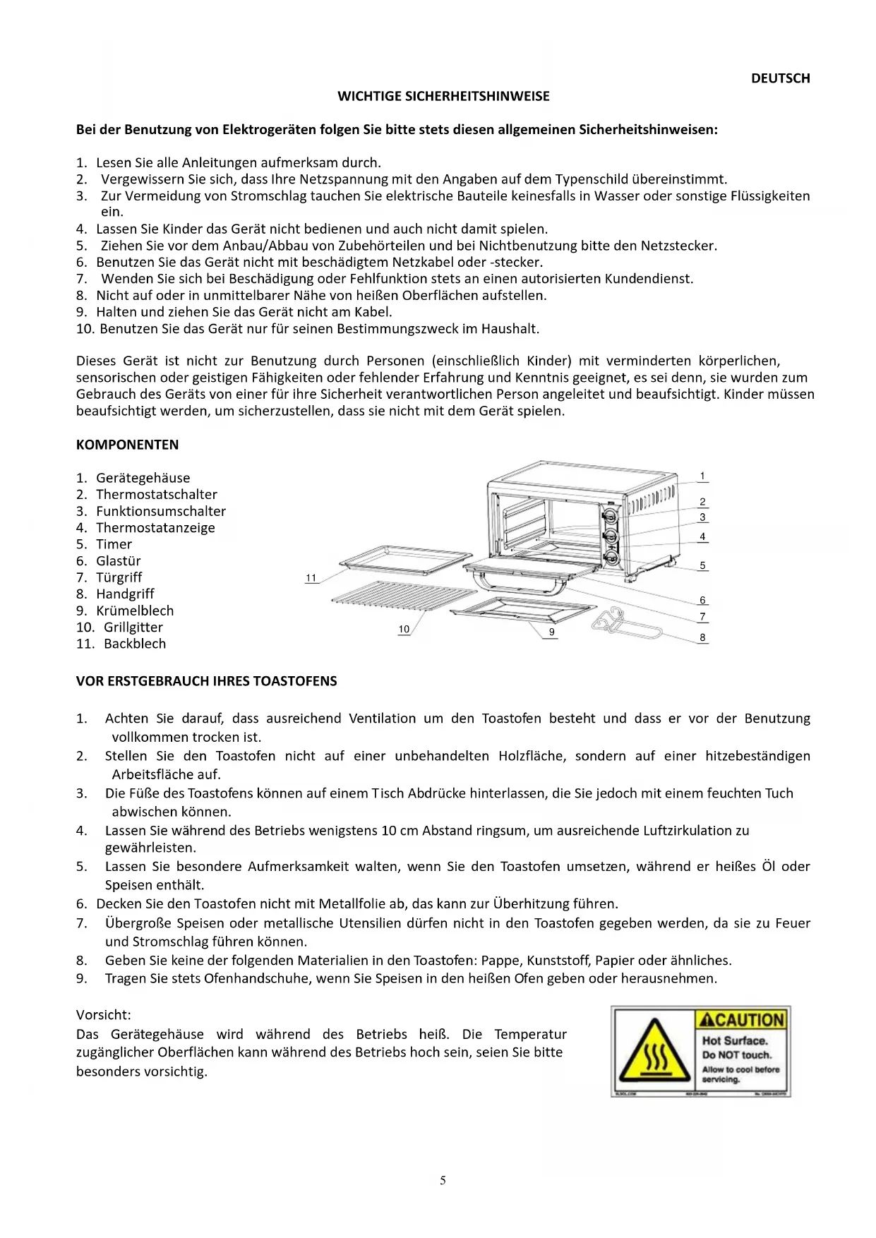 - Stellen Sie den Toastofen nicht auf einer unbehandelten Holzfläche, sondern auf einer hitzebeständigen Arbeitsfläche auf.