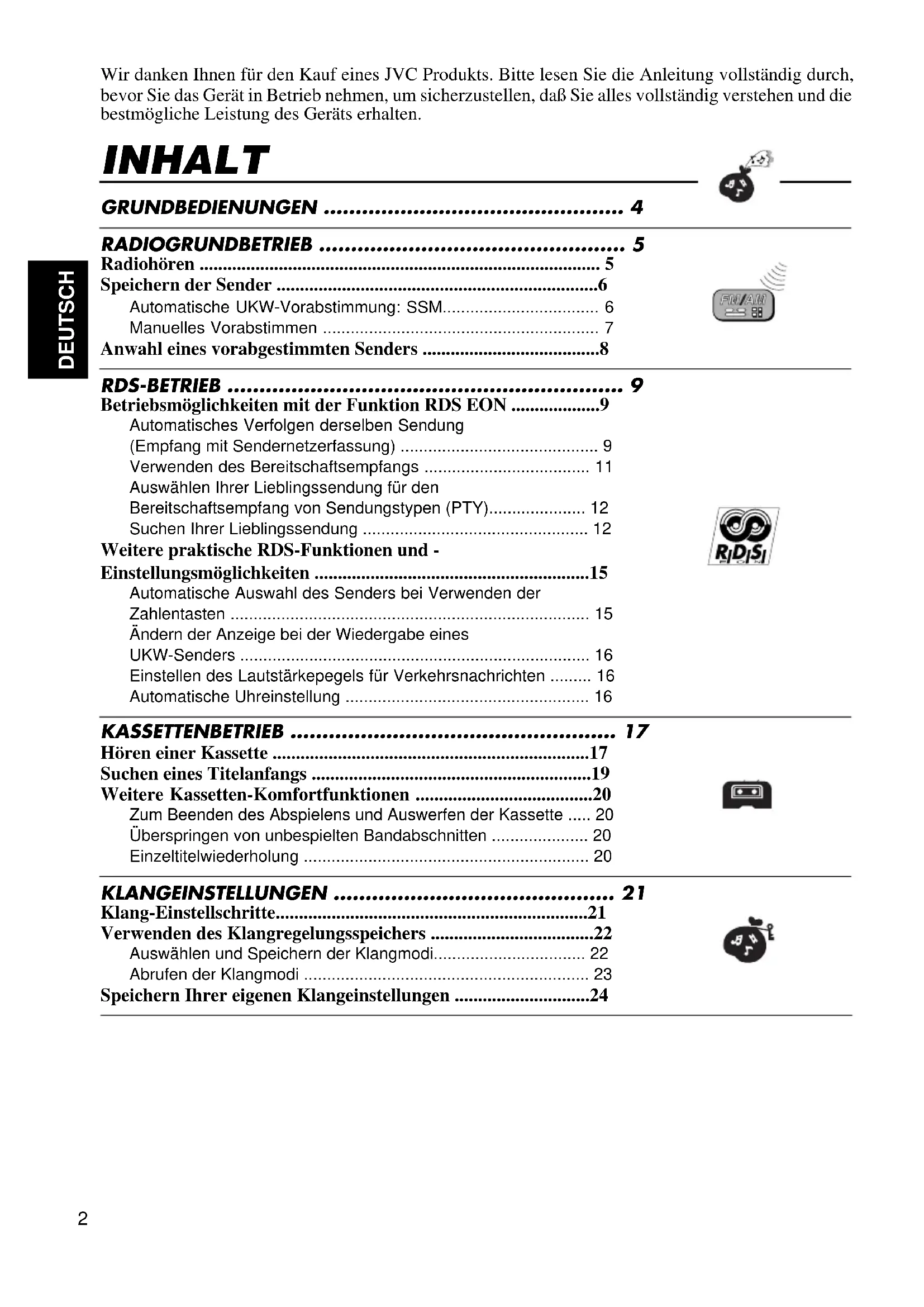 - Wow & Flutter: 0.11% (WRMS) Fast-Wind Time: 105sec (C-60) Frenquency Response: 30 to 16,000 Hz (Normal tape) Signal-to-Noise Ratio: 56 dB Stereo Separation: 40dB GENERAL Power Requirement Operating Voltage: DC 14.4 V (11 V to 16 V allowance) Allowable Operational Temperature: 0˚C to +40˚C Grounding System: Negative ground Dimensions (W × H × D) Installation Size: 182 mm × 52 mm × 150 mm Panel Size: 188 mm × 58 mm × 14 mm Mass: 1.4 kg (excluding accessories) Design and specifications subject to change without notice. SPECIFICATIONS EN.41-42KS-FX650R/550R[E] 00.1.27, 10:16 AM422 DEUTSCH Wir danken Ihnen für den Kauf eines JVC Produkts. Bitte lesen Sie die Anleitung vollständig durch, bevor Sie das Gerät in Betrieb nehmen, um sicherzustellen, daß Sie alles vollständig verstehen und die bestmögliche Leistung des Geräts erhalten. INHALT GRUNDBEDIENUNGEN p. 4