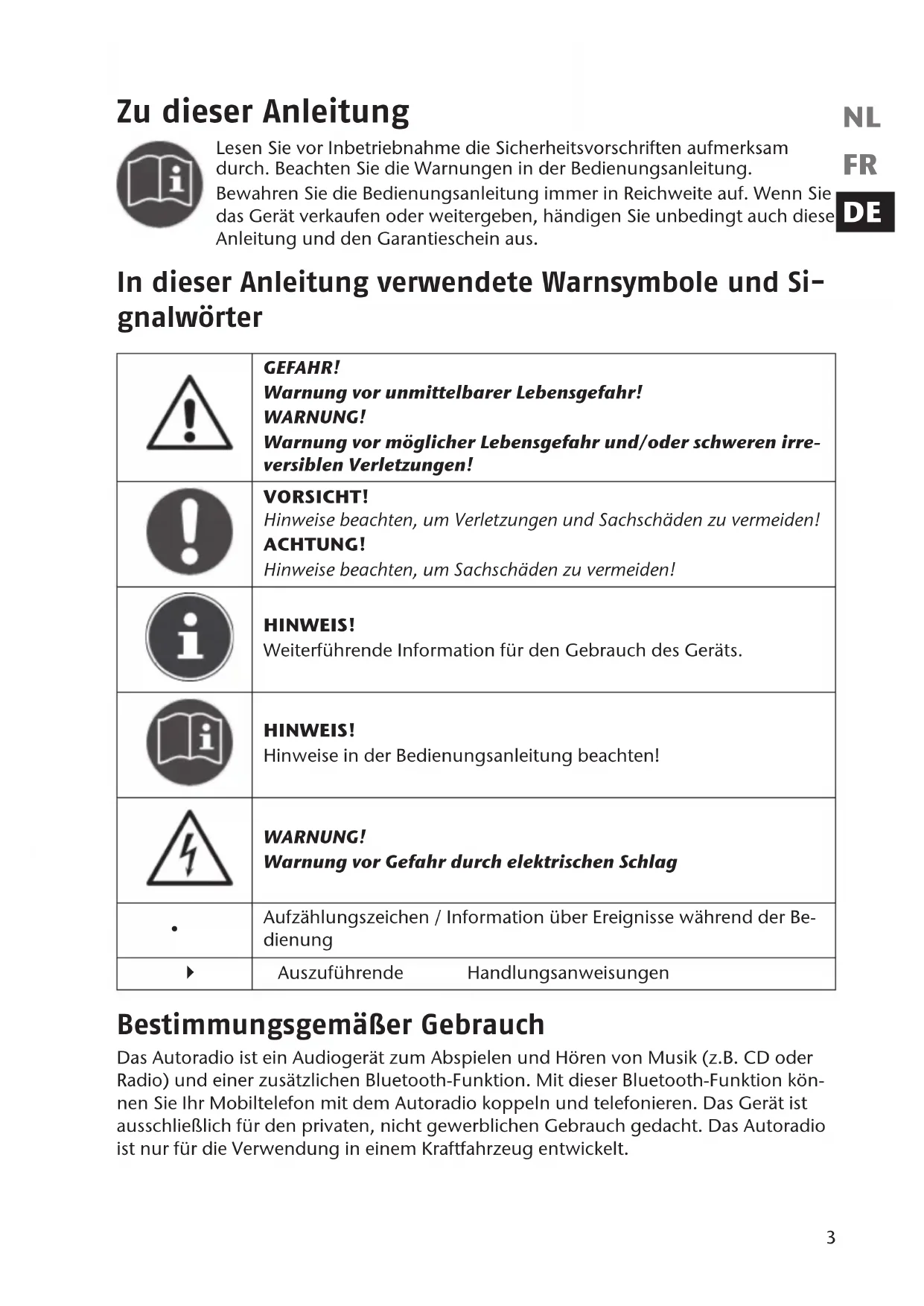 Aufzählungszeichen / Information über Ereignisse während der Be- dienung Auszuführende Handlungsanweisungen Bestimmungsgemäßer Gebrauch Das Autoradio ist ein Audiogerät zum Abspielen und Hören von Musik (z.B. CD oder Radio) und einer zusätzlichen Bluetooth-Funktion. Mit dieser Bluetooth-Funktion kön- nen Sie Ihr Mobiltelefon mit dem Autoradio koppeln und telefonieren. Das Gerät ist ausschließlich für den privaten, nicht gewerblichen Gebrauch gedacht. Das Autoradio ist nur für die Verwendung in einem Kraftfahrzeug entwickelt. 83328 DE ALDI BE Content Final.indd 383328 DE ALDI BE Content Final.indd 3 22.06.2011 09:00:5322.06.2011 09:00:534 Sicherheitshinweise Elektrische Geräte nicht in Kinderhände