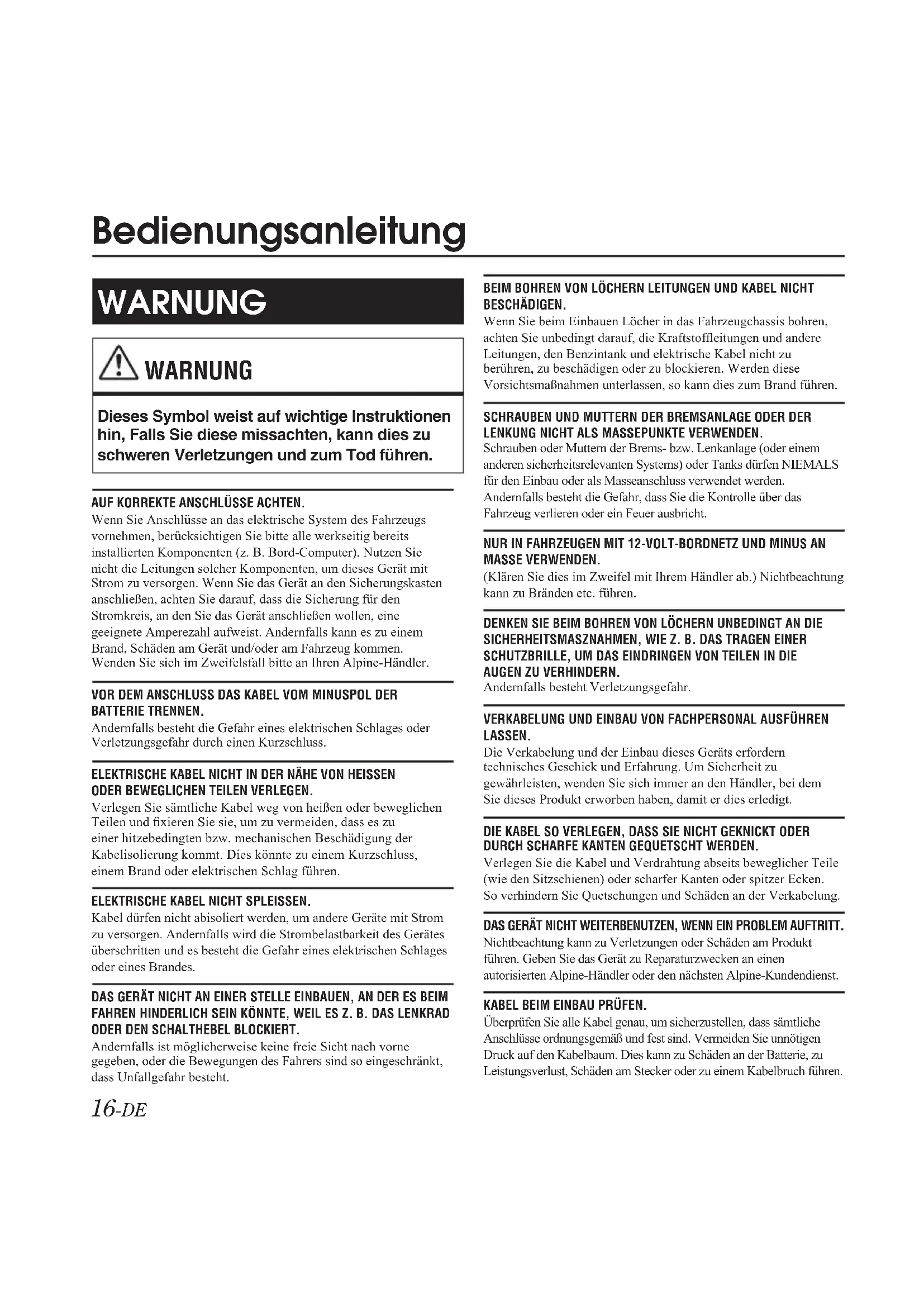 - Systemanschlüsse LP13-0113_Alpine_TUE-DAB1U_ML.indb 15 7/12/2013 6:59:45 PM16-DE Bedienungsanleitung AUF KORREKTE ANSCHLÜSSE ACHTEN.Wenn Sie Anschlüsse an das elektrische System des Fahrzeugs vornehmen, berücksichtigen Sie bitte alle werkseitig bereits installierten Komponenten (z. B. Bord-Computer). Nutzen Sie nicht die Leitungen solcher Komponenten, um dieses Gerät mit Strom zu versorgen. Wenn Sie das Gerät an den Sicherungskasten anschließen, achten Sie darauf, dass die Sicherung für den Stromkreis, an den Sie das Gerät anschließen wollen, eine geeignete Amperezahl aufweist. Andernfalls kann es zu einem Brand, Schäden am Gerät und/oder am Fahrzeug kommen. Wenden Sie sich im Zweifelsfall bitte an Ihren Alpine-Händler.VOR DEM ANSCHLUSS DAS KABEL VOM MINUSPOL DER BATTERIE TRENNEN.Andernfalls besteht die Gefahr eines elektrischen Schlages oder Verletzungsgefahr durch einen Kurzschluss.ELEKTRISCHE KABEL NICHT IN DER NÄHE VON HEISSEN ODER BEWEGLICHEN TEILEN VERLEGEN.Verlegen Sie sämtliche Kabel weg von heißen oder beweglichen Teilen und xieren Sie sie, um zu vermeiden, dass es zu einer hitzebedingten bzw. mechanischen Beschädigung der Kabelisolierung kommt. Dies könnte zu einem Kurzschluss, einem Brand oder elektrischen Schlag führen.ELEKTRISCHE KABEL NICHT SPLEISSEN.Kabel dürfen nicht abisoliert werden, um andere Geräte mit Strom zu versorgen. Andernfalls wird die Strombelastbarkeit des Gerätes überschritten und es besteht die Gefahr eines elektrischen Schlages oder eines Brandes.DAS GERÄT NICHT AN EINER STELLE EINBAUEN, AN DER ES BEIM FAHREN HINDERLICH SEIN KÖNNTE, WEIL ES Z. B. DAS LENKRAD ODER DEN SCHALTHEBEL BLOCKIERT.Andernfalls ist möglicherweise keine freie Sicht nach vorne gegeben, oder die Bewegungen des Fahrers sind so eingeschränkt, dass Unfallgefahr besteht. WARNUNG WARNUNG Dieses Symbol weist auf wichtige Instruktionen hin, Falls Sie diese missachten, kann dies zu schweren Verletzungen und zum Tod führen. BEIM BOHREN VON LÖCHERN LEITUNGEN UND KABEL NICHT BESCHÄDIGEN.Wenn Sie beim Einbauen Löcher in das Fahrzeugchassis bohren, achten Sie unbedingt darauf, die Kraftstofeitungen und andere Leitungen, den Benzintank und elektrische Kabel nicht zu berühren, zu beschädigen oder zu blockieren. Werden diese Vorsichtsmaßnahmen unterlassen, so kann dies zum Brand führen.SCHRAUBEN UND MUTTERN DER BREMSANLAGE ODER DER LENKUNG NICHT ALS MASSEPUNKTE VERWENDEN.Schrauben oder Muttern der Brems- bzw. Lenkanlage (oder einem anderen sicherheitsrelevanten Systems) oder Tanks dürfen NIEMALS für den Einbau oder als Masseanschluss verwendet werden. Andernfalls besteht die Gefahr, dass Sie die Kontrolle über das Fahrzeug verlieren oder ein Feuer ausbricht.NUR IN FAHRZEUGEN MIT 12-VOLT-BORDNETZ UND MINUS AN MASSE VERWENDEN.(Klären Sie dies im Zweifel mit Ihrem Händler ab.) Nichtbeachtung kann zu Bränden etc. führen.DENKEN SIE BEIM BOHREN VON LÖCHERN UNBEDINGT AN DIE SICHERHEITSMASZNAHMEN, WIE Z. B. DAS TRAGEN EINER SCHUTZBRILLE, UM DAS EINDRINGEN VON TEILEN IN DIE AUGENZU VERHINDERN.Andernfalls besteht Verletzungsgefahr.VERKABELUNG UND EINBAU VON FACHPERSONAL AUSFÜHREN LASSEN.Die Verkabelung und der Einbau dieses Geräts erfordern technisches Geschick und Erfahrung. Um Sicherheit zu gewährleisten, wenden Sie sich immer an den Händler, bei dem Sie dieses Produkt erworben haben, damit er dies erledigt.DIE KABEL SO VERLEGEN, DASS SIE NICHT GEKNICKT ODER DURCH SCHARFE KANTEN GEQUETSCHT WERDEN.Verlegen Sie die Kabel und Verdrahtung abseits beweglicher Teile (wie den Sitzschienen) oder scharfer Kanten oder spitzer Ecken. So verhindern Sie Quetschungen und Schäden an der Verkabelung.DAS GERÄT NICHT WEITERBENUTZEN, WENN EIN PROBLEM AUFTRITT.Nichtbeachtung kann zu Verletzungen oder Schäden am Produkt führen. Geben Sie das Gerät zu Reparaturzwecken an einen autorisierten Alpine-Händler oder den nächsten Alpine-Kundendienst.KABEL BEIM EINBAU PRÜFEN.Überprüfen Sie alle Kabel genau, um sicherzustellen, dass sämtliche Anschlüsse ordnungsgemäß und fest sind. Vermeiden Sie unnötigen Druck auf den Kabelbaum. Dies kann zu Schäden an der Batterie, zu Leistungsverlust, Schäden am Stecker oder zu einem Kabelbruch führen.LP13-0113_Alpine_TUE-DAB1U_ML.indb 16 7/12/2013 6:59:46 PM17-DE p. 26