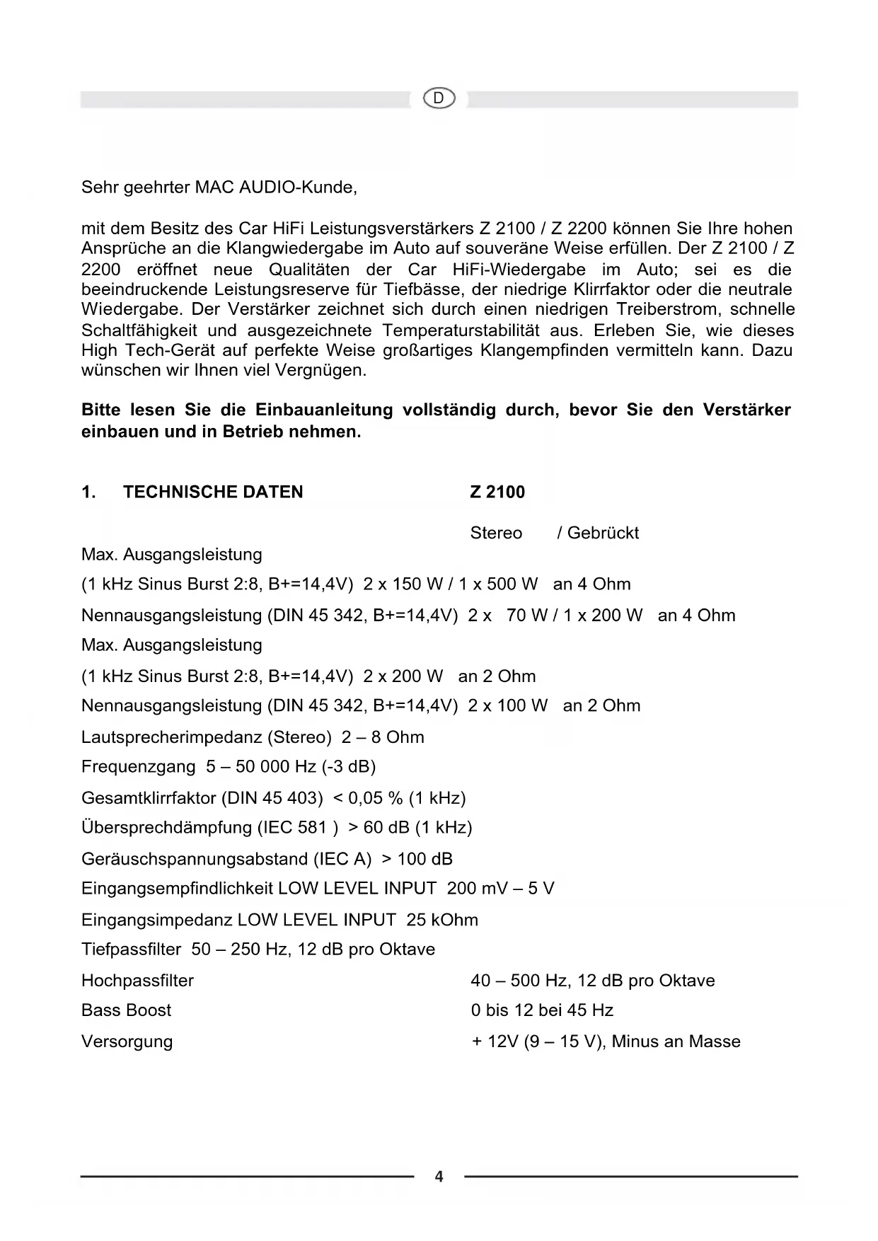 Sehr geehrter MAC AUDIO-Kunde, mit dem Besitz des Car HiFi Leistungsverstärkers Z 2100 / Z 2200 können Sie Ihre hohen Ansprüche an die Klangwiedergabe im Auto auf souveräne Weise erfüllen. Der Z 2100 / Z 2200 eröffnet neue Qualitäten der Car HiFi-Wiedergabe im Auto; sei es die beeindruckende Leistungsreserve für Tiefbässe, der niedrige Klirrfaktor oder die neutrale Wiedergabe. Der Verstärker zeichnet sich durch einen niedrigen Treiberstrom, schnelle Schaltfähigkeit und ausgezeichnete Temperaturstabilität aus. Erleben Sie, wie dieses High Tech-Gerät auf perfekte Weise großartiges Klangempfinden vermitteln kann. Dazu wünschen wir Ihnen viel Vergnügen. Bitte lesen Sie die Einbauanleitung vollständig durch, bevor Sie den Verstärker einbauen und in Betrieb nehmen.