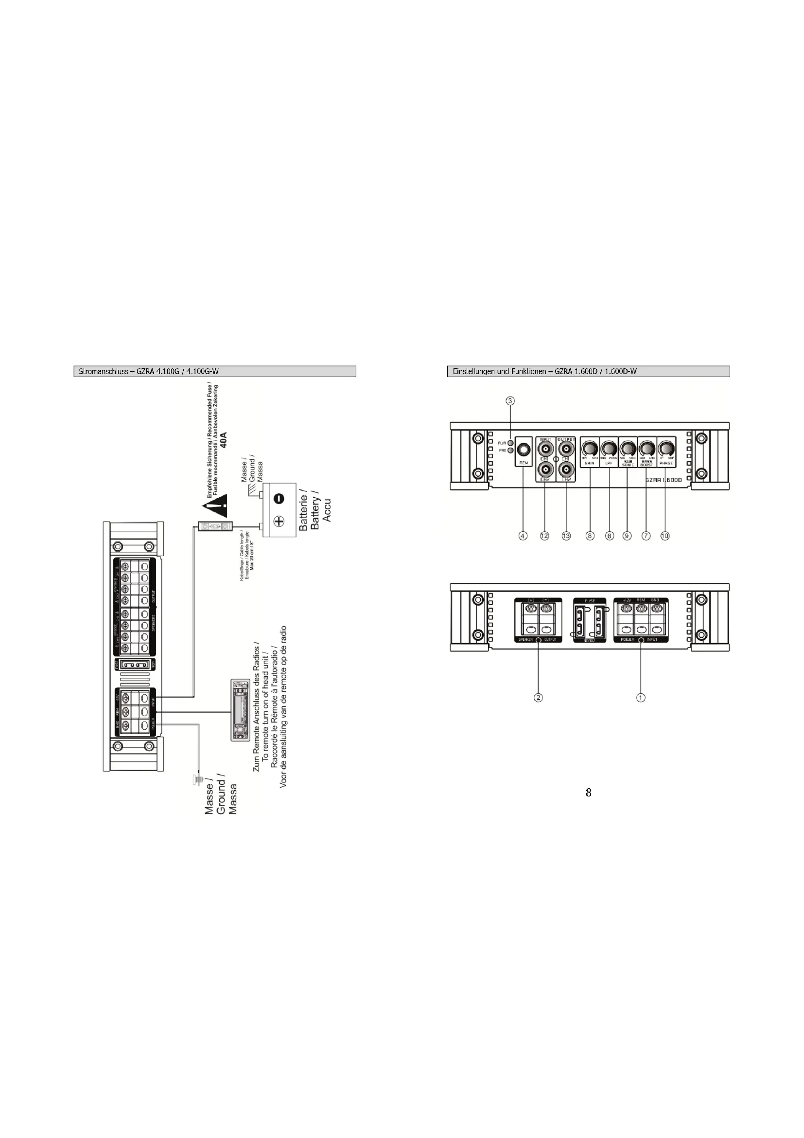 High Pass Regler (Subsonic) Setzen Sie den Filter - Schalter auf “HIGH”. Justieren Sie die variable HPF Übergangsfrequenz mit dem Regler auf die gewünschte Frequenz. Es werden alle Frequenzen unterhalb 5 – 4000 Hz gefiltert. 6 Low Pass Regler Für Subwoofer- und Kickwooferbetrieb - Es werden nur noch Frequenzen unterhalb von 40 bis 4000 Hz (GZRA 4.100G(-W)) / 40 – 500 Hz (GZRA 2.200G(-W)) oder 30 – 250 Hz (GZRA 1.600D(-W)) wiedergegeben (abhängig von der Reglerstellung des LPF Filters). Setzen Sie den Filter - Schalter auf “LOW”. Justieren Sie die variable LPF Frequenz mit dem Regler auf die gewünschte Frequenz. Bei der LPF-Einstellung ist ebenfalls der Highpass (Subsonic) aktiviert. Dies entspricht einem Bandpass Filter von 5 bis 4000 Hz (GZRA 4.100G(- W)) / 5 – 500 Hz (GZRA 2.200G(-W)) 7 Bass Boost Regler Zum Einstellen des Bass Boost Levels im Bereich von 0 bis +12 dB. 8 Gain Regler Mit diesem Regler regulieren Sie die Eingangsempfindlichkeit. 9 Subsonic Regler (GZRA 1.600D) Zum Einstellen des Subsonic Filters im Bereich von 5 bis 50Hz.
