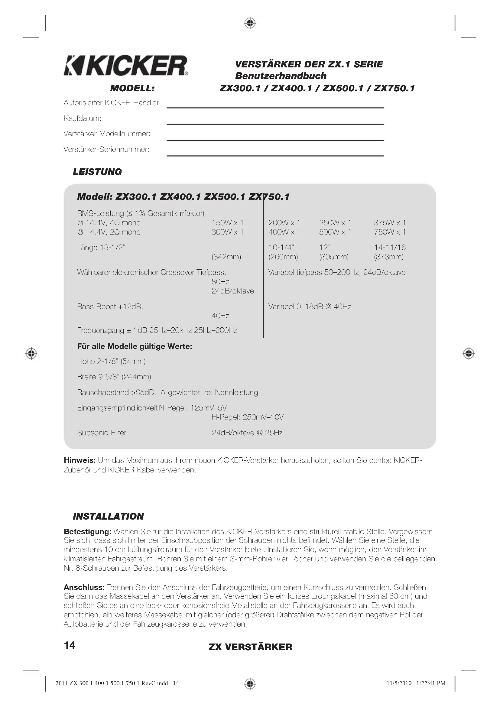 Prüfen Sie die Verstärkungseinstellungen und reduzieren Sie diese ggf. Verringerte Basswiedergabe? Wechseln Sie einen Lautsprecheranschluss an den Stereo-/ Subwooferkanälen von Positiv zu Negativ; wenn der Bass nun besser klingt, war der Lautsprecher phasenverschoben. Störung durch Erdung? KICKER-Verstärker sind mit den Autoradios aller Hersteller kompatibel. Manche Autoradios erfordern eventuell weitere Erdung, um Störungen am Audiosignal zu verhindern. Wenn Sie Probleme mit dem Autoradio haben, reicht es meist, ein Massekabel von den RCA-Ausgängen am Autoradio zur Karosserie zu verlegen. Hinweis: Moderne Hochleistungslautsprecher haben einen geringeren Gleichstrom-Widerstand, als dies früher der Fall war. Die KICKER Koaxial- und Komponentenlautsprecher haben eine Impedanz von 4 Ohm (manche Gleichspannungs-Widerstände können auch nur 3 Ohm betragen) und können mit jedem Verstärker zusammenarbeiten, der auf 4 Ohm ausgelegt ist. Wenn Sie zwei KICKER Koaxial- oder Komponentenlautsprecher an einem Kanal Ihres Lautsprechers verwenden wollen, müssen Sie diese in Reihe schalten. Dies verbessert die Soundqualität, verringert den Klirrfaktor und verringert die Wärmebelastung am Verstärker. Dies kann verhindern, dass sich der Verstärker aufgrund einer Überlastschaltung ausschaltet. 2011 ZX 300.1 400.1 500.1 750.1 RevC.indd 182011 ZX 300.1 400.1 500.1 750.1 RevC.indd 18 11/5/2010 1:22:43 PM11/5/2010 1:22:43 PM19 ACHTUNG: Wenn Sie das Auto mit Starthilfekabel starten, müssen Sie sicherstellen, dass die Kabel korrekt angeschlossen sind. Falsche Anschlüsse können zu einem Durchbrennen der Verstärkersicherung und einem Ausfall anderer wichtiger Systeme im Fahrzeug führen. Wenn Sie weitere Fragen zur Installation oder zum Betrieb Ihres neuen KICKER-Produkts haben, setzen Sie sich bitte mit Ihrem autorisierten KICKER-Fachhändler in Verbindung. Weitere Installationshinweise fi nden Sie, indem Sie auf der KICKER-Startseite (www.kicker.com) auf die Registerkarte SUPPORT klicken. Wählen Sie das Register TECHNICAL SUPPORT und dann das gewünschte Thema, um die entsprechenden Informationen anzuzeigen oder herunterzuladen. Wenn Sie spezifi sche oder nicht beantwortete Fragen haben, erreichen Sie den Kundendienst unter support@kicker.com oder telefonisch unter +1 (405) 624-8583. ZX300.1 225 x 1 @ 4 ohms, 14.4V GS, 1% Klirrfaktor, CEA-2006 (Watts) Rauschabstand -96dB CEA-2006 (ref: 1W, A-gewichtet) ZX400.1 200 x 1 @ 4 ohms, 14.4V GS, 1% Klirrfaktor, CEA-2006 (Watts) Rauschabstand -77dB CEA-2006 (ref: 1W, A-gewichtet) ZX500.1 250 x 1 @ 4 ohms, 14.4V GS, 1% Klirrfaktor, CEA-2006 (Watts) Rauschabstand -74dB CEA-2006 (ref: 1W, A-gewichtet) ZX750.1 375 x 1 @ 4 ohms, 14.4V GS, 1% Klirrfaktor, CEA-2006 (Watts) Rauschabstand -68dB CEA-2006 (ref: 1W, A-gewichtet) 2011 ZX 300.1 400.1 500.1 750.1 RevC.indd 192011 ZX 300.1 400.1 500.1 750.1 RevC.indd 19 11/5/2010 1:22:43 PM11/5/2010 1:22:43 PM20 AMPLIFICATEUR ZX Modèle: ZX300.1 ZX400.1 ZX500.1 ZX750.1 Puissance Effi cace @ 14.4V, 4Ω mono, 1% THD+N @ 14.4V, 2Ω mono, 1% THD+N 150W x 1 300W x 1 200W x 1 400W x 1 250W x 1 500W x 1 375W x 1 750W x 1 Longueur 13-1/2” (342mm) 10-1/4” (260mm) 12” (305mm) 14-11/16 (373mm) Filtre Électronique Sélectionnable Passe-bas, 80Hz, 24dB/octave Passe-bas variable de 50–200Hz, 24dB/octave Amplifi cation des Graves +12dB, 40Hz Variable 0–18dB @ 40Hz Réponse en Fréquence ± 1dB 25Hz–20kHz 25Hz–200Hz Spécifi cations communes à tous les modèles : Hauteur 2-1/8” (54mm) Largeur 9-5/8” (244mm) Rapport Signal sur Bruit >95dB, une puissance nominale Sensibilité d’Entrée Bas niveau: 125mV–5V Haut niveau: 250mV–10V Filtre Subsonique 24dB/octave @ 25Hz AMPLIFICATEUR SÉRIE ZX.1 Manuel d’utilisation INSTALLATION Montage: Choisissez un emplacement de structure saine pour monter votre amplifi cateur KICKER. Assurez- vous que l’arrière de l’emplacement où vous allez enfoncer les vis ne comporte aucun élément. Choisissez un endroit assurant au moins 10 cm (4 po) de dégagement de ventilation ouverte pour l’amplifi cateur. Si possible, montez l’amplifi cateur dans l’habitacle passager climatisé. Percez quatre trous à l’aide d’un foret de 3 mm (7/64 po) et utilisez les vis nº 8 fournies pour monter l’amplifi cateur. Câblage: Débranchez la batterie du véhicule pour éviter un court-circuit. Ensuite, raccordez le fi l de masse à l’amplifi cateur. Le fi l de masse doit être le plus court possible, de 60 cm (24 po) maximum. Raccordez-le à une partie métallique solide du châssis du véhicule, ne comportant ni peinture ni rouille. Il est recommandé d’ajouter un fi l de masse supplémentaire de même calibre (ou de calibre supérieur) entre la borne négative de la batterie et le châssis du véhicule. PERFORMANCES Revendeur agréé KICKER : Date d’achat : Numéro de modèle de l’amplifi cateur : Numéro de série de l’amplifi cateur : Remarque : Pour optimiser les performances de votre nouvel amplifi cateur KICKER, il est conseillé d’utiliser des accessoires et des câbles KICKER d’origine.