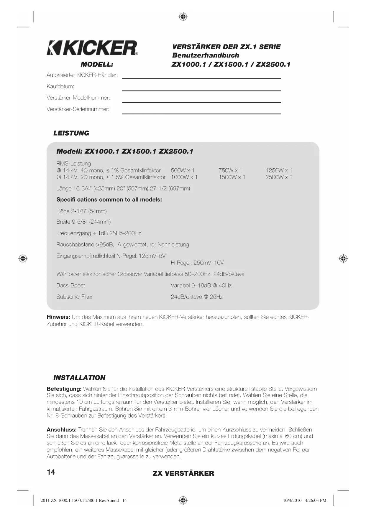 Prüfen Sie die Verstärkungseinstellungen und reduzieren Sie diese ggf. Verringerte Basswiedergabe? Wechseln Sie einen Lautsprecheranschluss an den Stereo-/Subwooferkanälen von Positiv zu Negativ; wenn der Bass nun besser klingt, war der Lautsprecher phasenverschoben. Störung durch Erdung? KICKER-Verstärker sind mit den Autoradios aller Hersteller kompatibel. Manche Autoradios erfordern eventuell weitere Erdung, um Störungen am Audiosignal zu verhindern. Wenn Sie Probleme mit dem Autoradio haben, reicht es meist, ein Massekabel von den RCA-Ausgängen am Autoradio zur Karosserie zu verlegen. Hinweis: Moderne Hochleistungslautsprecher haben einen geringeren Gleichstrom-Widerstand, als dies früher der Fall war. Die KICKER Koaxial- und Komponentenlautsprecher haben eine Impedanz von 4 Ohm (manche Gleichspannungs-Widerstände können auch nur 3 Ohm betragen) und können mit jedem Verstärker zusammenarbeiten, der auf 4 Ohm ausgelegt ist. Wenn Sie zwei KICKER Koaxial- oder Komponentenlautsprecher an einem Kanal Ihres Lautsprechers verwenden wollen, müssen Sie diese in Reihe schalten. Dies verbessert die Soundqualität, verringert den Klirrfaktor und verringert die Wärmebelastung am Verstärker. Dies kann verhindern, dass sich der Verstärker aufgrund einer Überlastschaltung ausschaltet. 2011 ZX 1000.1 1500.1 2500.1 RevA.indd 182011 ZX 1000.1 1500.1 2500.1 RevA.indd 18 10/4/2010 4:26:05 PM10/4/2010 4:26:05 PM19 ACHTUNG: Wenn Sie das Auto mit Starthilfekabel starten, müssen Sie sicherstellen, dass die Kabel korrekt angeschlossen sind. Falsche Anschlüsse können zu einem Durchbrennen der Verstärkersicherung und einem Ausfall anderer wichtiger Systeme im Fahrzeug führen. Wenn Sie weitere Fragen zur Installation oder zum Betrieb Ihres neuen KICKER-Produkts haben, setzen Sie sich bitte mit Ihrem autorisierten KICKER-Fachhändler in Verbindung. Weitere Installationshinweise fi nden Sie, indem Sie auf der KICKER-Startseite (www.kicker.com) auf die Registerkarte SUPPORT klicken. Wählen Sie das Register TECHNICAL SUPPORT und dann das gewünschte Thema, um die entsprechenden Informationen anzuzeigen oder herunterzuladen. Wenn Sie spezifi sche oder nicht beantwortete Fragen haben, erreichen Sie den Kundendienst unter support@kicker.com oder telefonisch unter +1 (405) 624-8583. ZX1000.1 500 x 1 @ 4 ohms, 14.4V GS, 1% Klirrfaktor, CEA-2006 (Watts) Rauschabstand -62dB CEA-2006 (ref: 1W, A-gewichtet) ZX1500.1 750 x 1 @ 4 ohms, 14.4V GS, 1% Klirrfaktor, CEA-2006 (Watts) Rauschabstand -55dB CEA-2006 (ref: 1W, A-gewichtet) ZX2500.1 1500 x 1 @ 4 ohms, 14.4V GS, 1% Klirrfaktor, CEA-2006 (Watts) Rauschabstand -65dB CEA-2006 (ref: 1W, A-gewichtet) 2011 ZX 1000.1 1500.1 2500.1 RevA.indd 192011 ZX 1000.1 1500.1 2500.1 RevA.indd 19 10/4/2010 4:26:05 PM10/4/2010 4:26:05 PM20 AMPLIFICATEUR ZX Modèle: ZX1000.1 ZX1500.1 ZX2500.1 Puissance Effi cace @ 14.4V, 4Ω mono, 1% THD+N @ 14.4V, 2Ω mono, 1.5% THD+N 500W x 1 1000W x 1 750W x 1 1500W x 1 1250W x 1 2500W x 1 Longueur 16-3/4” (425mm) 20” (507mm) 27-1/2 (697mm) Spécifi cations communes à tous les modèles : Hauteur 2-1/8” (54mm) Largeur 9-5/8” (244mm) Réponse en Fréquence ± 1dB 25Hz–200Hz Rapport Signal sur Bruit >95dB, une puissance nominale Sensibilité d’Entrée Bas niveau: 125mV–5V Haut niveau: 250mV–10V Filtre Électronique Sélectionnable Passe-bas variable de 50–200Hz, 24dB/octave Amplifi cation des Graves Variable 0–18dB @ 40Hz Filtre Subsonique 24dB/octave @ 25Hz AMPLIFICATEUR SÉRIE ZX.1 Manuel d’utilisation INSTALLATION Montage: Choisissez un emplacement de structure saine pour monter votre amplifi cateur KICKER. Assurez- vous que l’arrière de l’emplacement où vous allez enfoncer les vis ne comporte aucun élément. Choisissez un endroit assurant au moins 10 cm (4 po) de dégagement de ventilation ouverte pour l’amplifi cateur. Si possible, montez l’amplifi cateur dans l’habitacle passager climatisé. Percez quatre trous à l’aide d’un foret de 3 mm (7/64 po) et utilisez les vis nº 8 fournies pour monter l’amplifi cateur. Câblage: Débranchez la batterie du véhicule pour éviter un court-circuit. Ensuite, raccordez le fi l de masse à l’amplifi cateur. Le fi l de masse doit être le plus court possible, de 60 cm (24 po) maximum. Raccordez-le à une partie métallique solide du châssis du véhicule, ne comportant ni peinture ni rouille. Il est recommandé d’ajouter un fi l de masse supplémentaire de même calibre (ou de calibre supérieur) entre la borne négative de la batterie et le châssis du véhicule. PERFORMANCES Revendeur agréé KICKER : Date d’achat : Numéro de modèle de l’amplifi cateur : Numéro de série de l’amplifi cateur : Remarque : Pour optimiser les performances de votre nouvel amplifi cateur KICKER, il est conseillé d’utiliser des accessoires et des câbles KICKER d’origine.