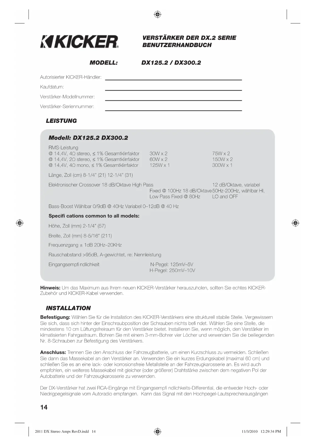 Prüfen Sie die Verstärkungseinstellungen und reduzieren Sie diese ggf. Verringerte Basswiedergabe? Wechseln Sie einen Lautsprecheranschluss an den Stereo-/Subwooferkanälen von Positiv zu Negativ; wenn der Bass nun besser klingt, war der Lautsprecher phasenverschoben. Störung durch Erdung? KICKER-Verstärker sind mit den Autoradios aller Hersteller kompatibel. Manche Autoradios erfordern eventuell weitere Erdung, um Störungen am Audiosignal zu verhindern. Wenn Sie Probleme mit dem Autoradio haben, reicht es meist, ein Massekabel von den RCA-Ausgängen am Autoradio zur Karosserie zu verlegen. Hinweis: Moderne Hochleistungslautsprecher haben einen geringeren Gleichstrom-Widerstand, als dies früher der Fall war. Die KICKER Koaxial- und Komponentenlautsprecher haben eine Impedanz von 4 Ohm (manche Gleichspannungs-Widerstände können auch nur 3 Ohm betragen) und können mit jedem Verstärker zusammenarbeiten, der auf 4 Ohm ausgelegt ist. Wenn Sie zwei KICKER Koaxial- oder Komponentenlautsprecher an einem Kanal Ihres Lautsprechers verwenden wollen, müssen Sie diese in Reihe schalten. Dies verbessert die Soundqualität, verringert den Klirrfaktor und verringert die Wärmebelastung am Verstärker. Dies kann verhindern, dass sich der Verstärker aufgrund einer Überlastschaltung ausschaltet. 2011 DX Stereo Amps RevD.indd 182011 DX Stereo Amps RevD.indd 18 11/3/2010 12:29:36 PM11/3/2010 12:29:36 PM19 DX125.2 30 x 2 @ 4 ohms, 14.4GS, 1% Klirrfaktor, CEA-2006 (Watts) Rauschabstand -84dB CEA-2006 (ref: 1W, A-gewichtet) DX300.2 75 x 2 @ 4 ohm, 14.4GS, 1% Klirrfaktor, CEA-2006 (Watts) Rauschabstand -85dB CEA-2006 (ref: 1W, A-gewichtet) ACHTUNG: Wenn Sie das Auto mit Starthilfekabel starten, müssen Sie sicherstellen, dass die Kabel korrekt angeschlossen sind. Falsche Anschlüsse können zu einem Durchbrennen der Verstärkersicherung und einem Ausfall anderer wichtiger Systeme im Fahrzeug führen. Wenn Sie weitere Fragen zur Installation oder zum Betrieb Ihres neuen KICKER-Produkts haben, setzen Sie sich bitte mit Ihrem autorisierten KICKER-Fachhändler in Verbindung. Weitere Installationshinweise fi nden Sie, indem Sie auf der KICKER-Startseite (www.kicker.com) auf die Registerkarte SUPPORT klicken. Wählen Sie das Register TECHNICAL SUPPORT und dann das gewünschte Thema, um die entsprechenden Informationen anzuzeigen oder herunterzuladen. Wenn Sie spezifi sche oder nicht beantwortete Fragen haben, erreichen Sie den Kundendienst unter support@kicker.com oder telefonisch unter +1 (405) 624-8583. 2011 DX Stereo Amps RevD.indd 192011 DX Stereo Amps RevD.indd 19 11/3/2010 12:29:37 PM11/3/2010 12:29:37 PM20