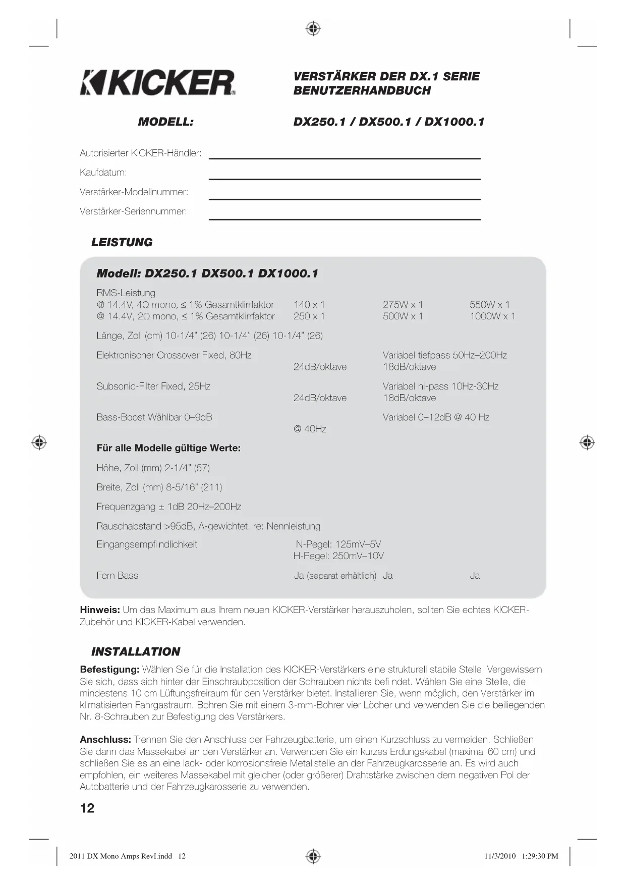 Prüfen Sie die Verstärkungseinstellungen und reduzieren Sie diese ggf. 2011 DX Mono Amps RevI.indd 152011 DX Mono Amps RevI.indd 15 11/3/2010 1:29:31 PM11/3/2010 1:29:31 PM16 Verringerte Basswiedergabe? Wechseln Sie einen Lautsprecheranschluss an den Stereo-/Subwooferkanälen von Positiv zu Negativ; wenn der Bass nun besser klingt, war der Lautsprecher phasenverschoben. Störung durch Erdung? KICKER-Verstärker sind mit den Autoradios aller Hersteller kompatibel. Manche Autoradios erfordern eventuell weitere Erdung, um Störungen am Audiosignal zu verhindern. Wenn Sie Probleme mit dem Autoradio haben, reicht es meist, ein Massekabel von den RCA-Ausgängen am Autoradio zur Karosserie zu verlegen. Hinweis: Moderne Hochleistungslautsprecher haben einen geringeren Gleichstrom-Widerstand, als dies früher der Fall war. Die KICKER Koaxial- und Komponentenlautsprecher haben eine Impedanz von 4 Ohm (manche Gleichspannungs-Widerstände können auch nur 3 Ohm betragen) und können mit jedem Verstärker zusammenarbeiten, der auf 4 Ohm ausgelegt ist. Wenn Sie zwei KICKER Koaxial- oder Komponentenlautsprecher an einem Kanal Ihres Lautsprechers verwenden wollen, müssen Sie diese in Reihe schalten. Dies verbessert die Soundqualität, verringert den Klirrfaktor und verringert die Wärmebelastung am Verstärker. Dies kann verhindern, dass sich der Verstärker aufgrund einer Überlastschaltung ausschaltet. ACHTUNG: Wenn Sie das Auto mit Starthilfekabel starten, müssen Sie sicherstellen, dass die Kabel korrekt angeschlossen sind. Falsche Anschlüsse können zu einem Durchbrennen der Verstärkersicherung und einem Ausfall anderer wichtiger Systeme im Fahrzeug führen. Wenn Sie weitere Fragen zur Installation oder zum Betrieb Ihres neuen KICKER-Produkts haben, setzen Sie sich bitte mit Ihrem autorisierten KICKER-Fachhändler in Verbindung. Weitere Installationshinweise fi nden Sie, indem Sie auf der KICKER-Startseite (www.kicker.com) auf die Registerkarte SUPPORT klicken. Wählen Sie das Register TECHNICAL SUPPORT und dann das gewünschte Thema, um die entsprechenden Informationen anzuzeigen oder herunterzuladen. Wenn Sie spezifi sche oder nicht beantwortete Fragen haben, erreichen Sie den Kundendienst unter support@kicker.com oder telefonisch unter +1 (405) 624-8583. DX250.1 140 x 1 @ 4 ohms, 14,4V GS, 1% Klirrfaktor, CEA-2006 (Watts) Rauschabstand -75dB CEA-2006 (ref: 1W, A-gewichtet) DX500.1 275 x 1 @ 4 ohms, 14,4V GS, 1% Klirrfaktor, CEA-2006 (Watts) Rauschabstand -75dB CEA-2006 (ref: 1W, A-gewichtet) DX1000.1 500 x 1 @ 4 ohms, 14,4V GS, 1% Klirrfaktor, CEA-2006 (Watts) Rauschabstand -75dB CEA-2006 (ref: 1W, A-gewichtet) 2011 DX Mono Amps RevI.indd 162011 DX Mono Amps RevI.indd 16 11/3/2010 1:29:32 PM11/3/2010 1:29:32 PM17 Modèle: DX250.1 DX500.1 DX1000.1 Puissance Effi cace @ 14.4V, 4Ω mono, 1% THD+N @ 14.4V, 2Ω mono, 1% THD+N 140 x 1 250 x 1 275W x 1 500W x 1 550W x 1 1000W x 1 Longueur, pouces (cm) 10-1/4” (26) 10-1/4” (26) 10-1/4” (26) Filtre Électronique Fixé, 80Hz 24dB/octave Passe-bas variable de 50Hz–200Hz 18dB/octave Filtre Subsonique Fixé, 25Hz 24dB/octave Passe-haut variable de 10Hz-30Hz 18dB/octave Amplifi cation des Graves Sélectionnables 0–9dB @ 40Hz Variable 0–12dB @ 40Hz Spécifi cations communes à tous les modèles : Hauteur, pouces (mm) 2-1/4” (57) Largeur, pouces (mm) 8-5/16” (211) Réponse en Fréquence ± 1dB 20Hz–200Hz Rapport Signal sur Bruit >95dB, une puissance nominale Sensibilité d’Entrée Bas niveau: 125mV–5V Haut niveau: 250mV–10V Télécommande Des Graves Oui (vendu séparément) Oui Oui