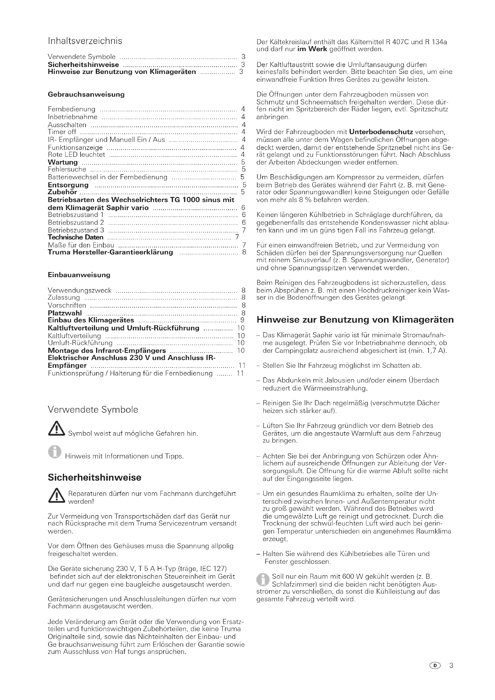 FAN Hr. COOL MODE FAN MODE COOL LOWTEMP.TIMERCOOL HIGHCOOL FAN LO WFAN HIGH TEMP. MODE TIMER RESEND ON / OFF Saphir vario Einbaubeispiel 1 Klimagerät Saphir vario 2a Versorgungsluft-Zufuhr 2b Versorgungsluft-Abgang 3a Kaltluft-Austritte 3b Umluft-Ansaugung 4 Flexible Raumluft- ansaugung (optional) Installation example 1 Air-conditioning unit Saphir vario 2a Supply air intake 2b Supply air outlet 3a Cold air outlet 3b Circulatory air return 4 Flexible room air intake (optional) Exemple de montage 1 Climatiseur Saphir vario 2a Amenée en air d'alimentation 2b Sortie de l'air d'alimentation 3a Sorties d'air froid 3b Aspiration de l'air de circulation 4 Aspiration d‘air ambiant flexible (en option) Inbouwvoorbeeld 1 Airconditioning Saphir vario 2a Voedingslucht-toevoer 2b Voedingslucht-afvoer 3a Koudlucht-uittreding 3b Circulatielucht-aanzuiging 4 Flexibele binnenluchtaanzuiging (optioneel) Esempio di montaggio 1 Condizionatore Saphir vario 2a Ingresso dell'aria di alimentazione 2b Uscita dell'aria di alimentazione 3a Uscite aria fredda 3b Aspirazione aria di ricircolo 4 Tubo flessibile di aspirazione aria interna (optional) Monteringseksempel 1 Klimaanlæg Saphir vario 2a Forsyningsluftindgang 2b Forsyningsluftudgang 3a Koldluftudgang 3b Cirkulationsluftindtag 4 Fleksibel rumluftindsugning (ekstraudstyr) Ejemplo de montaje 1 Acondicionador de aire Saphir vario 2a Entrada del aire de alimentación 2b Salida del aire de alimentación 3a Salidas del aire frío 3b Succión del aire de circulación 4 Aspiración flexible de aire ambiente (opcional)3 Verwendete Symbole Symbol weist auf mögliche Gefahren hin. Hinweis mit Informationen und Tipps. Sicherheitshinweise Reparaturen dürfen nur vom Fachmann durchgeführt werden! Zur Vermeidung von Transportschäden darf das Gerät nur nach Rücksprache mit dem Truma Servicezentrum versandt werden. Vor dem Öffnen des Gehäuses muss die Spannung allpolig freigeschaltet werden. Die Geräte sicherung 230 V, T 5 A H-Typ (träge, IEC 127) befindet sich auf der elektronischen Steuereinheit im Gerät und darf nur gegen eine baugleiche ausgetauscht werden. Gerätesicherungen und Anschlussleitungen dürfen nur vom Fachmann ausgetauscht werden. Jede Veränderung am Gerät oder die Verwendung von Ersatz- teilen und funktionswichtigen Zubehörteilen, die keine Truma Originalteile sind, sowie das Nichteinhalten der Einbau- und Ge brauchsanweisung führt zum Erlöschen der Garantie sowie zum Ausschluss von Haf tungs ansprüchen. Der Kältekreislauf enthält das Kältemittel R 407C und R 134a und darf nur im Werk geöffnet werden. Der Kaltluftaustritt sowie die Umluftansaugung dürfen keinesfalls behindert werden. Bitte beachten Sie dies, um eine einwandfreie Funktion Ihres Gerätes zu gewähr leisten. Die Öffnungen unter dem Fahrzeugboden müssen von Schmutz und Schneematsch freigehalten werden. Diese dür- fen nicht im Spritzbereich der Räder liegen, evtl. Spritzschutz anbringen. Wird der Fahrzeugboden mit Unterbodenschutz versehen, müssen alle unter dem Wagen befindlichen Öffnungen abge- deckt werden, damit der entstehende Spritznebel nicht ins Ge- rät gelangt und zu Funktionsstörungen führt. Nach Abschluss der Arbeiten Abdeckungen wieder entfernen. Um Beschädigungen am Kompressor zu vermeiden, dürfen beim Betrieb des Gerätes während der Fahrt (z. B. mit Gene- rator oder Spannungswandler) keine Steigungen oder Gefälle von mehr als 8 % befahren werden. Keinen längeren Kühlbetrieb in Schräglage durchführen, da gegebenenfalls das entstehende Kondenswasser nicht ablau- fen kann und im un güns tigen Fall ins Fahrzeug gelangt. Für einen einwandfreien Betrieb, und zur Vermeidung von Schäden dürfen bei der Spannungsversorgung nur Quellen mit reinem Sinusverlauf (z. B. Spannungswandler, Generator) und ohne Spannungsspitzen verwendet werden. Beim Reinigen des Fahrzeugbodens ist sicherzustellen, dass beim Absprühen z. B. mit einen Hochdruckreiniger kein Was- ser in die Bodenöffnungen des Gerätes gelangt. Hinweise zur Benutzung von Klimageräten Das Klimagerät Saphir vario ist für minimale Stromaufnah- me ausgelegt. Prüfen Sie vor Inbetriebnahme dennoch, ob der Campingplatz ausreichend abgesichert ist (min. 1,7 A). Stellen Sie Ihr Fahrzeug möglichst im Schatten ab. Das Abdunkeln mit Jalousien und/oder einem Überdach reduziert die Wärmeeinstrahlung. Reinigen Sie Ihr Dach regelmäßig (verschmutzte Dächer heizen sich stärker auf). Lüften Sie Ihr Fahrzeug gründlich vor dem Betrieb des Gerätes, um die angestaute Warmluft aus dem Fahrzeug zu bringen. Achten Sie bei der Anbringung von Schürzen oder Ähn- lichem auf ausreichende Öffnungen zur Ableitung der Ver- sorgungsluft. Die Öffnung für die warme Abluft sollte nicht auf der Eingangsseite liegen. Um ein gesundes Raumklima zu erhalten, sollte der Un- terschied zwischen Innen- und Außentemperatur nicht zu groß gewählt werden. Während des Betriebes wird die umgewälzte Luft ge reinigt und getrocknet. Durch die Trocknung der schwül-feuchten Luft wird auch bei gerin- gen Temperatur unterschieden ein angenehmes Raumklima erzeugt. Halten Sie während des Kühlbetriebes alle Türen und Fenster geschlossen. Soll nur ein Raum mit 600 W gekühlt werden (z. B. Schlafzimmer) sind die beiden nicht benötigten Aus- strömer zu verschließen, da sonst die Kühlleistung auf das gesamte Fahrzeug verteilt wird.