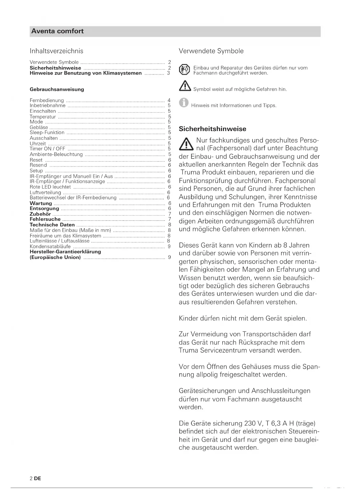 - Hersteller-Garantieerklärung (Europäische Union) Aventa comfort Verwendete Symbole Einbau und Reparatur des Gerätes dürfen nur vom Fachmann durchgeführt werden. Symbol weist auf mögliche Gefahren hin. Hinweis mit Informationen und Tipps. Sicherheitshinweise Nur fachkundiges und geschultes Perso- nal (Fachpersonal) darfunter Beachtung der Einbau- und Gebrauchsanweisung und der aktuellen anerkannten Regeln der Technik das Truma Produkt einbauen, reparieren und die Funktionsprüfung durchführen. Fachpersonal sind Personen, die auf Grund ihrer fachlichen Ausbildung und Schulungen, ihrer Kenntnisse und Erfahrungen mit den Truma Produkten und den einschlägigen Normen die notwen- digen Arbeiten ordnungsgemäß durchführen und mögliche Gefahren erkennen können. Dieses Gerät kann von Kindern ab 8 Jahren und darüber sowie von Personen mit verrin- gerten physischen, sensorischen oder menta- len Fähigkeiten oder Mangel an Erfahrung und Wissen benutzt werden, wenn sie beaufsich- tigt oder bezüglich des sicheren Gebrauchs des Gerätes unterwiesen wurden und die dar- aus resultierenden Gefahren verstehen. Kinder dürfen nicht mit dem Gerät spielen. Zur Vermeidung von Transportschäden darf das Gerät nur nach Rücksprache mit dem Truma Servicezentrum versandt werden. Vor dem Öffnen des Gehäuses muss die Span- nung allpolig freigeschaltet werden. Gerätesicherungen und Anschlussleitungen dürfen nur vom Fachmann ausgetauscht werden. Die Geräte sicherung 230 V, T 6,3 A H (träge) befindet sich auf der elektronischen Steuerein- heit im Gerät und darf nur gegen eine bauglei- che ausgetauscht werden.3DE Zum Erlöschen von Gewährleistungs- und Ga- rantieansprüchen sowie zum Ausschluss von Haftungsansprüchen führen insbesondere: – Veränderungen am Gerät (einschließlich Zubehörteilen), – Verwendung von anderen als Truma Original- teilen als Ersatz- und Zubehörteile, – das Nichteinhalten der Einbau- und Gebrauchsanweisung. Außerdem erlischt die Betriebserlaubnis des Gerä tes und dadurch in manchen Ländern auch die Betriebserlaubnis des Fahrzeuges. Der Kältekreislauf enthält das Kältemit- tel R 407C und darf nur im Werk geöffnet werden. Die Lufteinlässe / Luftauslässe an der Au- ßeneinheit und an dem Luftverteiler dürfen keinesfalls behindert werden. Bitte beachten Sie dies, um eine einwandfreie Funktion Ihres Gerätes zu gewährleisten. Um eine Beschädigung am Gerät zu vermei- den, soll das Gerät mit einer Neigung > 8% nicht dauerhaft betrieben werden. Keinen längeren Kühlbetrieb in Schräglage durchführen, da gegebenenfalls das entste- hende Kondenswasser nicht ablaufen kann und im un günstigen Fall ins Fahrzeug gelangt. Für einen einwandfreien Betrieb und zur Ver- meidung von Schäden dürfen bei der Span- nungsversorgung nur Quellen mit reinem Sinusverlauf (z. B. Spannungswandler, Gene- rator) und ohne Spannungsspitzen verwendet werden. Beim Reinigen des Fahrzeugs ist sicherzu- stellen, dass beim Absprühen, z. B. mit einen Hochdruckreiniger, kein Wasser in das Gerät gelangt (z. B. nicht direkt in Geräteöffnungen sprühen). Der Einsatz / die Verwendung von Heiß- und Dampfreiniger ist nicht zulässig. Die Kondensatabläufe müssen während des Betriebs stets frei sein. Hinweise zur Benutzung von Klimasystemen Das Klimasystem ist für eine Stromaufnahme bis zu 4,2 A ausgelegt. Prüfen Sie vor Inbe- triebnahme, ob der Campingplatz ausreichend abgesichert ist (min. 6 A). Stellen Sie Ihr Fahrzeug möglichst im Schatten ab. Das Abdunkeln mit Jalousien reduziert die Wärmeeinstrahlung. Reinigen Sie Ihr Dach regelmäßig (ver- schmutzte Dächer heizen sich stärker auf). Lüften Sie Ihr Fahrzeug gründlich vor dem Be- trieb des Gerätes, um die angestaute Warm- luft aus dem Fahrzeug zu bringen. Um ein gesundes Raumklima zu erhalten, soll- te der Unterschied zwischen Innen- und Au- ßentemperatur nicht zu groß gewählt werden. Während des Betriebes wird die umgewälz- te Luft gereinigt und getrocknet. Durch die Trocknung der schwülfeuchten Luft wird auch bei geringen Temperatur unterschieden ein an- genehmes Raumklima erzeugt. Halten Sie während des Kühlbetriebes alle Tü- ren und Fenster geschlossen, damit es zu kei- ner Kondensatbildung am Luftverteiler kommt. Für schnelleres Abkühlen oder Aufheizen: – Gebläsestufe auf hoch, – Luftverteilung Front / Heck auf Mittelstellung, – Luftverteilung Boden / Decke auf Decke stellen.4 DE Mit einem mobilen Endgerät und der Truma App können Gebrauchsanweisungen im offline Modus angesehen werden. Die Gebrauchsanweisungen werden einmalig bei bestehender Funkverbindung heruntergeladen und auf dem mobilem Endgerät gespeichert. Fernbedienung Bild 1 Sleep-Funktion (nur im Kühlbetrieb) Besonders leiser Gebläsebetrieb durch Absenkung beider Gebläse p. 9