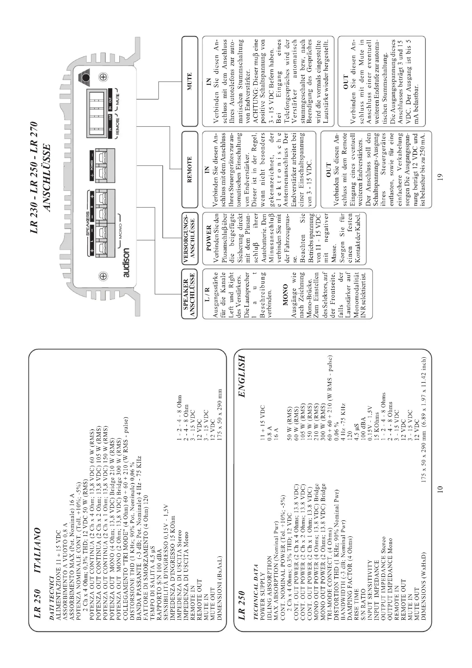 DIMENSIONS (WxHxD) 175 x 50 x 290 mm (6.89 x 1.97 x 11.42 inch) LR 230 - LR 250 - LR 270 ANSCHLÜSSE REMOTE MUTE L / R Ausgangsstärke für die Kanale Left und Right des Verstärkers. Die Lautsprecher laut Beschreibung verbinden. MONO Ausgänge wie nach Zeichnung Mono-Brücke. Zum Einstellen des Selektors, auf der Frontseite, falls der Lautstärker auf Monomodalität IN R selektiert ist.