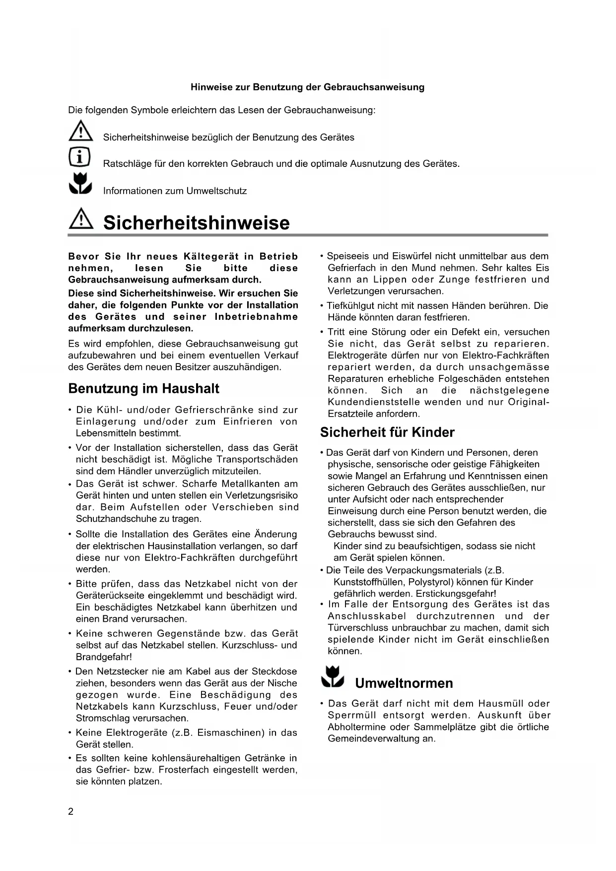 - Das Gerät darf nicht mit dem Hausmüll oder Sperrmüll entsorgt werden. Auskunft über Abholtermine oder Sammelplätze gibt die örtliche Gemeindeverwaltung an. Hinweise zur Benutzung der Gebrauchsanweisung Die folgenden Symbole erleichtern das Lesen der Gebrauchanweisung: Sicherheitshinweise bezüglich der Benutzung des Gerätes Ratschläge für den korrekten Gebrauch und die optimale Ausnutzung des Gerätes. Informationen zum UmweltschutzInhalt Sicherheitshinweise . . . . . . . . . . . . . . . . . . . . . . . . . . . . . . . . . . . . . . . . . . . . . . . . . . . . . . . . . . . . . . . . . . . . . .2 Entsorgung . . . . . . . . . . . . . . . . . . . . . . . . . . . . . . . . . . . . . . . . . . . . . . . . . . . . . . . . . . . . . . . . . . . . . . . . . . . . .3 Gebrauch Vor Inbetriebnahme / Inbetriebnhame . . . . . . . . . . . . . . . . . . . . . . . . . . . . . . . . . . . . . . . . . . . . . . . .3 Temperaturregelung / Kühlabteilausstattung / Tipps . . . . . . . . . . . . . . . . . . . . . . . . . . . . . . . . . . . . . . . . . . . . .4 Wartung Abtauen / Reinigung / Innenbeleuchtung . . . . . . . . . . . . . . . . . . . . . . . . . . . . . . . . . . . . . . . . . . . . . . .5 Wenn etwas nicht funktioniert / Kundendienst und Ersatzteile / Technische Angabe . . . . . . . . . . . . . . . .6 Türanschlagwechsel . . . . . . . . . . . . . . . . . . . . . . . . . . . . . . . . . . . . . . . . . . . . . . . . . . . . . . . . . . . . . . . . . . . . . .7 Installation Aufstellung . . . . . . . . . . . . . . . . . . . . . . . . . . . . . . . . . . . . . . . . . . . . . . . . . . . . . . . . . . . . . . . . . . .7 Elektrischer Anschluss . . . . . . . . . . . . . . . . . . . . . . . . . . . . . . . . . . . . . . . . . . . . . . . . . . . . . . . . . . . . . . . . . . .8 Einbau . . . . . . . . . . . . . . . . . . . . . . . . . . . . . . . . . . . . . . . . . . . . . . . . . . . . . . . . . . . . . . . . . . . . . . . . . . . . . . . . .8 Gerät ist eingeschaltet. Den Stillstand des Gerätes erhält man durch Drehen des Thermostatknopfes auf das Symbol «O». Inbetriebnahme