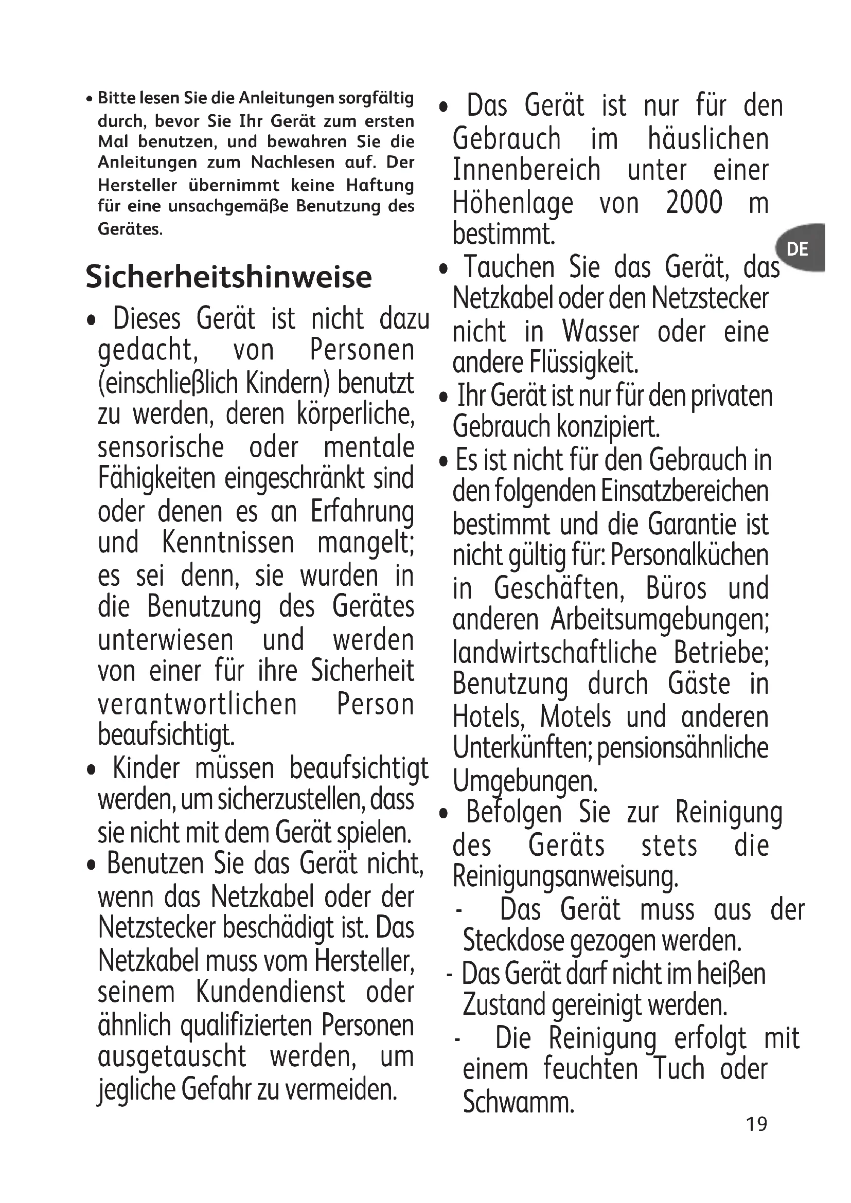 - Befolgen Sie zur Reinigung des Geräts stets die Reinigungsanweisung. - Das Gerät muss aus der Steckdose gezogen werden. - Das Gerät darf nicht im heißen Zustand gereinigt werden. - Die Reinigung erfolgt mit einem feuchten Tuch oder Schwamm. DE20 - Tauchen Sie das Gerät nicht in Wasser und stellen Sie es nicht unter laufendes Wasser.