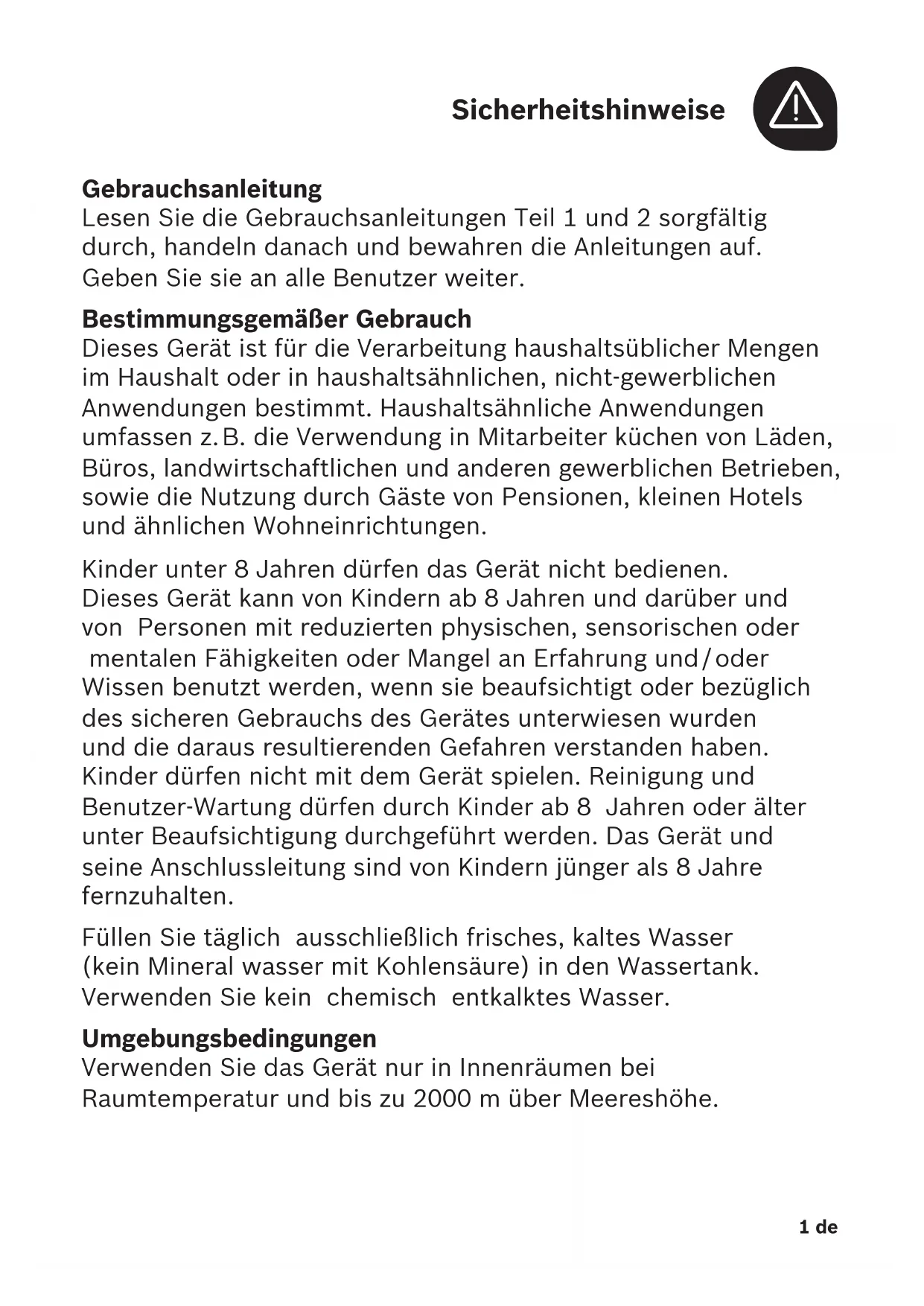 Gebrauchsanleitung Lesen Sie die Gebrauchsanleitungen Teil1 und 2 sorgfältig durch, handeln danach und bewahren die Anleitungen auf. Geben Sie sie an alle Benutzer weiter. Bestimmungsgemäßer Gebrauch Dieses Gerät ist für die Verarbeitung haushaltsüblicher Mengen im Haushalt oder in haushaltsähnlichen, nicht-gewerblichen Anwendungen bestimmt. Haushaltsähnliche Anwendungen umfassen z. B. die Verwendung in Mitarbeiter küchen von Läden, Büros, landwirtschaftlichen und anderen gewerblichen Betrieben, sowie die Nutzung durch Gäste von Pensionen, kleinen Hotels und ähnlichen Wohneinrichtungen. Kinder unter 8 Jahren dürfen das Gerät nicht bedienen. Dieses Gerät kann von Kindern ab 8 Jahren und darüber und von Personen mit reduzierten physischen, sensorischen oder mentalen Fähigkeiten oder Mangel an Erfahrung und / oder Wissen benutzt werden, wenn sie beaufsichtigt oder bezüglich des sicheren Gebrauchs des Gerätes unterwiesen wurden und die daraus resultierenden Gefahren verstanden haben. Kinder dürfen nicht mit dem Gerät spielen. Reinigung und Benutzer-Wartung dürfen durch Kinder ab 8 Jahren oder älter unter Beaufsichtigung durchgeführt werden. Das Gerät und seine Anschlussleitung sind von Kindern jünger als 8Jahre fernzuhalten. Füllen Sie täglich ausschließlich frisches, kaltes Wasser (keinMineral wasser mit Kohlensäure) in den Wassertank. Verwenden Sie kein chemisch entkalktes Wasser. Umgebungsbedingungen Verwenden Sie das Gerät nur in Innenräumen bei Raumtemperatur und bis zu 2000 m über Meereshöhe.2de Sicherheitshinweise