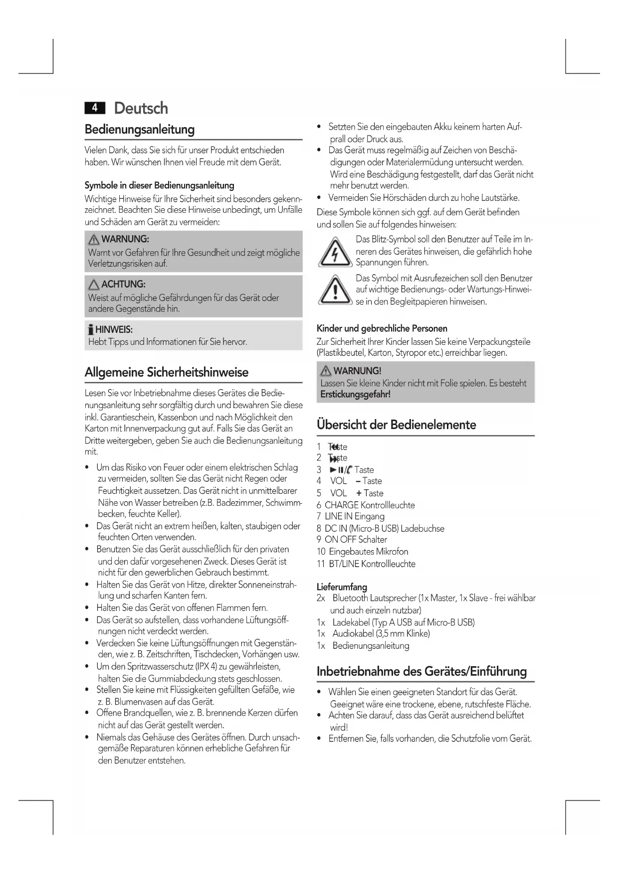 Taste 4 VOL – Taste 5 VOL + Taste 6 CHARGE Kontrollleuchte 7 LINE IN Eingang 8 DC IN (Micro-B USB) Ladebuchse 9 ON OFF Schalter 10 Eingebautes Mikrofon 11 BT/LINE Kontrollleuchte Lieferumfang 2x BluetoothLautsprecher(1xMaster,1xSlave-freiwählbar und auch einzeln nutzbar) 1x Ladekabel(TypAUSBaufMicro-BUSB) 1x Audiokabel(3,5mmKlinke) 1x Bedienungsanleitung Inbetriebnahme des Gerätes/Einführung