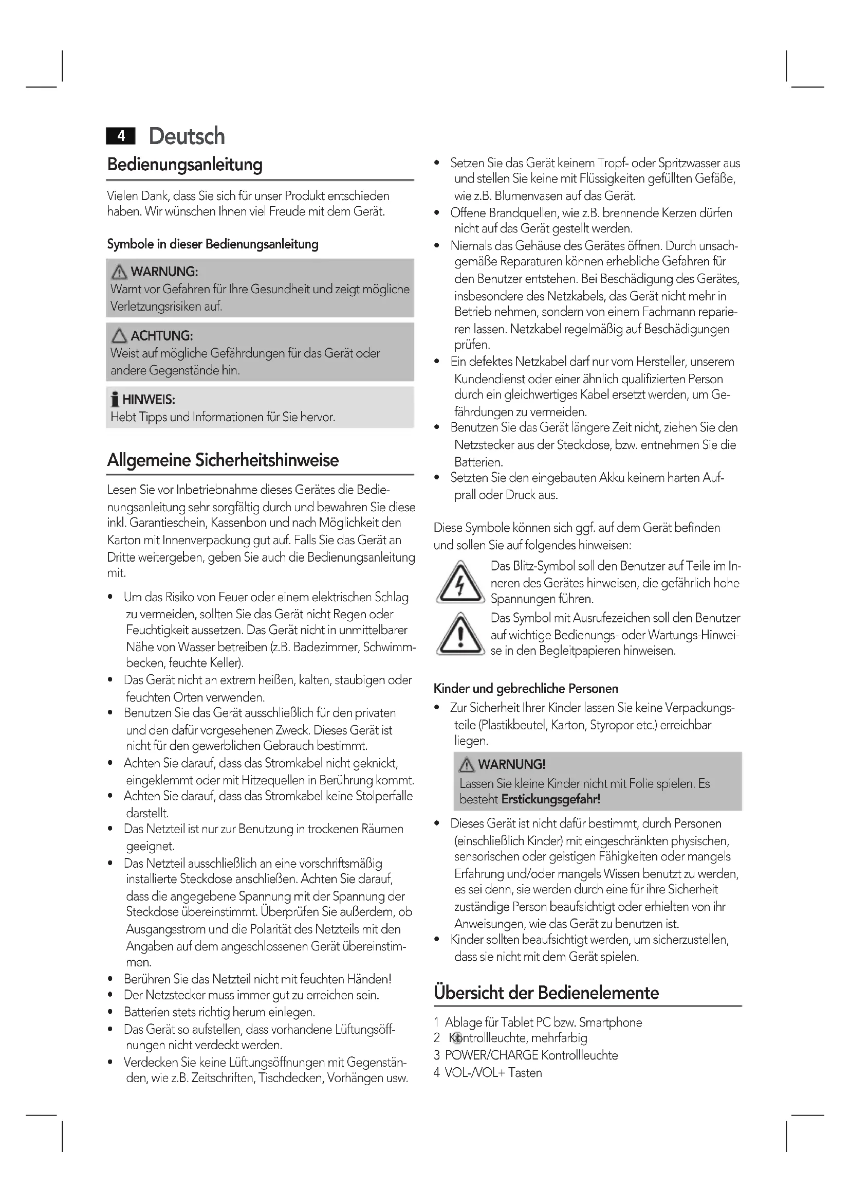 - Kindersolltenbeaufsichtigtwerden,umsicherzustellen, dass sie nicht mit dem Gerät spielen. Übersicht der Bedienelemente 1 Ablage für Tablet PC bzw. Smartphone 2 Kontrollleuchte, mehrfarbig 3 POWER/CHARGE Kontrollleuchte 4 VOL-/VOL+ TastenDeutsch