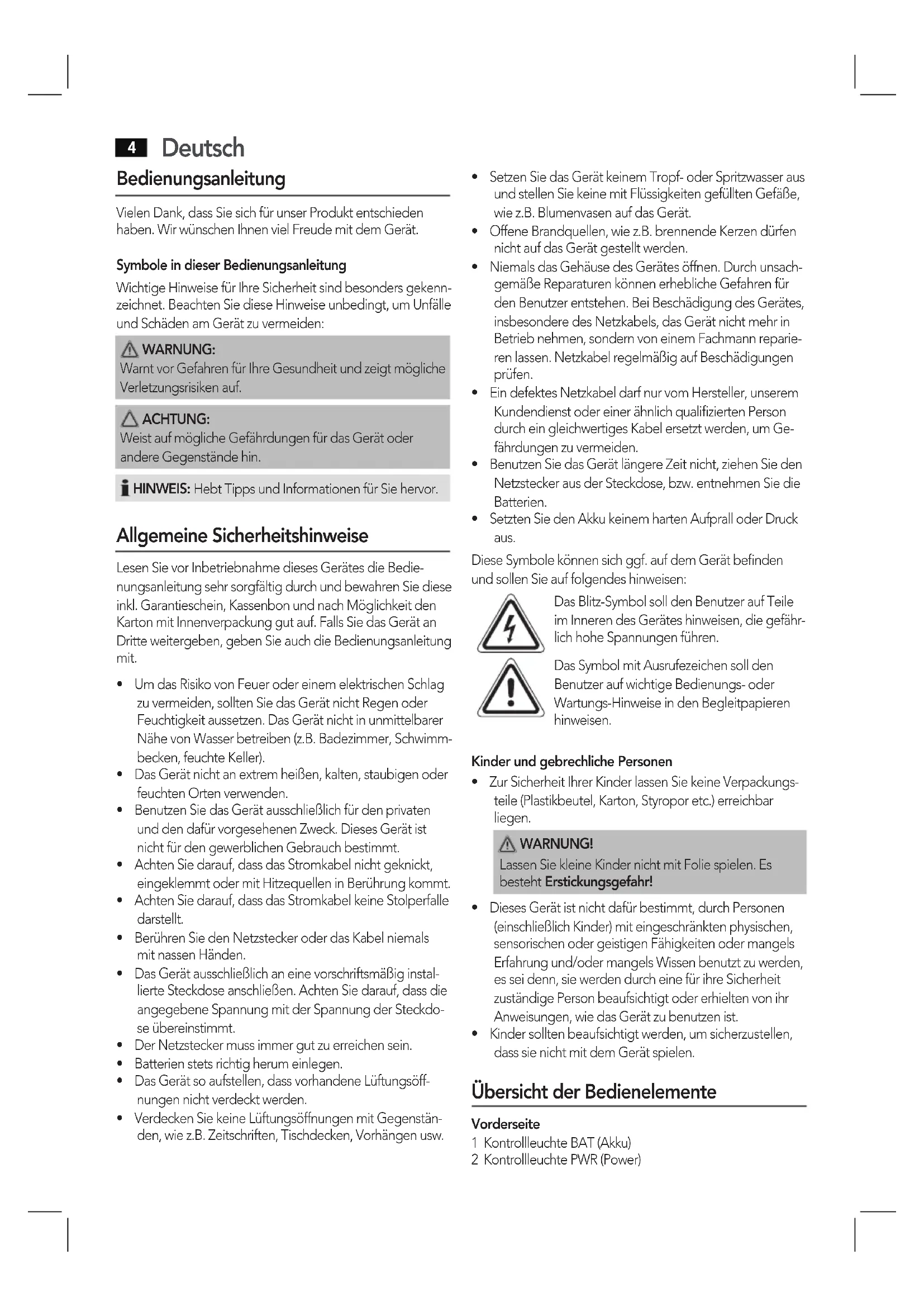 - Kindersolltenbeaufsichtigtwerden,umsicherzustellen, dass sie nicht mit dem Gerät spielen. Übersicht der Bedienelemente Vorderseite 1 Kontrollleuchte BAT (Akku) 2 Kontrollleuchte PWR (Power)Deutsch