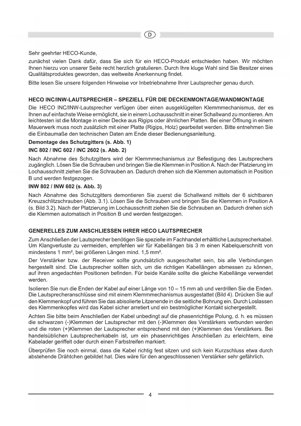 Abbildungen/Illustrations4 Sehr geehrter HECO-Kunde, zunächst vielen Dank dafür, dass Sie sich für ein HECO-Produkt entschieden haben. Wir möchten Ihnen hierzu von unserer Seite recht herzlich gratulieren. Durch Ihre kluge Wahl sind Sie Besitzer eines Qualitätsproduktes geworden, das weltweite Anerkennung findet. Bitte lesen Sie unsere folgenden Hinweise vor Inbetriebnahme Ihrer Lautsprecher genau durch. HECO INC/INW-LAUTSPRECHER – SPEZIELL FÜR DIE DECKENMONTAGE/WANDMONTAGE Die HECO INC/INW-Lautsprecher verfügen über einen ausgeklügelten Klemmmechanismus, der es Ihnen auf einfachste Weise ermöglicht, sie in einem Lochausschnitt in einer Schallwand zu montieren. Am leichtesten ist die Montage in einer Decke aus Rigips oder ähnlichen Platten. Bei einer Öffnung in einem Mauerwerk muss noch zusätzlich mit einer Platte (Rigips, Holz) gearbeitet werden. Bitte entnehmen Sie die Einbaumaße den technischen Daten am Ende dieser Bedienungsanleitung. Demontage des Schutzgitters (s. Abb. 1) INC 802 / INC 602 / INC 2602 (s. Abb. 2) Nach Abnahme des Schutzgitters wird der Klemmmechanismus zur Befestigung des Lautsprechers zugänglich. Lösen Sie die Schrauben und bringen Sie die Klemmen in Position A. Nach der Platzierung im Lochausschnitt ziehen Sie die Schrauben an. Dadurch drehen sich die Klemmen automatisch in Position B und werden festgezogen. INW 802 / INW 602 (s. Abb. 3) Nach Abnahme des Schutzgitters demontieren Sie zuerst die Schallwand mittels der 6 sichtbaren Kreuzschlitzschrauben (Abb. 3.1). Lösen Sie die Schrauben und bringen Sie die Klemmen in Position A (s. Bild 3.2). Nach der Platzierung im Lochausschnitt ziehen Sie die Schrauben an. Dadurch drehen sich die Klemmen automatisch in Position B und werden festgezogen.