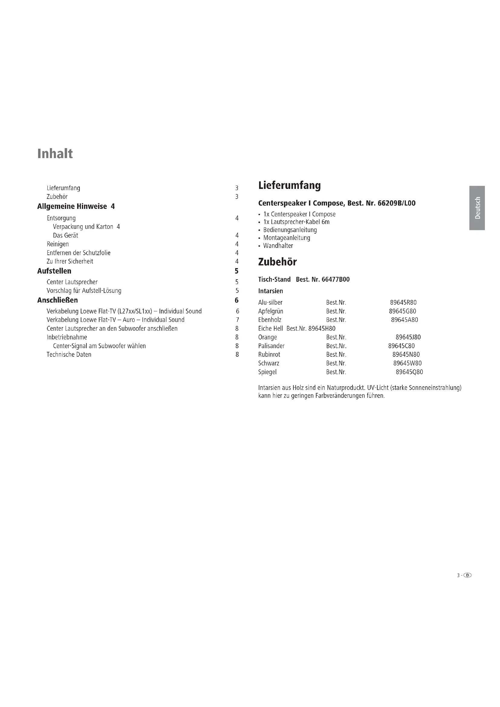 - Wandhalter Zubehör Tisch-Stand Best. Nr. 66477B00 Intarsien Alu-silber Best.Nr. 89645R80 Apfelgrün Best.Nr. 89645G80 Ebenholz Best.Nr. 89645A80 Eiche Hell Best.Nr. 89645H80 Orange Best.Nr. 89645J80 Palisander Best.Nr. 89645C80 Rubinrot Best.Nr. 89645N80 Schwarz Best.Nr. 89645W80 Spiegel Best.Nr. 89645Q80 Intarsien aus Holz sind ein Naturproduckt. UV-Licht (starke Sonneneinstrahlung) kann hier zu geringen Farbveränderungen führen. Inhalt Lieferumfang 3 Zubehör 3 Allgemeine Hinweise 4 Entsorgung 4 Verpackung und Karton 4 Das Gerät 4 Reinigen 4 Entfernen der Schutzfolie 4 Zu Ihrer Sicherheit 4 Aufstellen 5 Center Lautsprecher 5 Vorschlag für Aufstell-Lösung 5 Anschließen 6 Verkabelung Loewe Flat-TV (L27xx/SL1xx) – Individual Sound 6 Verkabelung Loewe Flat-TV – Auro – Individual Sound 7 Center Lautsprecher an den Subwoofer anschließen 8 Inbetriebnahme 8 Center-Signal am Subwoofer wählen 8 Technische Daten 8- 4 Deutsch Allgemeine Hinweise Entsorgung Verpackung und Karton Für die Entsorgung der Verpackung haben wir entsprechend den nationalen Ver- ordnungen ein Entgelt an beauftragte Verwerter entrichtet, die die Verpackung vom Fachhändler abholen. Dennoch empfehlen wir, den Originalkarton und das Verpackungsmaterial gut auf zu be wah ren, damit das Gerät im Bedarfsfall optimal geschützt transportiert werden kann. Das Gerät Achtung: Die EU-Richtlinie 2002/96/EG regelt die ordnungs- gemäße Rücknahme, Behandlung und Verwertung von ge- brauchten Elektronikgeräten. Elektronische Altgeräte müssen deshalb getrennt entsorgt wer- den. Werfen Sie dieses Gerät zur Entsorgung bitte nicht in den normalen Hausmüll! Sie können Ihr Altgerät kostenlos an aus- gewiesene Rücknahmestellen oder ggf. bei Ihrem Fachhändler abgeben, wenn Sie ein vergleichbares neues Gerät kaufen. Weitere Einzelheiten über die Rücknahme (auch für Nicht-EU Länder) erhalten Sie von Ihrer örtlichen Verwaltung. Reinigen Reinigen Sie Ihr Lautsprecher-System nur mit einem feuchten, weichen und sauberen Tuch (ohne jedes scharfe Reinigungsmittel). Entfernen der Schutzfolie Ziehen Sie die Schutzfolien auf den Intarsien langsam und vorsichtig ab. Zu Ihrer Sicherheit Zu Ihrer eigenen Sicherheit und um unnötigen Schaden von Ihrem Gerät abzu- wenden, lesen und beachten Sie die nachfolgenden Sicherheitshinweise: