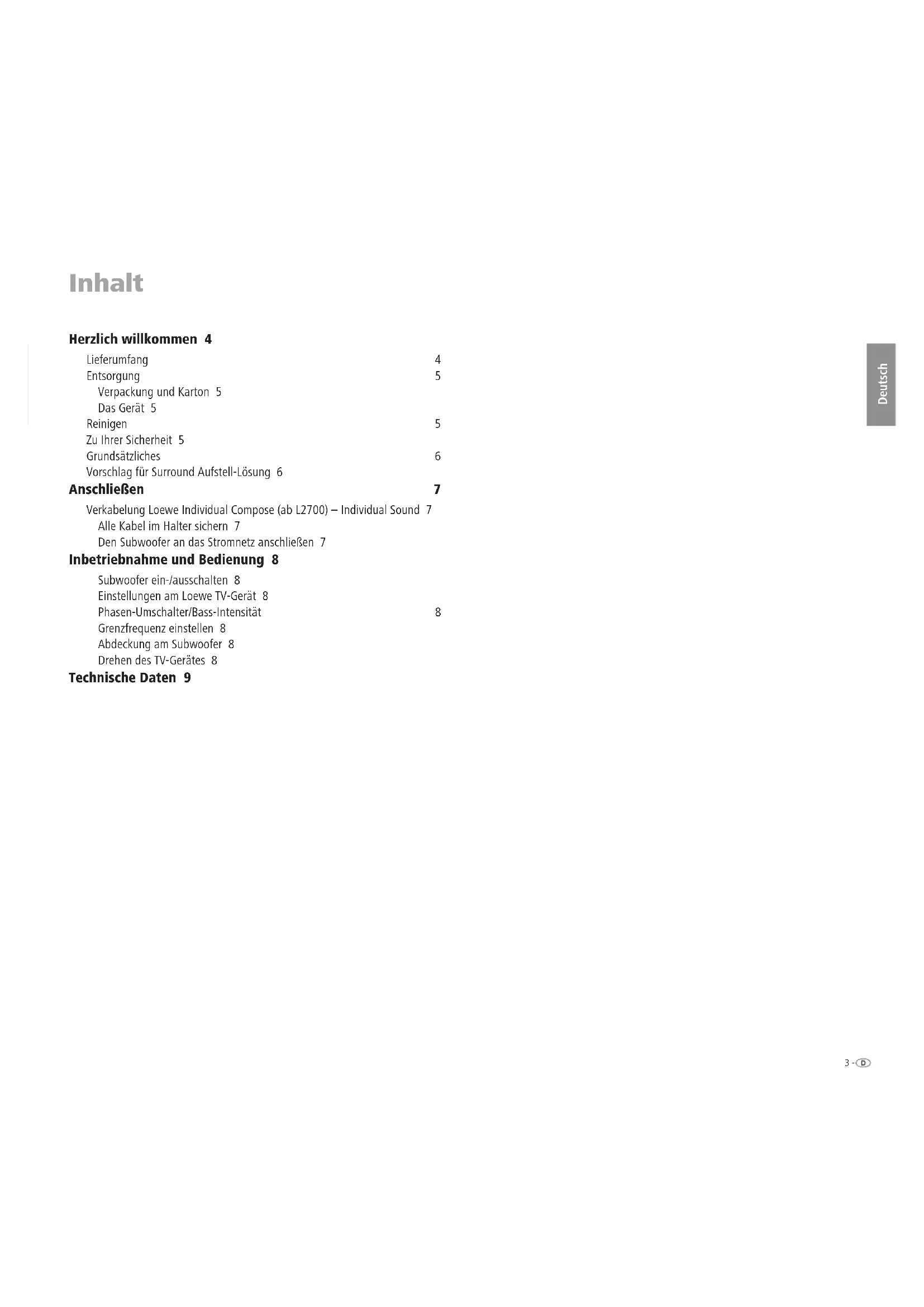 Anschluss-Klemmen für Lautsprecher (Stand/Satellit) Terminals for connecting speakers (stand/satellite) Bornes de raccordement pour haut-parleurs stand/satellites Morsetti per il collegamento di altoparlanti stand/satellitari Terminales de conexión para altavoces stand/satélites aansluitklemmen voor sprekers stand/satellietluid3 - Deutsch Inhalt Herzlich willkommen 4 Lieferumfang 4 Entsorgung 5 Verpackung und Karton 5 Das Gerät 5 Reinigen 5 Zu Ihrer Sicherheit 5 Grundsätzliches 6 Vorschlag für Surround Aufstell-Lösung 6 Anschließen 7 Verkabelung Loewe Individual Compose (ab L2700) – Individual Sound 7 Alle Kabel im Halter sichern 7 Den Subwoofer an das Stromnetz anschließen 7 Inbetriebnahme und Bedienung 8 Subwoofer ein-/ausschalten 8 Einstellungen am Loewe TV-Gerät 8 Phasen-Umschalter/Bass-Intensität 8 Grenzfrequenz einstellen 8 Abdeckung am Subwoofer 8 Drehen des TV-Gerätes 8 Technische Daten 9- 4 Deutsch Herzlich willkommen Vielen Dank, dass Sie sich für ein Loewe Produkt entschieden haben. Wir freuen uns, Sie als Kunden gewonnen zu haben. Mit Loewe verbinden wir höchste Ansprüche an Technik, Design und Bediener- freundlichkeit. Dies gilt für TV, DVD, Video, Audio und Zubehör glei cher ma ßen. Dabei sollen weder die Technik noch das Design einen Selbstzweck erfüllen, sondern unseren Kunden einen höchstmöglichen Seh- und Hörgenuss ver mit teln. Auch beim Design haben wir uns nicht von kurzfristigen, modischen Trends leiten lassen. Denn schließlich haben Sie ein hochqualitatives Gerät erworben, an dem Sie sich auch morgen und übermorgen nicht satt sehen sollen. Das Individual Sound Lautsprecher-System ist abgestimmt auf Loewe Flat TV- Geräte. Das Lautsprechersystem ist dabei individuell ausbaubar von einer einfachen Stereo Kombination über eine Variante mit vier Satelliten-Lautsprechern und Centerlautsprecher bis hin zur hochwertigsten Lösung mit vier Standlautspre- chern. Mit dabei ist jeweils der Subwoofer mit integriertem Verstärker. Sie können so DVDs in Dolby Digital Kinoqualität wiedergeben. Sie können aber auch Stereo-Sendungen oder Stereo-Wiedergaben (vom Videorecorder oder DVD Player) in Dolby ProLogic, bzw. Virtual oder Circle Surround in ein quasi 5.1 Surround-Signal umwandeln und mit dem Individual Sound Lautsprecher-System wiedergeben. Ist Ihr TV-Gerät (ab Chassis L2700) mit einem digitalen Tuner (DVB) ausgerüstet, wird das empfangene digitale Surround-Signal decodiert und über die Individual Sound-Anlage wiedergegeben. Die Individual Sound Lautsprecheranlage schaltet sich automatisch mit dem Loewe Flat TV-Gerät ein und aus. Die Einstellungen für Dolby Digital nehmen Sie komfortabel über die Menüs des Loewe Flat TV-Gerätes vor. Lieferumfang Center Floor Stand I Compose, Best. Nr. 67207B/L00 Center Floor Stand I Compose Lautsprecher-Kabel (6m) Gewebeschlauch Halter für Gewebeschlauch Bedienungsanleitung Montageanleitung