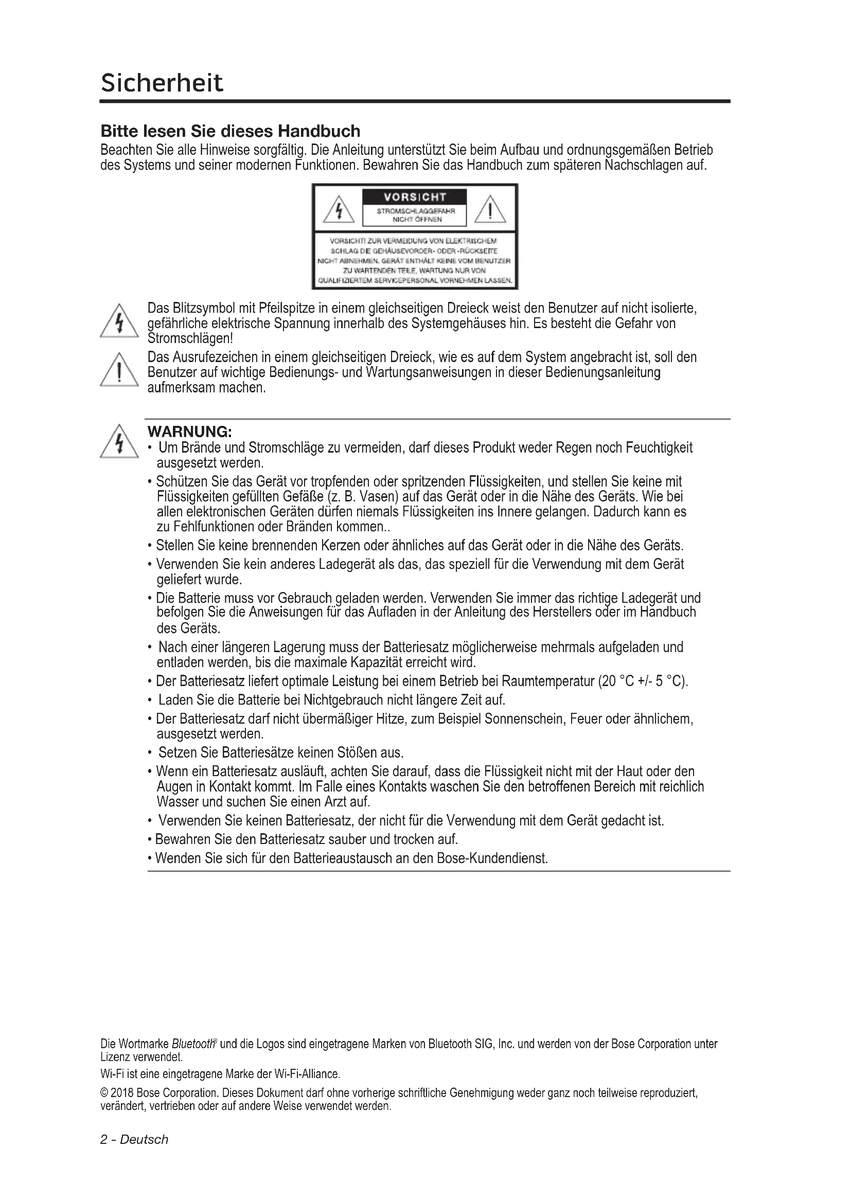 und die Logos sind eingetragene Marken von Bluetooth SIG, Inc. und werden von der Bose Corporation unter Lizenz verwendet. Wi-Fi ist eine eingetragene Marke der Wi-Fi-Alliance. © 2018 Bose Corporation. Dieses Dokument darf ohne vorherige schriftliche Genehmigung weder ganz noch teilweise reproduziert, verändert, vertrieben oder auf andere Weise verwendet werden.Deutsch - 3 Sicherheit WARNUNG: Dieses Produkt enthält magnetische Materialien. Bitte wenden Sie sich an Ihren Arzt, wennSiewissenmöchten,obdiesdenBetriebIhresimplantiertenmedizinischenGerätsbeeinussenkann. ACHTUNG: Nehmen Sie keine Veränderungen am System oder am Zubehör vor. Nicht autorisierte Veränderungen können die Sicherheit, die Erfüllung von Richtlinien und die Systemleistung beeinträchtigen. HINWEISE: